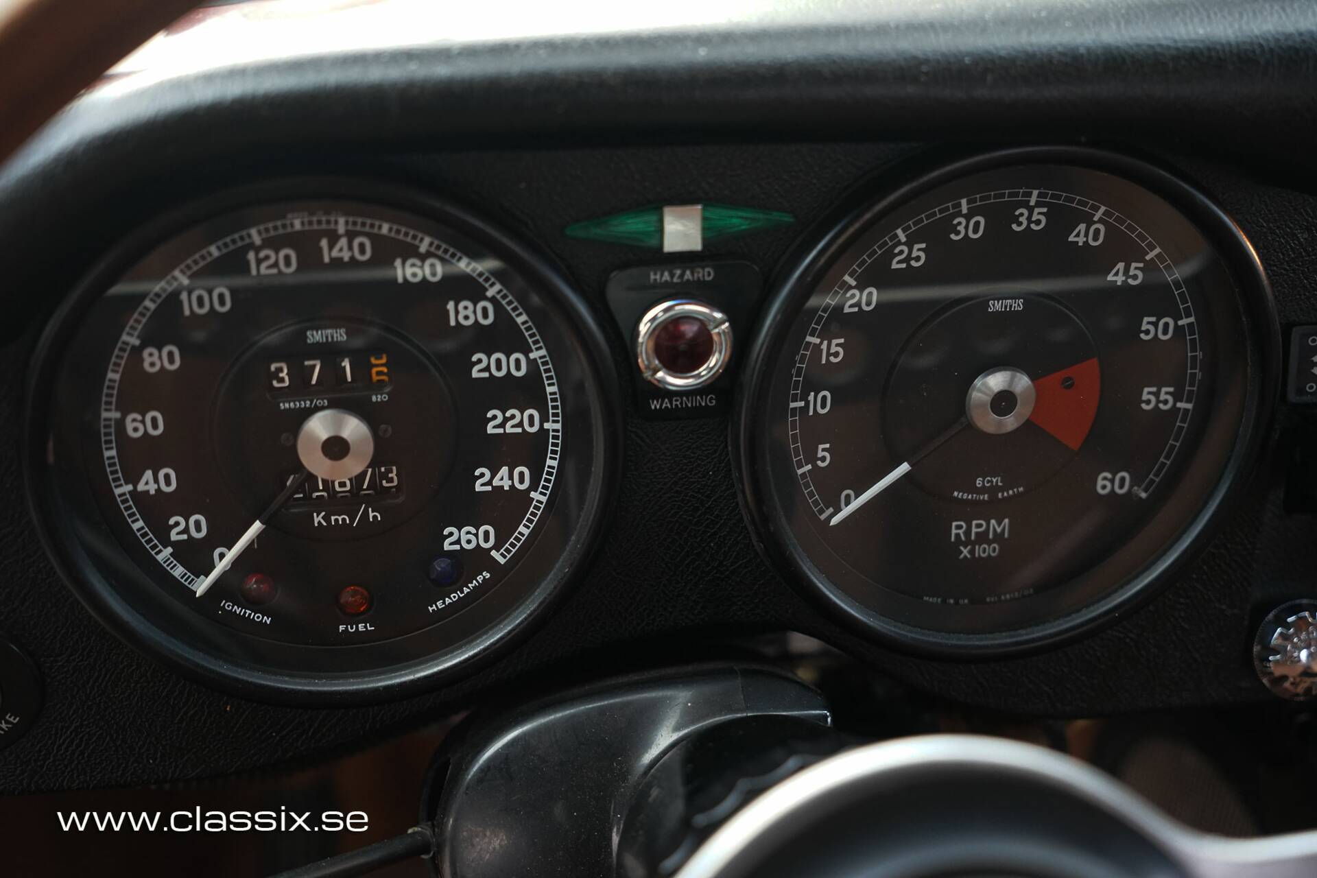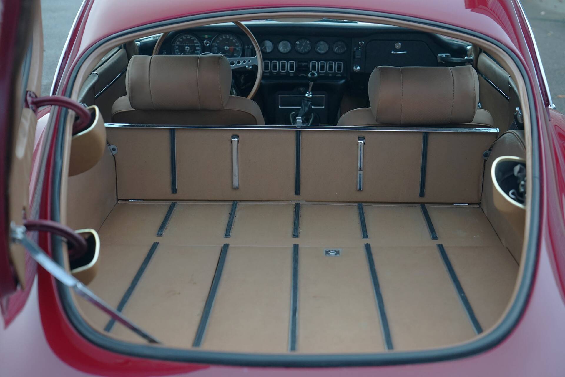 Interior: Opening the door to the Jaguar E-Type Series 2 Coupe, you’re greeted by probably my personal favorite interior color in an E-Type: cinnamon. It’s the perfect tone of brown and pairs beautifully with the dark red exterior. This is also the original interior color according to the car’s certificate. The interior is in excellent condition, with a super fit and finish on every panel. All the materials appear as they did when the car left the factory. The seats have been excellently reupholstered at some point, the carpets are superb, and the headliner is spotless. Being a Series 2 FHC, you really sit well in it. You have a more adjustable seat compared to the early cars, as well as headrests. Everything inside the car functions perfectly as it should.