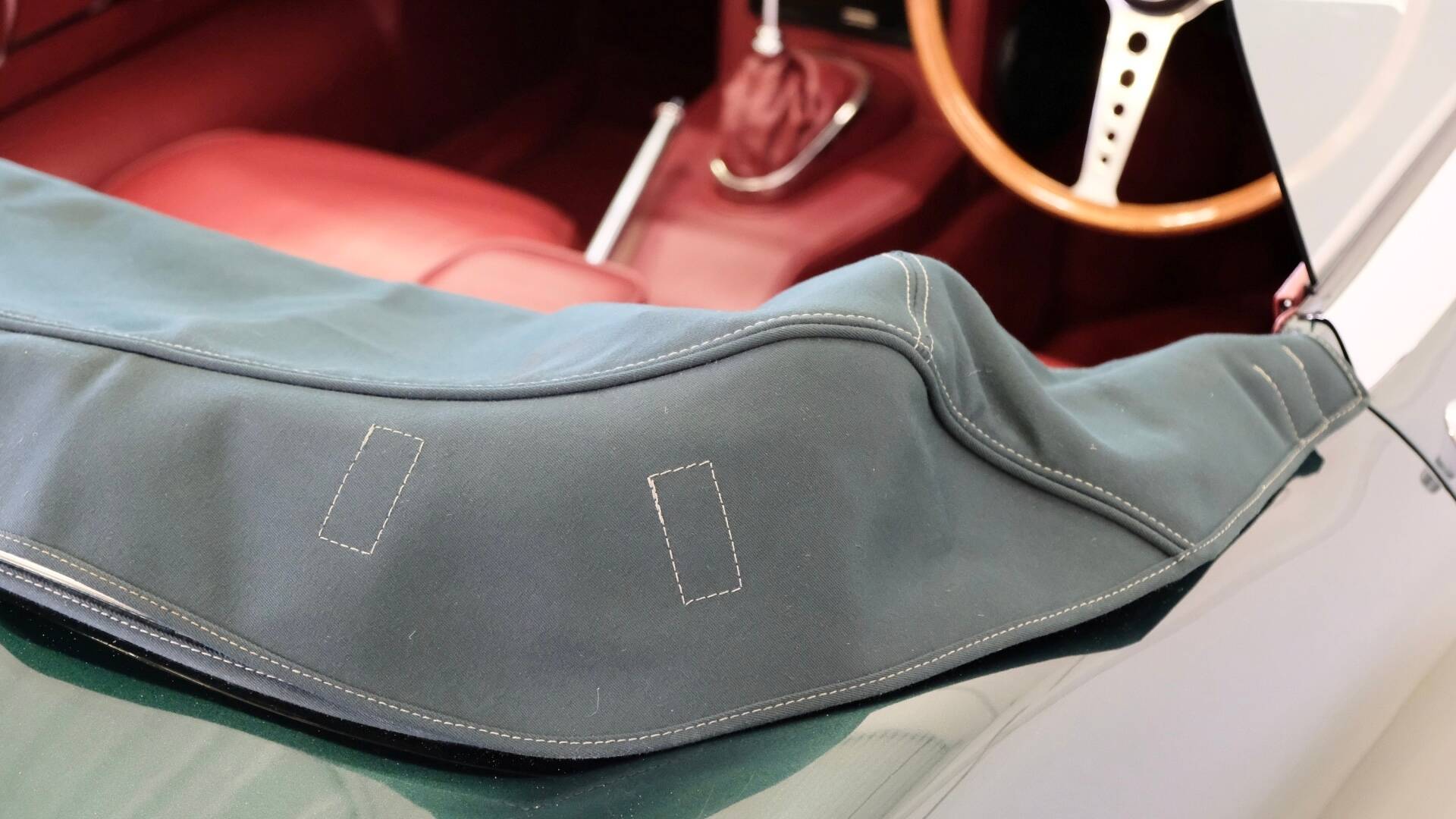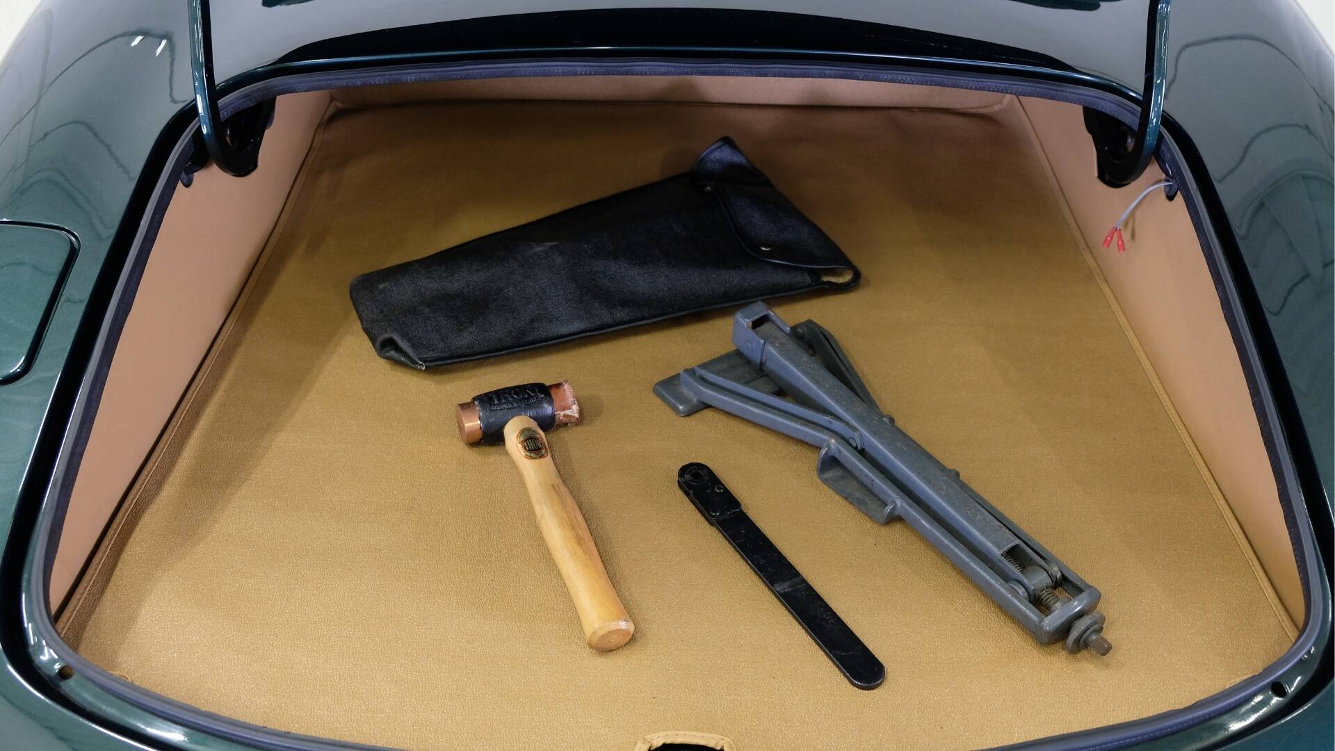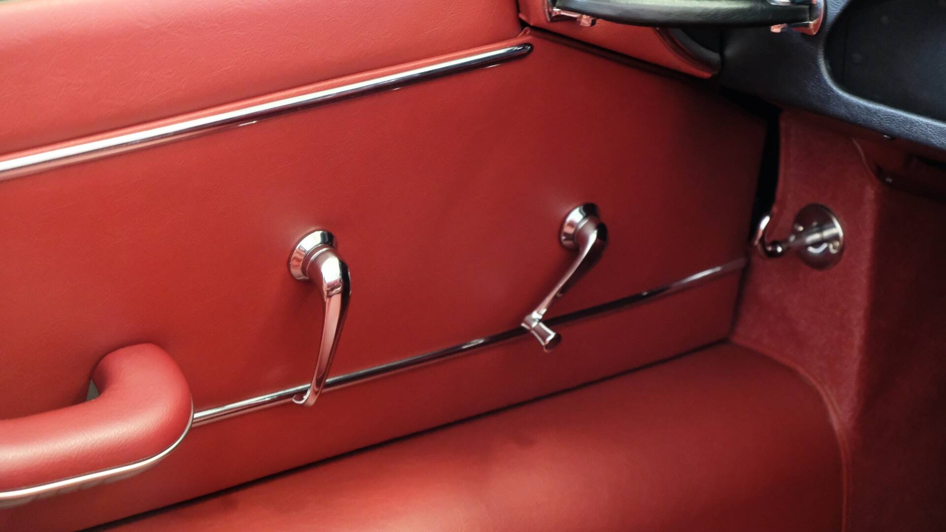 The interior was trimmed in red, including the seats, door cards and carpets, all executed using high-grade leather and carpeting. The dashboard and all gauges were fully refurbished. To complement the exterior colour, a new green mohair hood and matching tonneau cover were fitted. Fifteen-inch chrome wire wheels complete the exterior, and to accommodate the wider wheels and tyres, the inner edges of the wheel arch seams were carefully flattened to prevent tyre scrub. For improved safety, more modern seat belts have also been discreetly installed.
