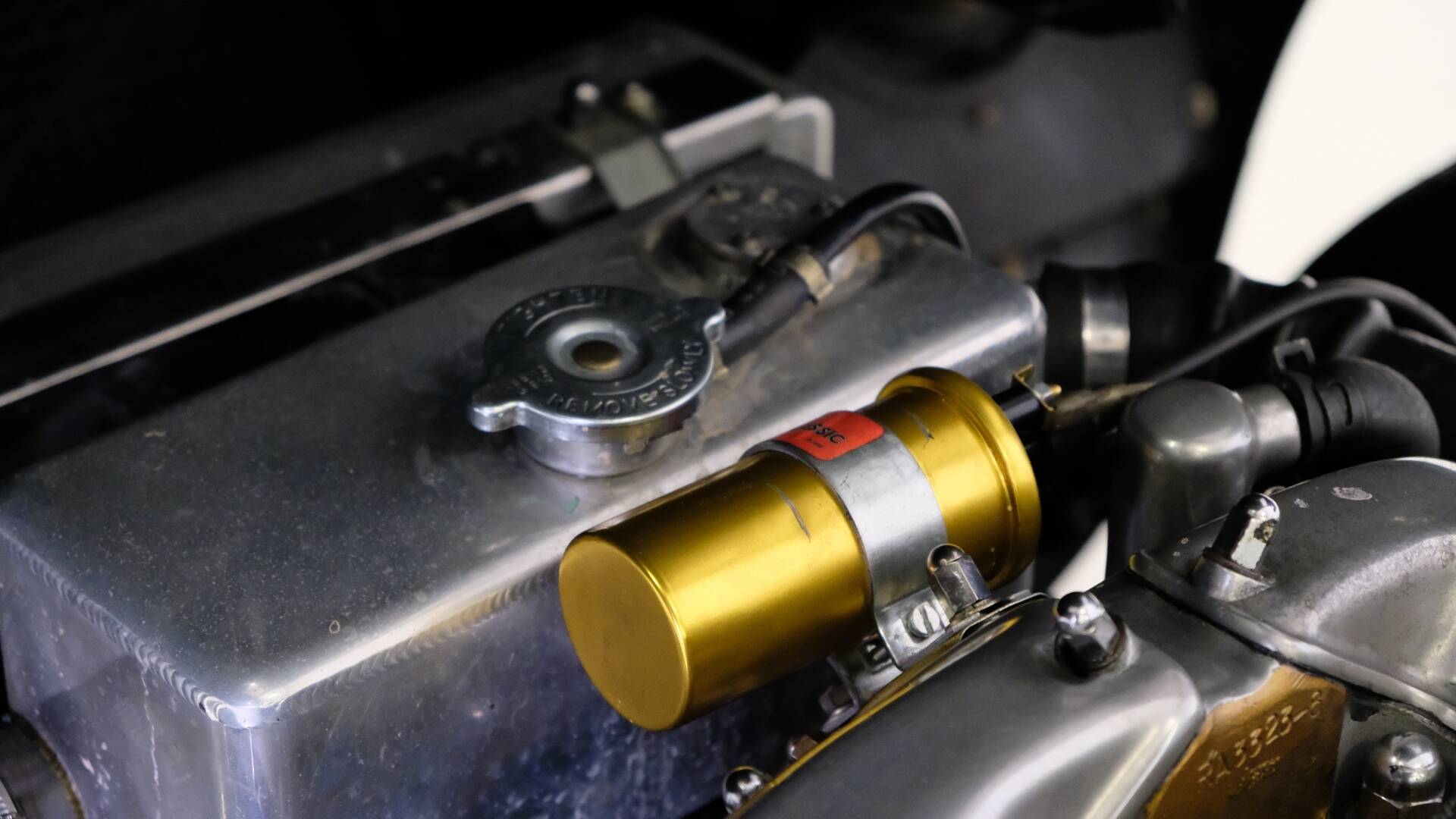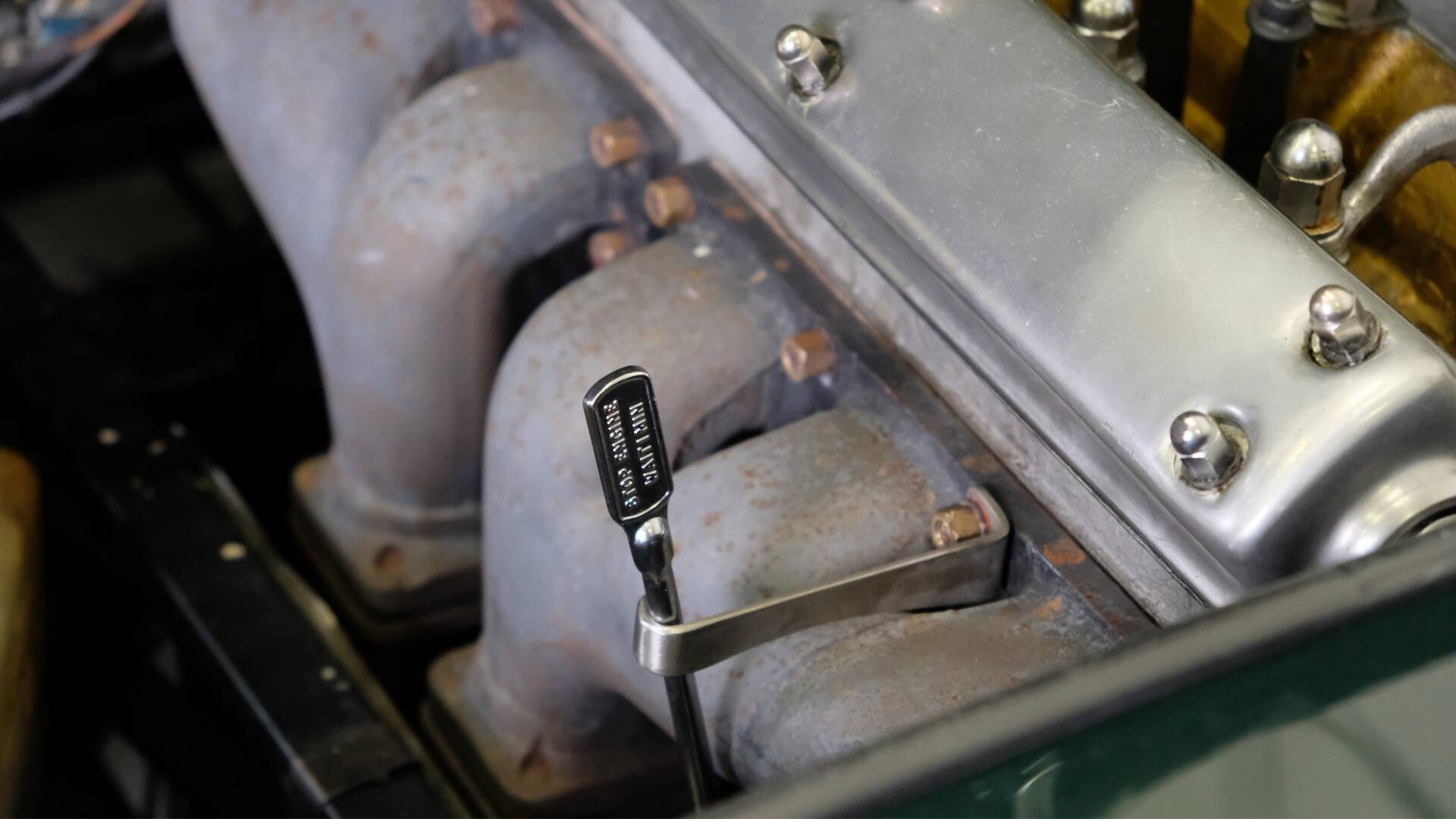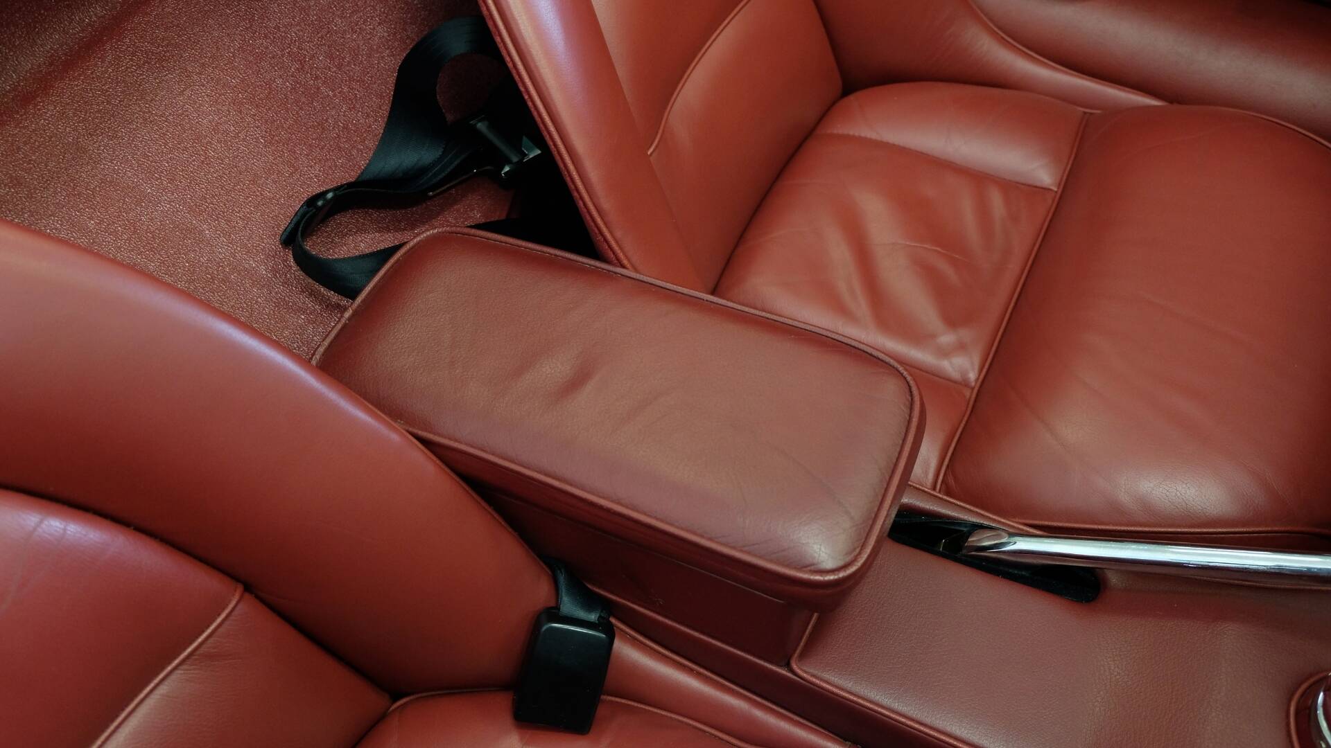The interior was trimmed in red, including the seats, door cards and carpets, all executed using high-grade leather and carpeting. The dashboard and all gauges were fully refurbished. To complement the exterior colour, a new green mohair hood and matching tonneau cover were fitted. Fifteen-inch chrome wire wheels complete the exterior, and to accommodate the wider wheels and tyres, the inner edges of the wheel arch seams were carefully flattened to prevent tyre scrub. For improved safety, more modern seat belts have also been discreetly installed.