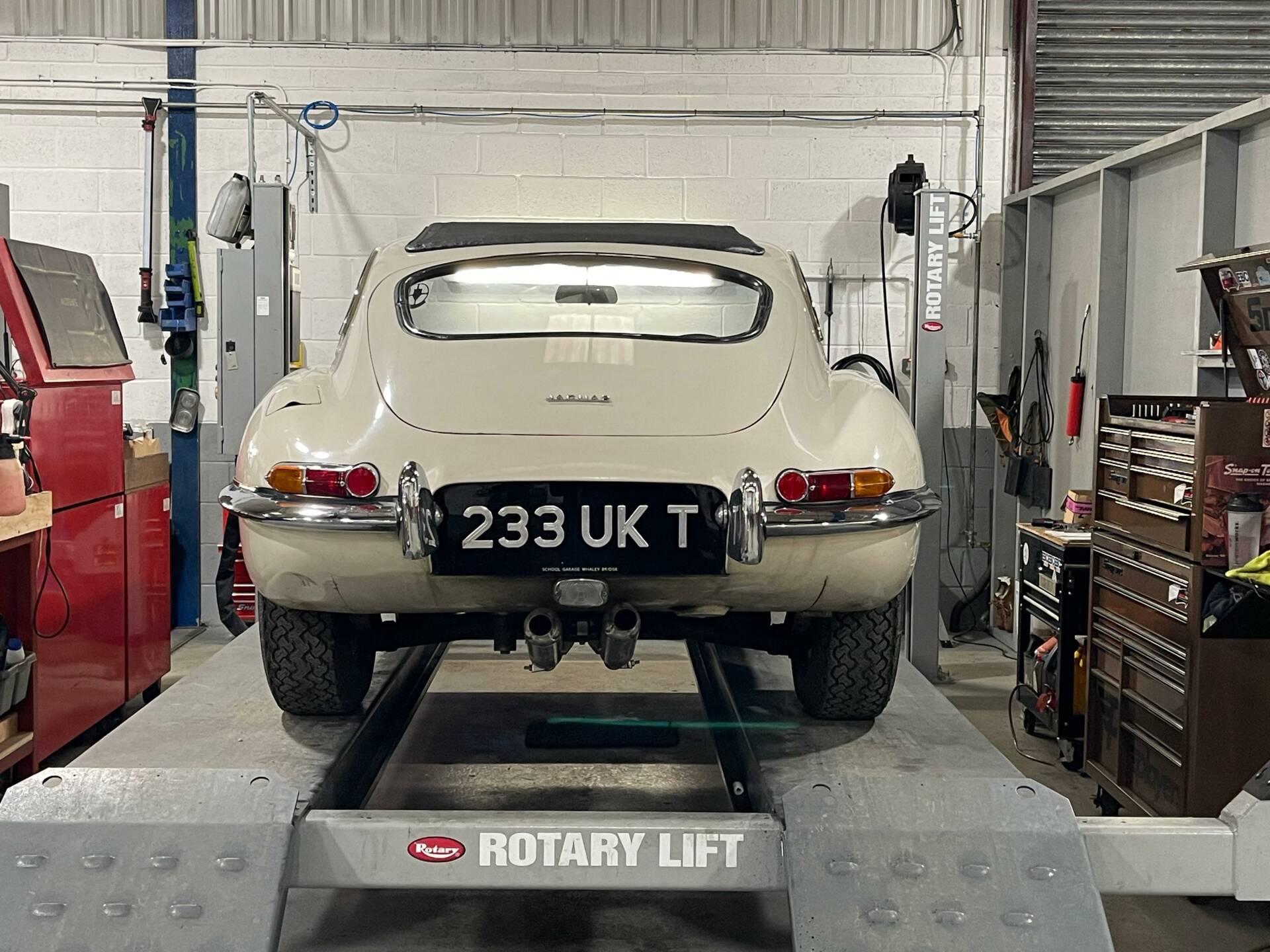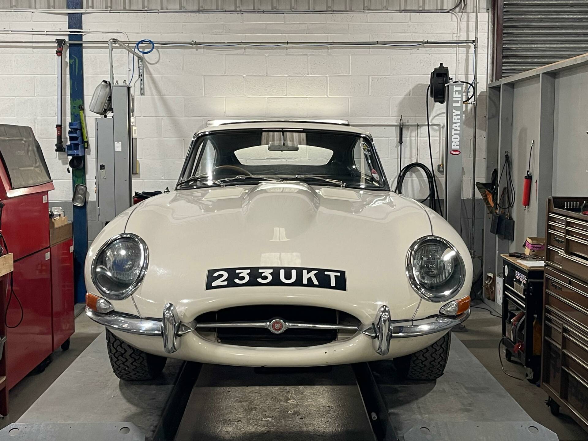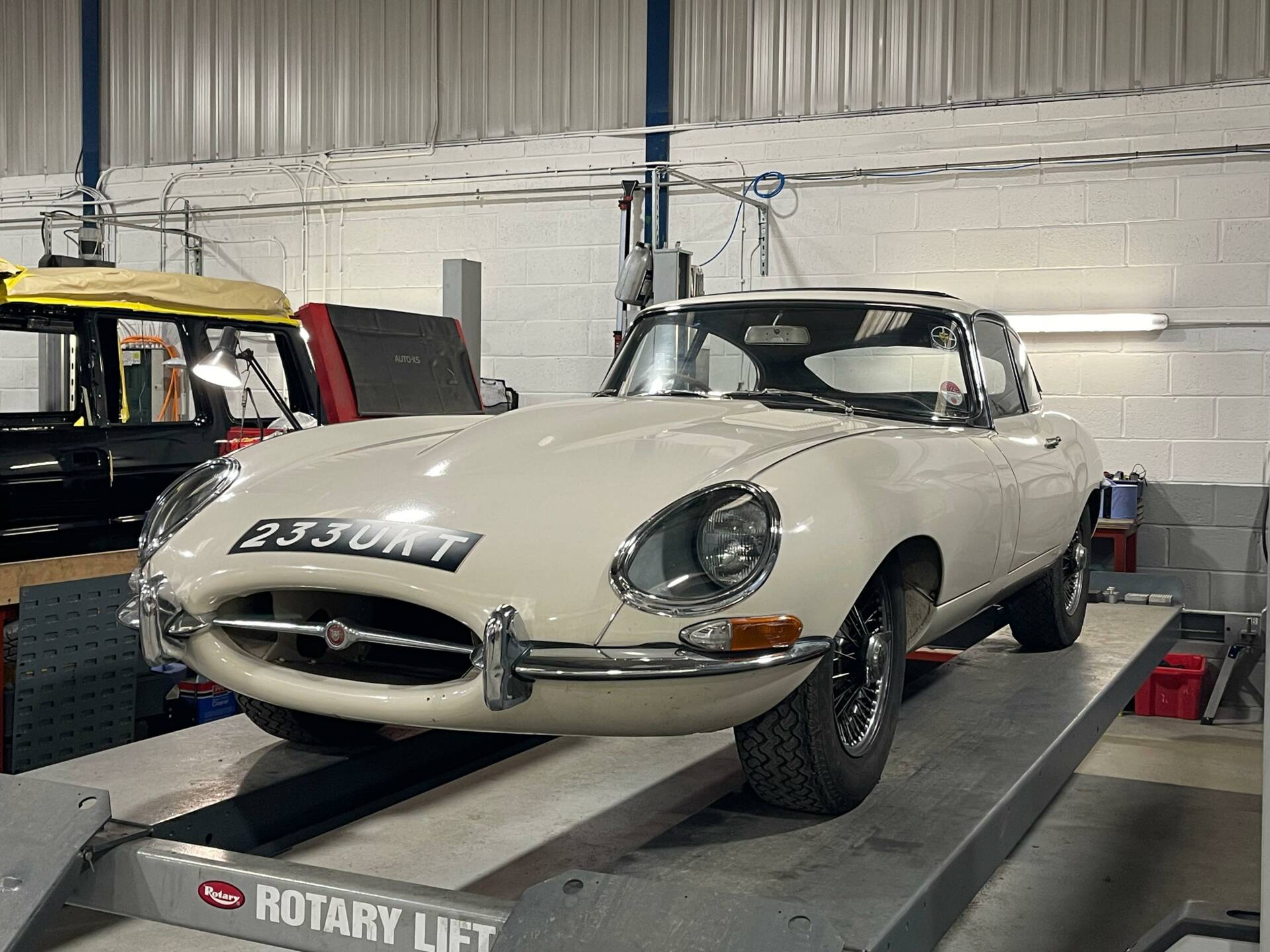 This U.K. Home Market RHD Jaguar E-Type is a matching numbers car that has spent the past 25 years with one owner. 233 UKT comes with a superb history with service and maintenance history dating back to 1971 and a photo album documenting a bare shell rebuild that was carried out during the 1980’s. Photos show the car fully taken back to bare metal and completely rebuilt to a show standard level. Finished in Old English White with Black leather upholstery and period webasto sunroof, this very honest, now older restoration is a car that can be a described as a good, strong and solid example that can be improved cosmetically if desired, or kept exactly as it is and driven and used on a regular basis. The E-Type was driven regularly during the 1990's and came into the hands of the most recent owner in 2001. The late Quentin Willson had tried to purchase the E-Type but missed out having gone away to think about the purchase. A copy of the newspaper article where Quentin tells the story comes with the car too. Due to the long term owner living overseas, the car had very little use in the early 2000's but even over this past ten years or so the car has covered few miles. It has however been regularly serviced and was being MOT tested most years up to 2020. The most recent service was carried out in September 2025 when over £2000 was spent on a new battery, rebuilt front brake calipers, brake master cylinders and a couple of brake hoses. Within the past 500 miles the E-Type has also had a new header tank, bottom radiator hose, plug leads, distributor assembly and ball joint gaiters.