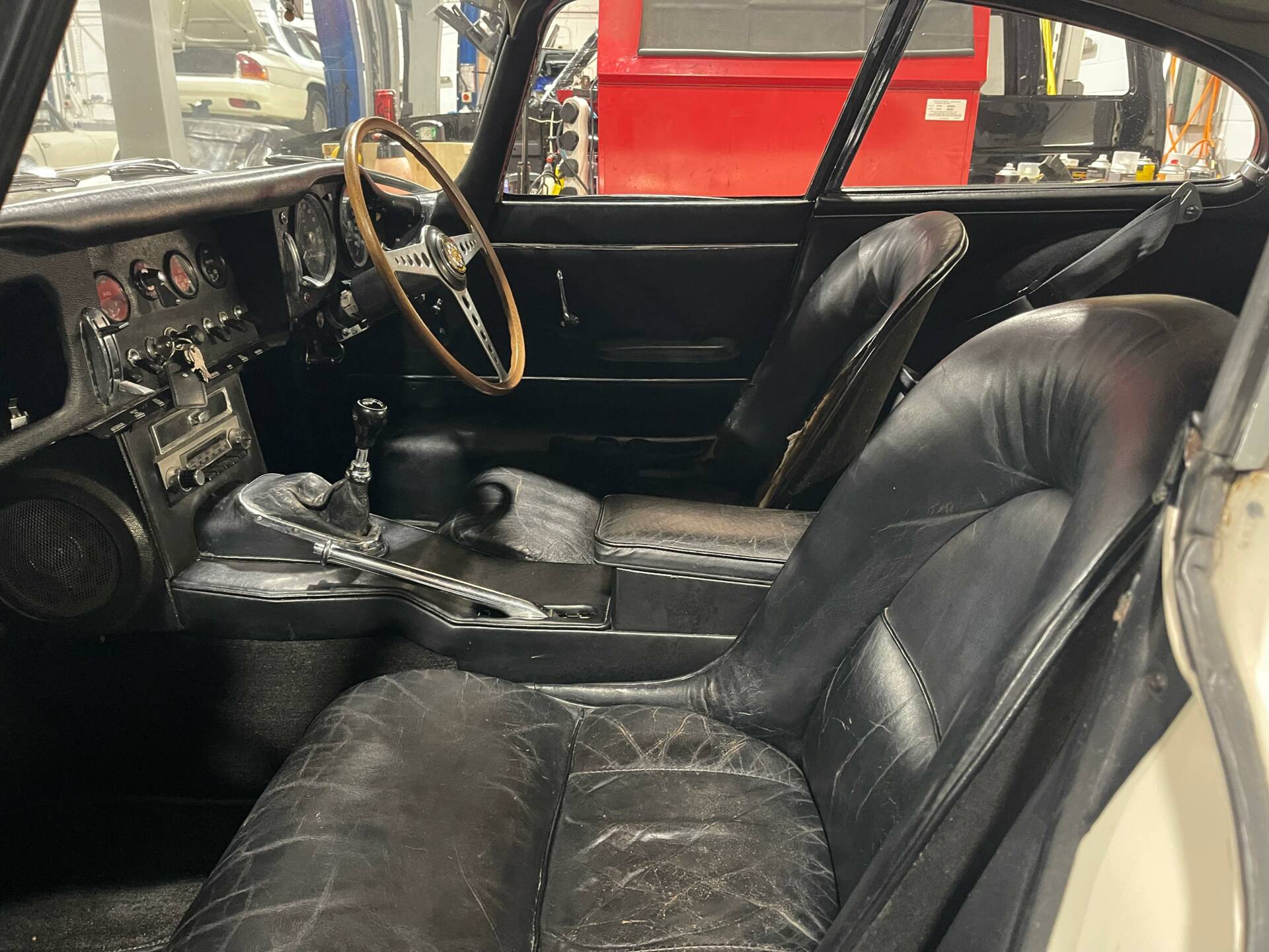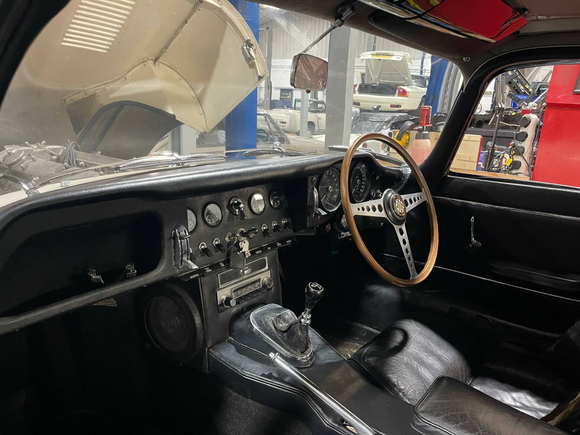 233 UKT presents as an older restoration and has the feel of a very honest original car. The underside is solid with excellent floor pans, and the bodywork in general is very good with nice closing doors and no major corrosion issues. The paintwork has lightly microblistered but is perfectly acceptable as it is. If looking for a show finish, the car would need to be fully re-painted but this isn't that type of car, this is a car to either drive and enjoy, or further improve over time as it offers a great base. The interior is in fairly good order although the drivers seats requires work, this is something we'd be happy to attend too. The wire wheels are past their best and the engine bay slightly scruffy but again, they can be improved. The original 3.8 engine is strong and healthy with good oil pressure and compressions, the gearbox is lovely to use and with a major service and light re-commissioning the E-Type will be ready for some serious driving.