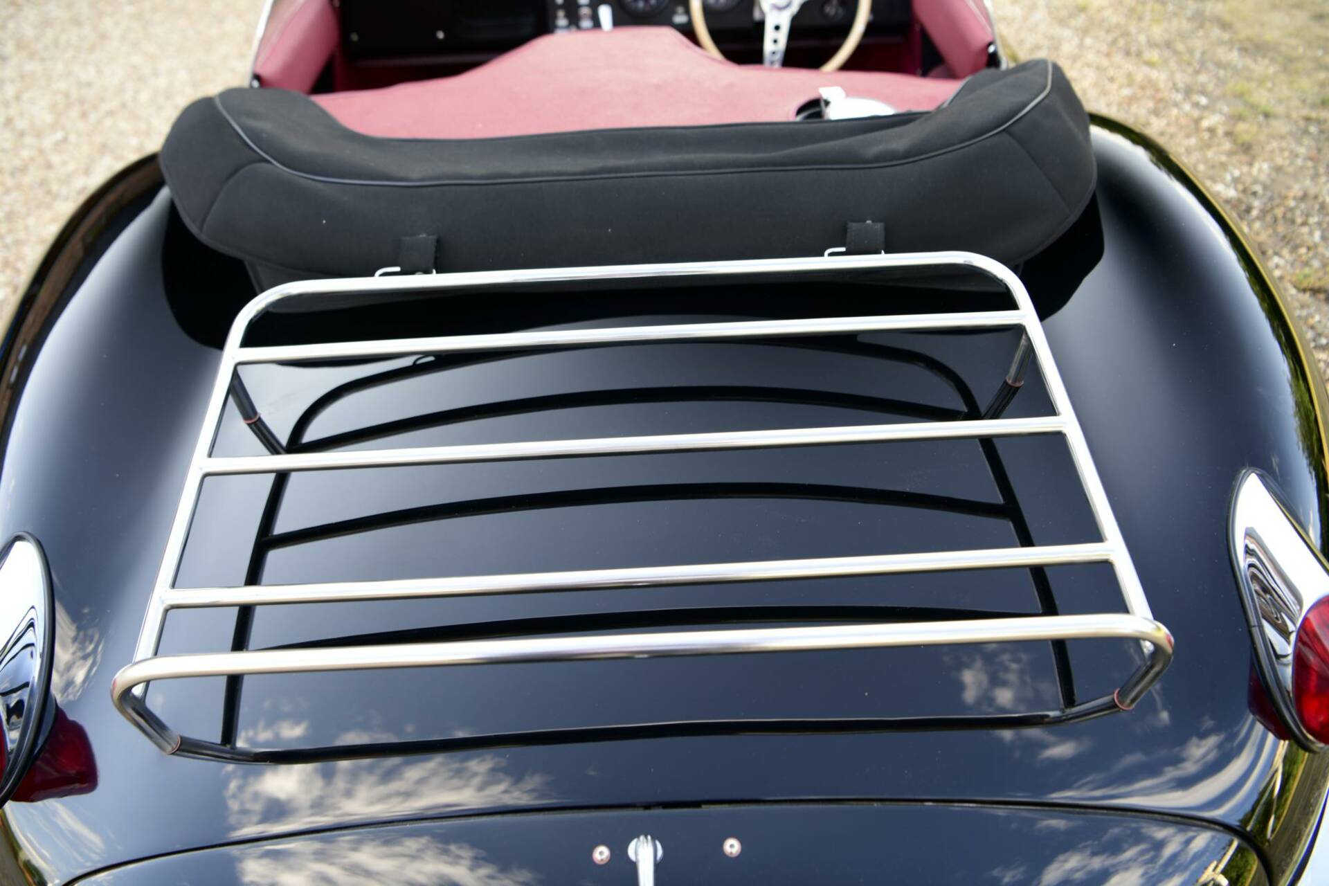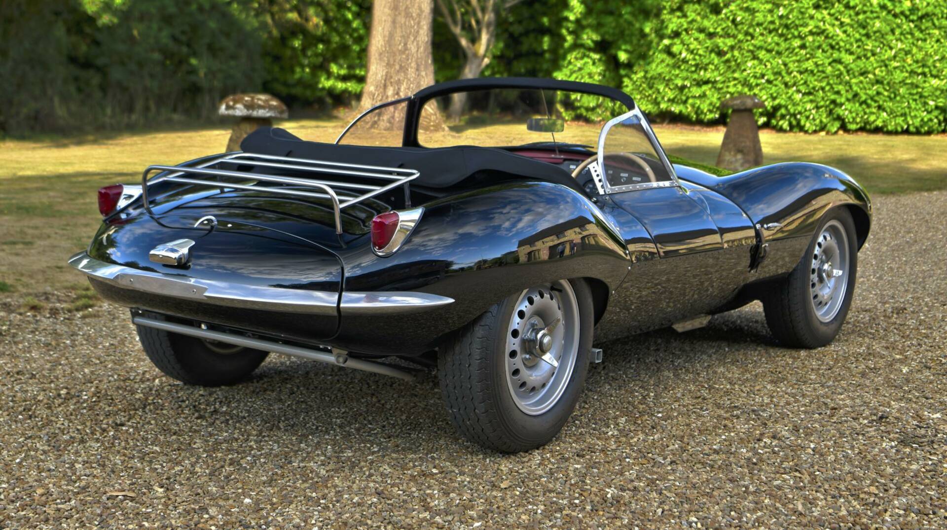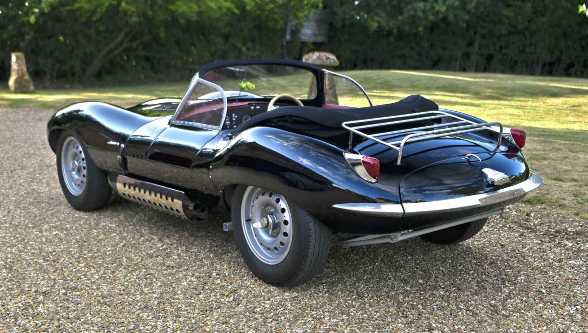 Following Jaguar’s withdrawal from racing after the 1956 season, a number of both completed and incomplete D-Types remained in factory stock and unsold. The decision was made to convert these cars to road-going specification, for sale to enthusiasts, many of whom were in the States. The distinctive D-Type bodywork was modified with the removal of the divider between the seats and the large tail fin, followed by the addition of a passenger door, a full-width windscreen with a chromed frame, side screens in both driver and passenger doors and chromed quarter-bumpers. A simple folding mohair hood and side screens provided weather protection and a luggage rack was provided on the tail. Otherwise, the XKSS was a D-Type, barely, slightly tamed—a wolf that had no interest in dressing as a sheep.