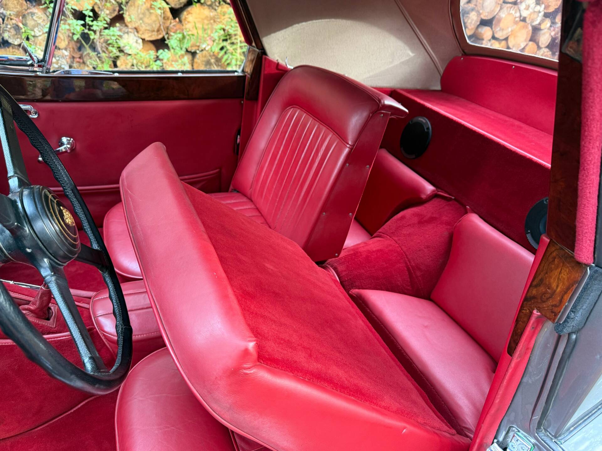 Die Kombination aus grauer Außenlackierung, schwarzem Verdeck und rotem Lederinterieur mit klassischem Holzarmaturenbrett verleiht dem Fahrzeug eine zeitlose und zugleich sehr selten anzutreffende Ausstrahlung.