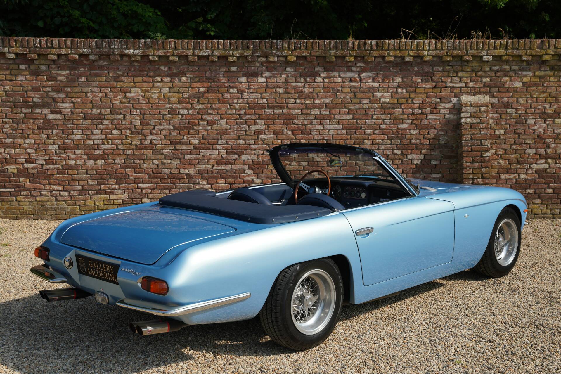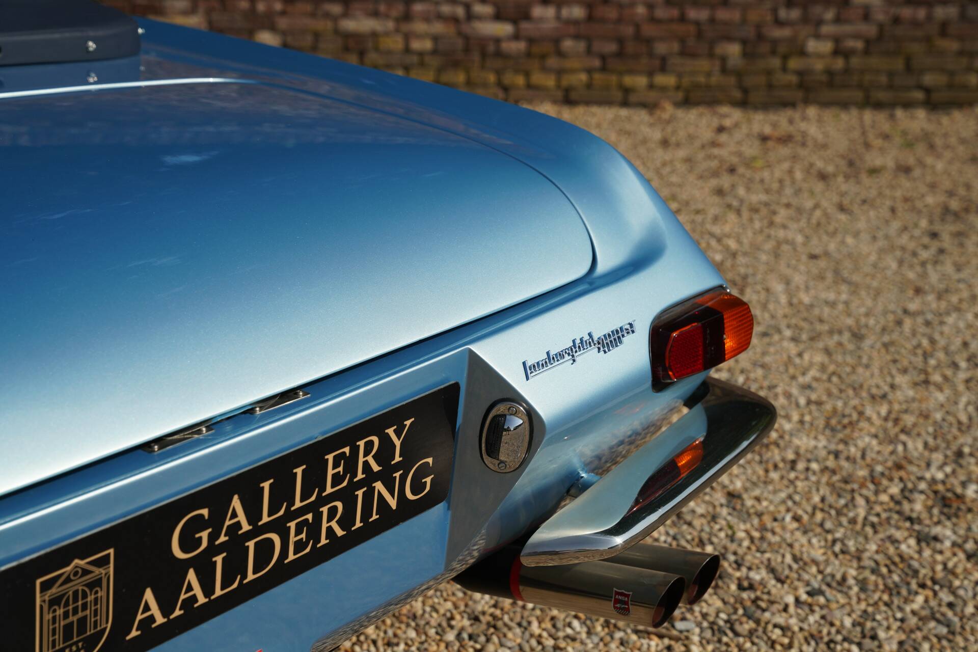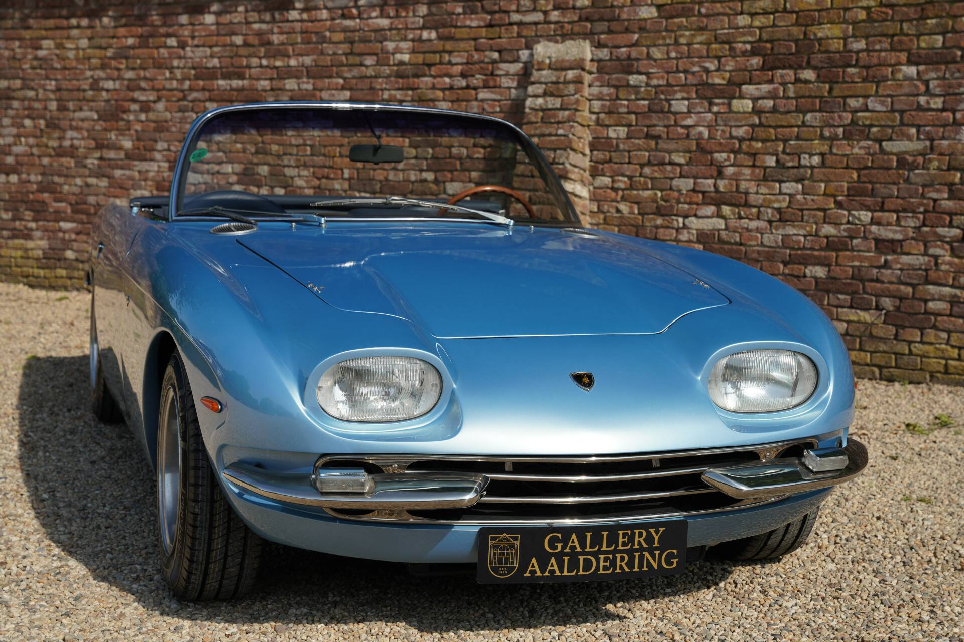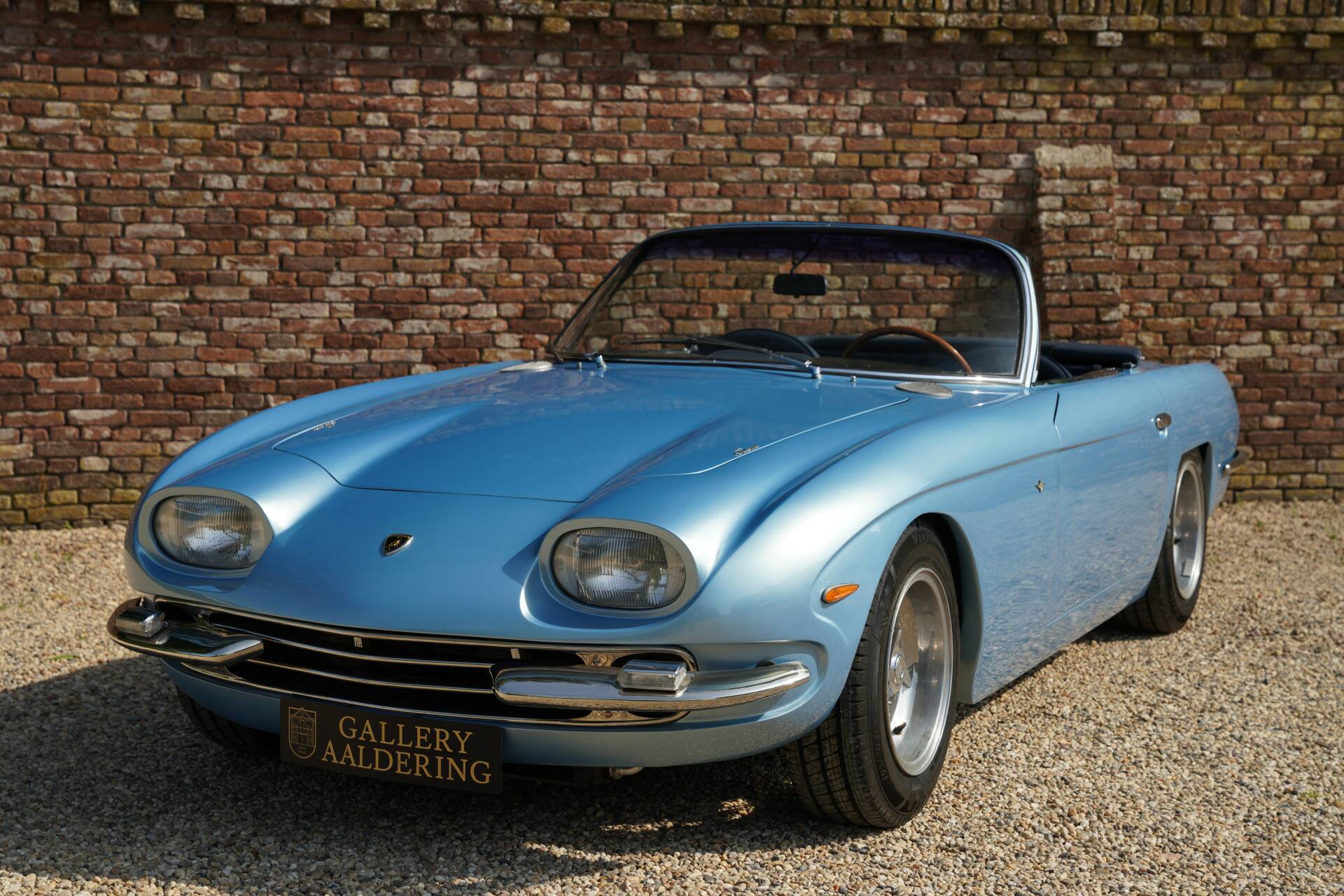 Lamborghini 400 GT Spyder "Conversion" Early conversion (1970s) to Spyder specification, Rebuilt in the Netherlands around 2012-2013, Engineering (including engine block) has been overhauled, Hereby the conversion is refined and more detailed to the 350 GTS, Finished in the shade of "Azzurro Marmolada" with a blue leather interior,