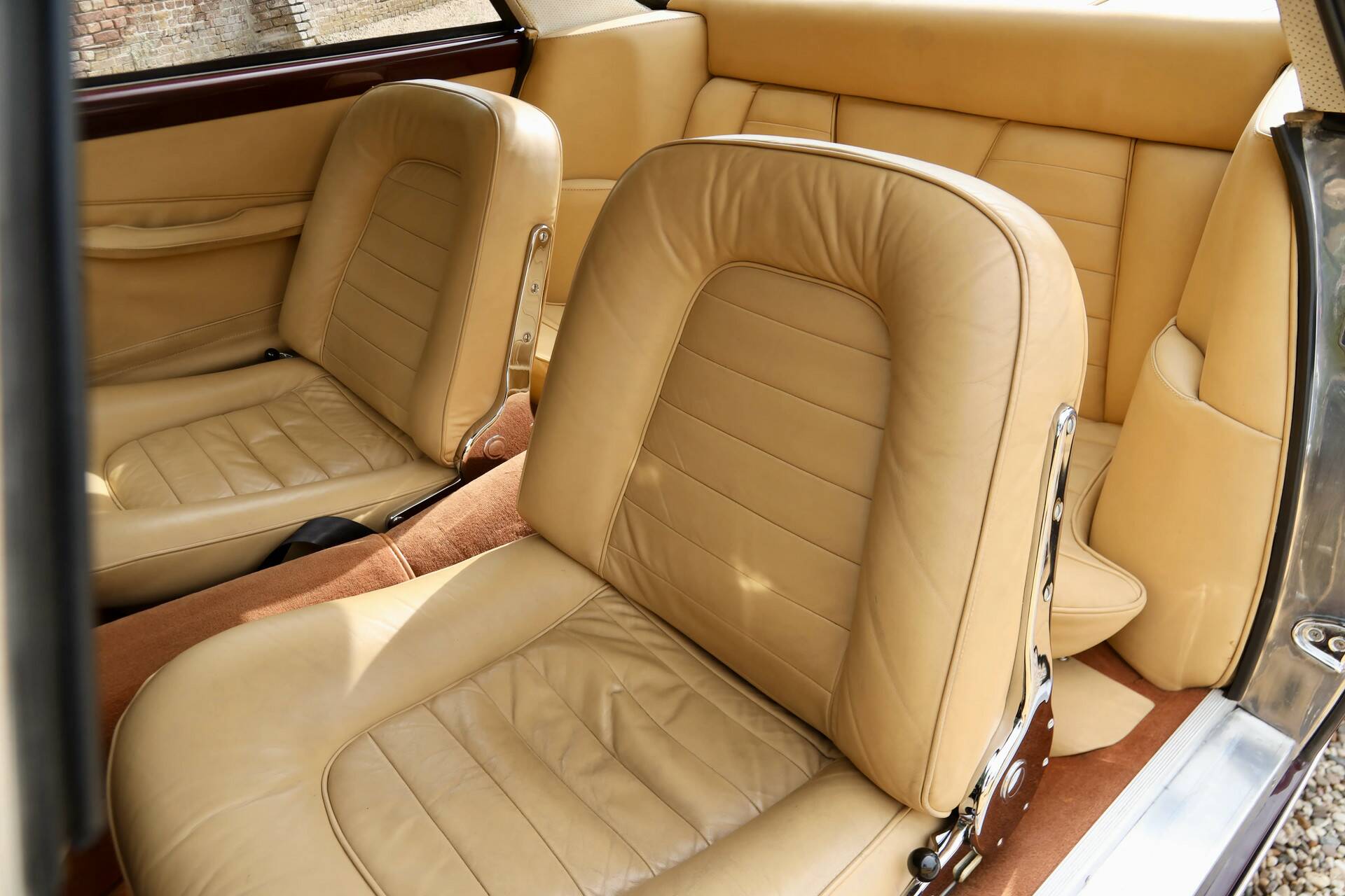 Even more impressive, this is a matching numbers and matching colors example, delivered in its original Amaranto paintwork — a rich, deep burgundy — paired with a Pelle Marrone interior in beautiful beige leather. The luxurious carpeting and factory-correct gauges are all in exceptional condition.
