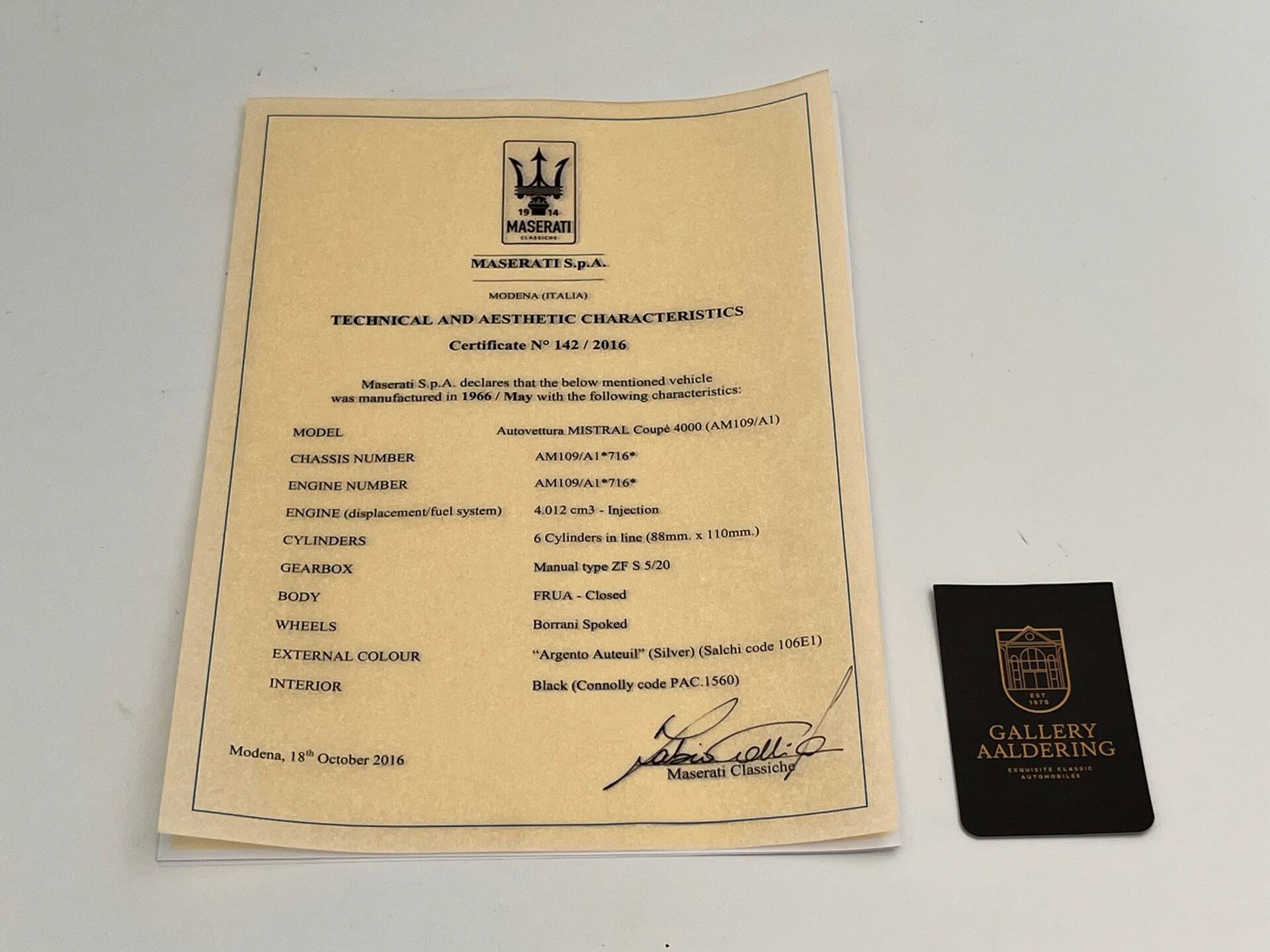 Maserati Mistral 4000 "Maserati Classiche certified" PRICE REDUCTION! Thoughtfully restored, Maserati Classiche certified, A "matching numbers & colors" Mistral, European version, The most desirable 4 liter straight six engine, Presented in "Argento Auteuil" over black Connolly leather, One of 828 Mistral Coupés produced, Equipped with Borrani wheels, Enjoyed a long-term ownership,
