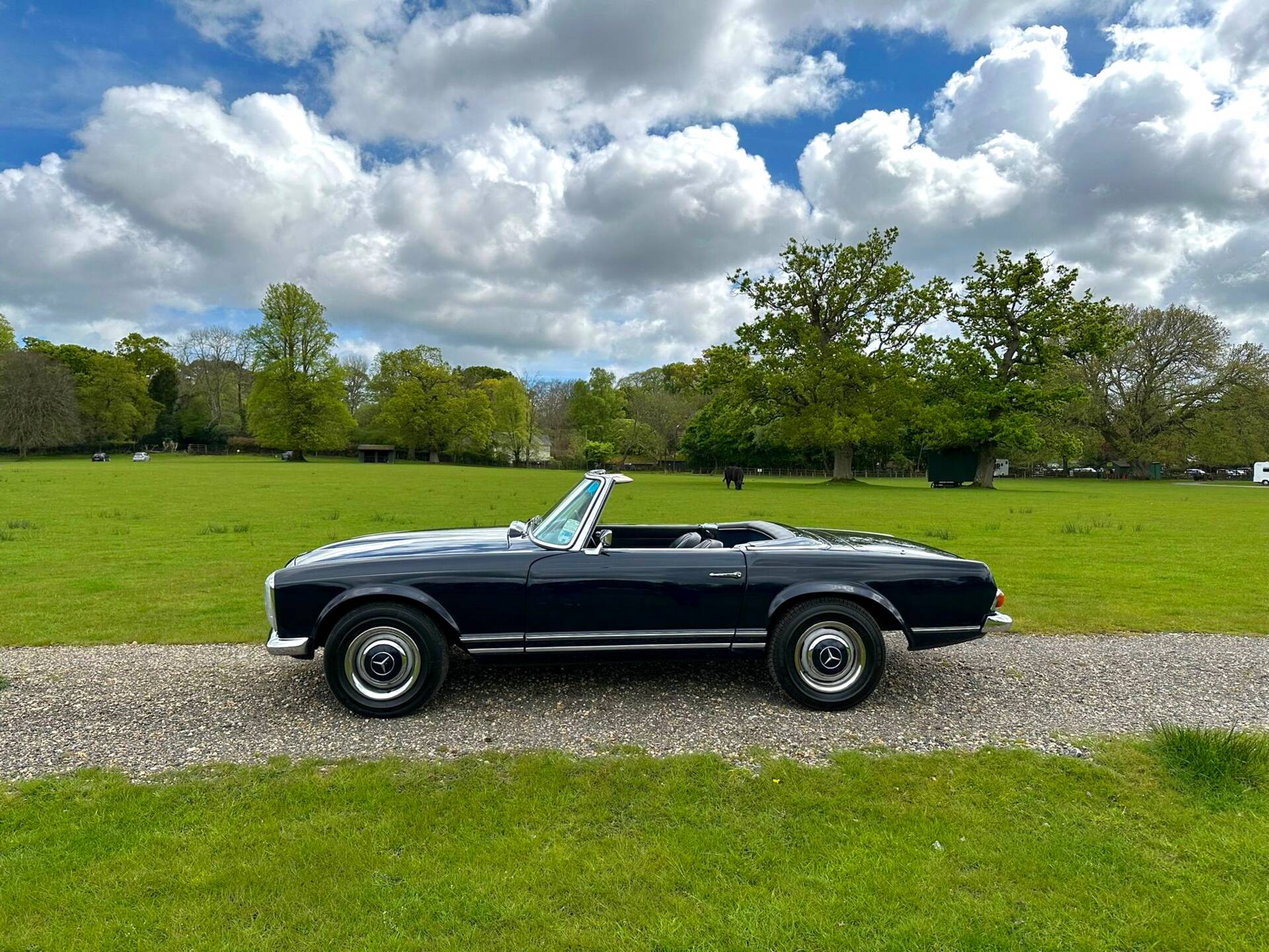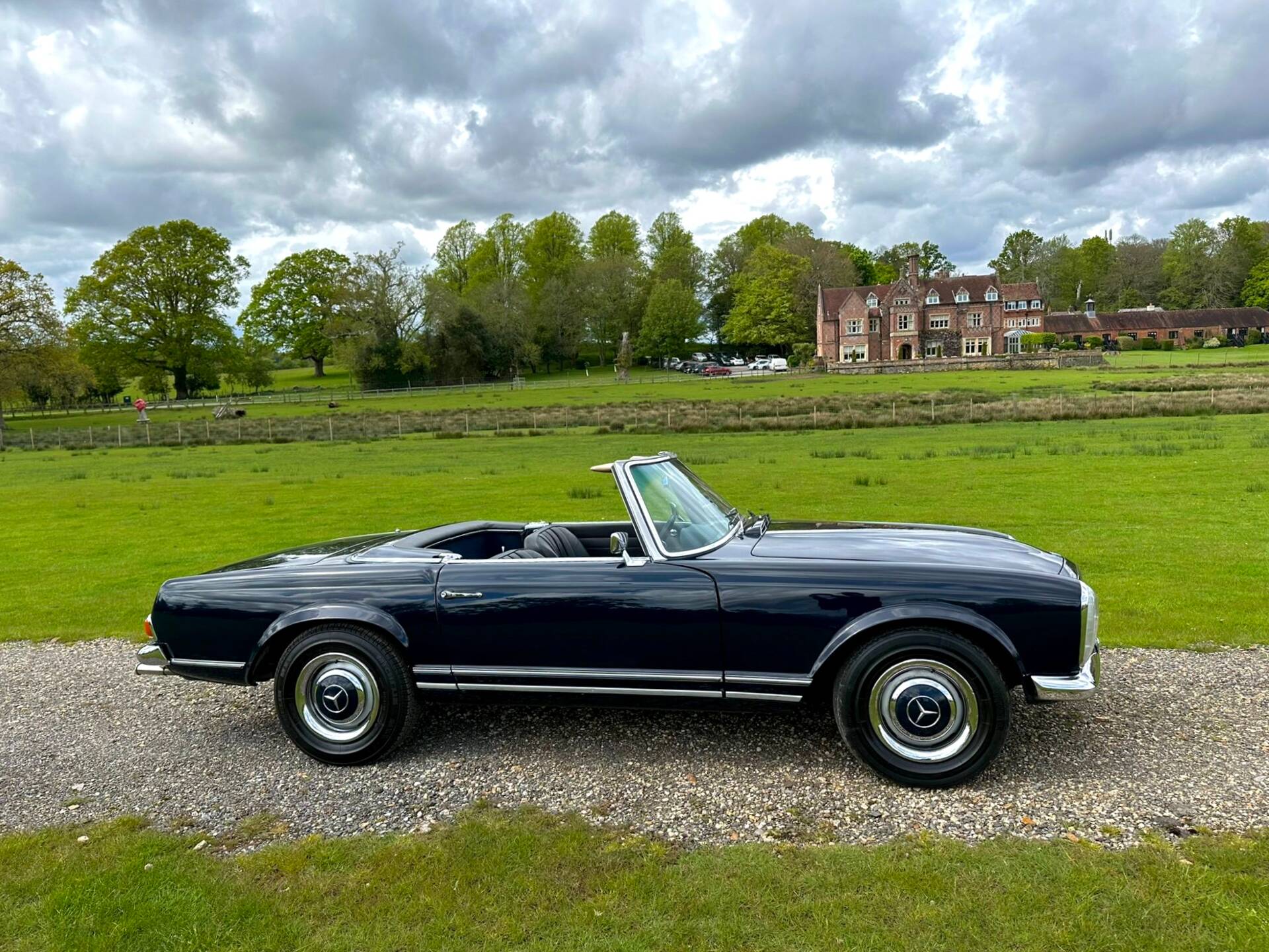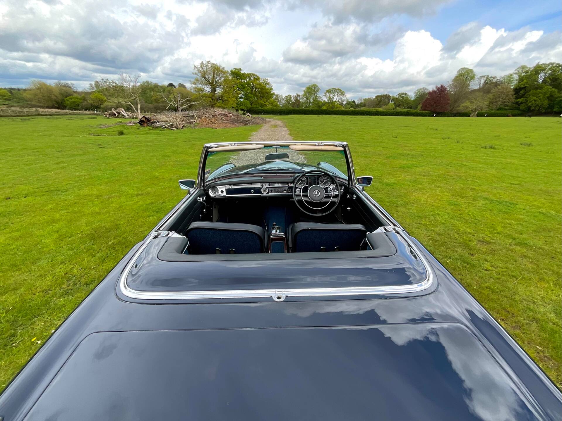 This Pagoda is finished in Cavansite Blue with Black and Blue Leather Interior. The paintwork is in great condition and so is the brightwork. The interior beautifully complements the car’s exterior tone. The dashboard features a body-coloured upper fascia, elegant chrome accents, and a perfectly preserved wood trim that stretches across the dash and center console. The Blaupunkt Stereo System sits lovely in the center, flanked by functional climate sliders and period-correct toggle switches. The seats are period correct and the bolsters remain firm, with no sagging or excessive wear. The seat bases provide a comfortable, upright position.