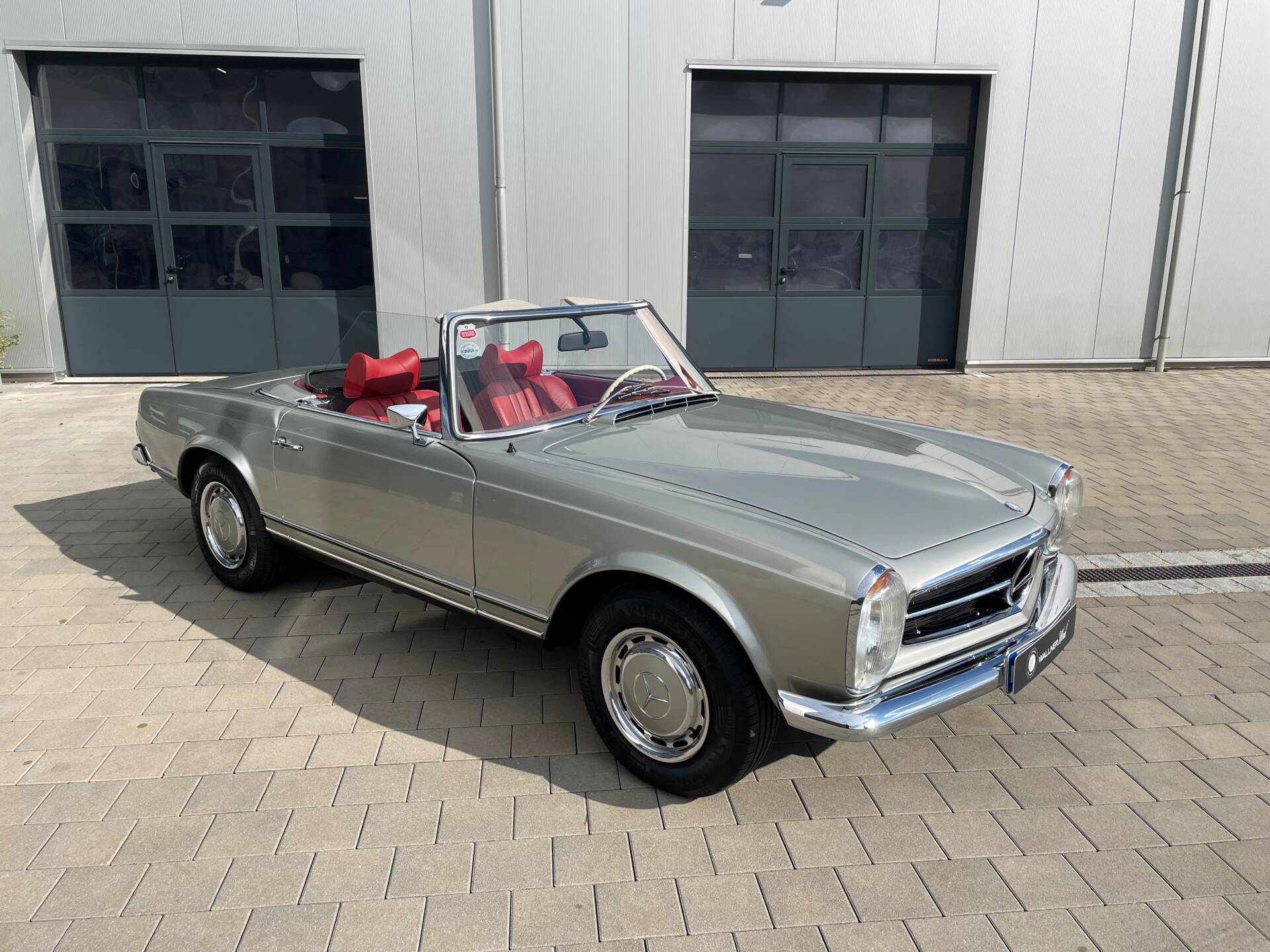 **This Daimler-Benz 280 SL Pagoda in an elegant silver-gray metallic color combination with red leather interior was first registered on August 20, 1969, and embodies the timeless style of the classic SL series. The current owner purchased the vehicle in 2012 and has maintained it with special care ever since. The vehicle has been regularly serviced and improved in detail. In 1998, the car underwent a comprehensive restoration. In the course of this, the vehicle was fitted with an original Mercedes-Benz replacement engine, which kept the technology at a flawless factory level. The transmission was converted to a GETRAG 5-speed transmission in 2006, which significantly improved driving comfort and long-distance suitability. During the overhaul of the rear axle in 2007, the vehicle was fitted with a long rear axle ratio, which further enhances driving pleasure. The SONNENLAND-quality fabric soft top was replaced in 2012 and the leather seats in 2016.During the last service in June 2024, the entire brake system on the front and rear axles, including the brake calipers, was overhauled. In addition to countless invoices and pictures of the restoration, the valuation reports from 2012, 2016, and 2022 are available, as well as a copy of the data card.