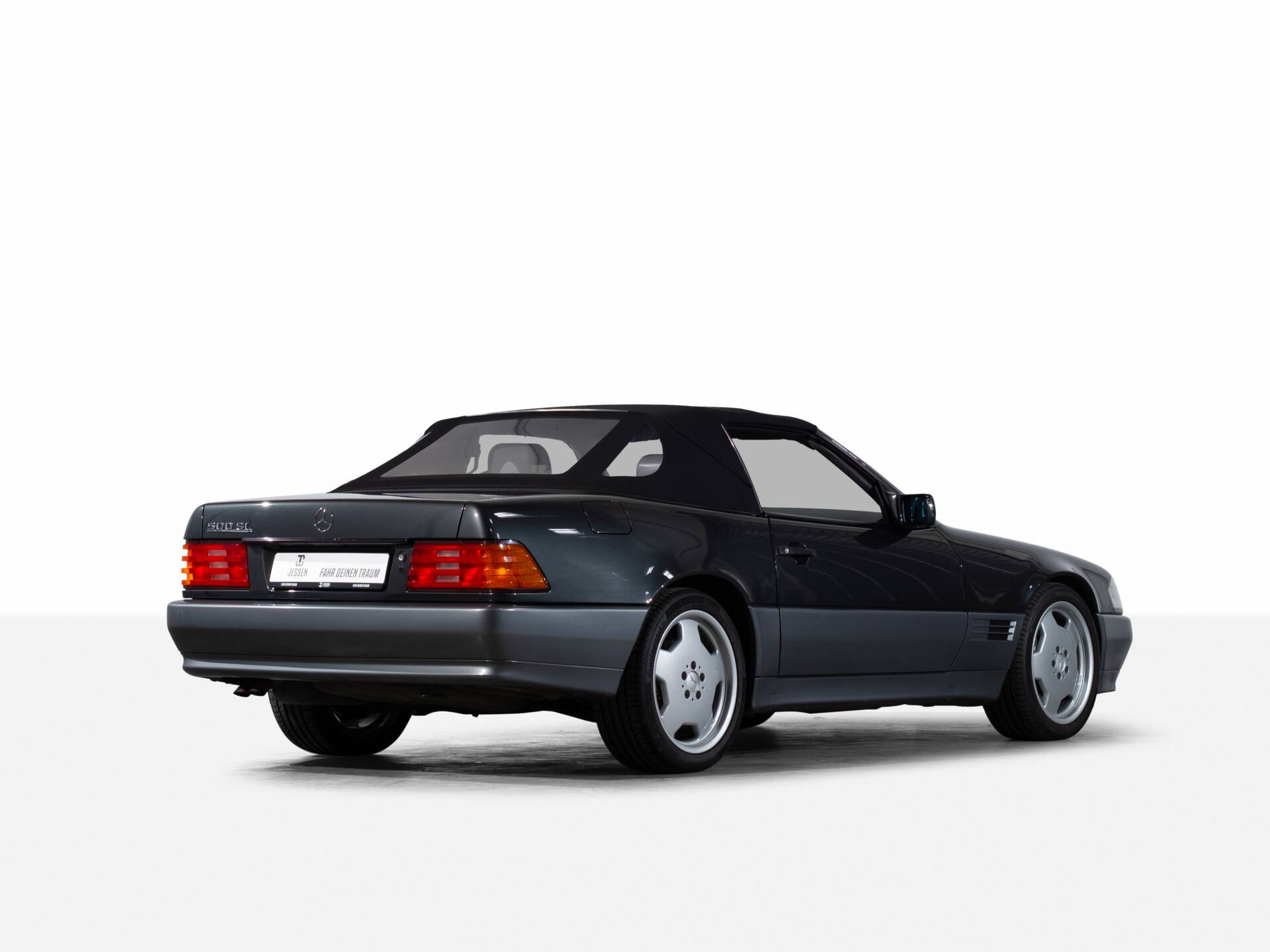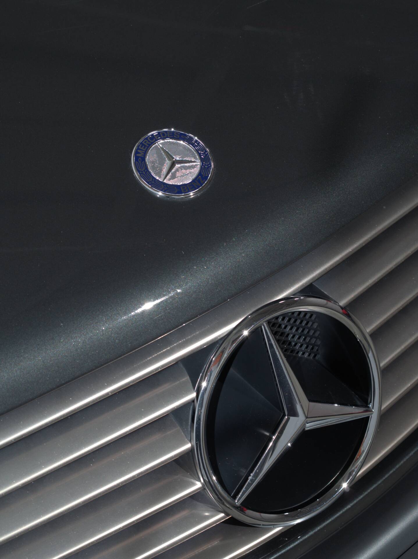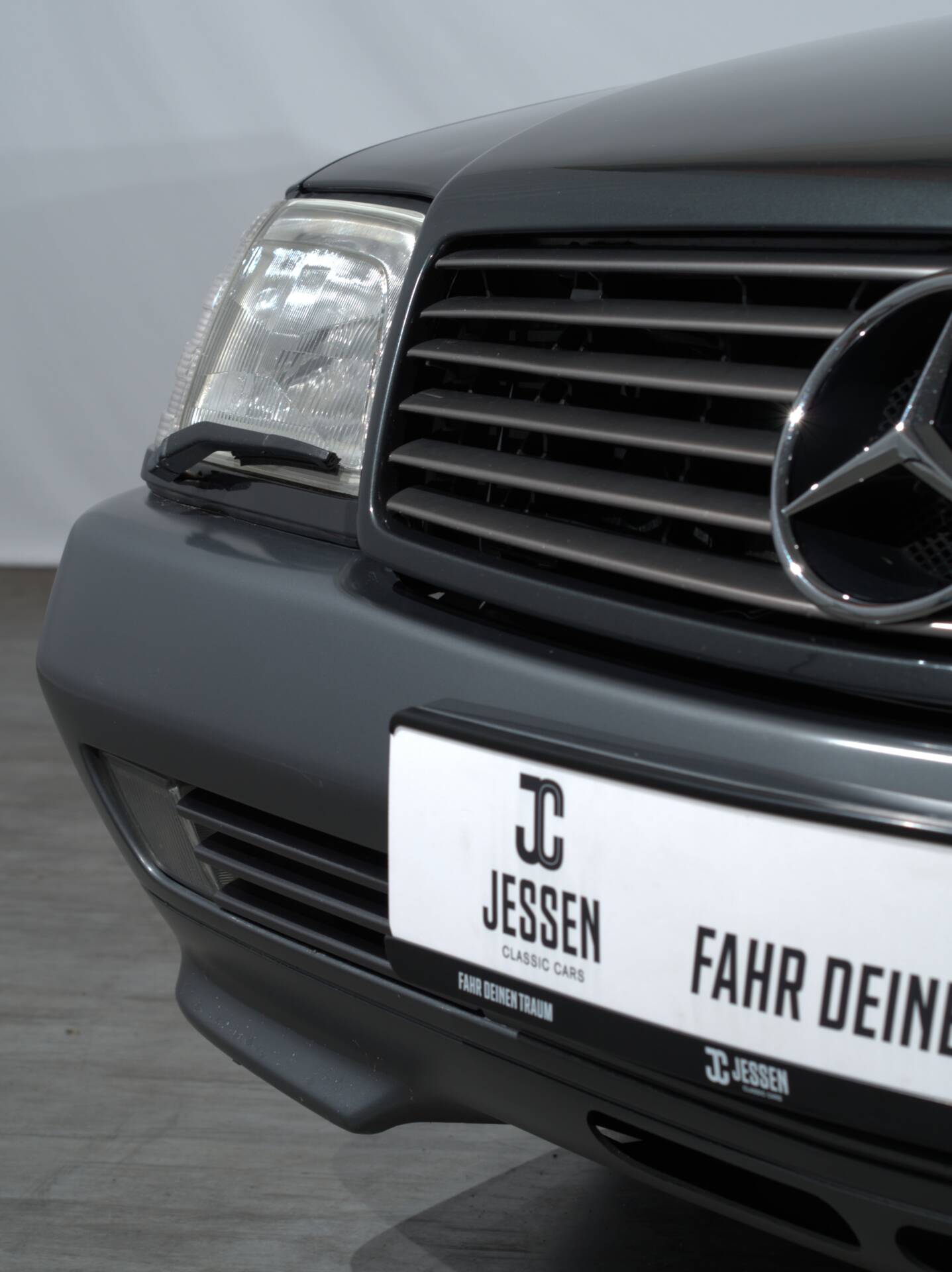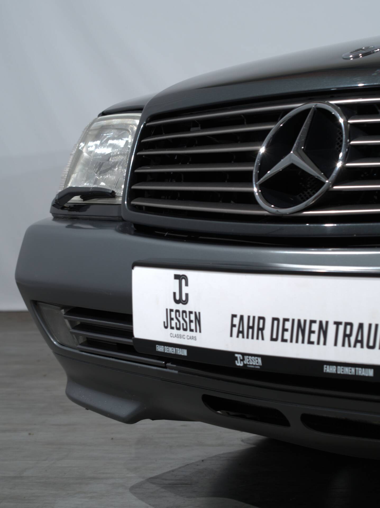 Our 500SL from 1993 is therefore an original model and has a mileage of only 99,100 kilometres. The classic colour combination of 199 blue-black metallic with side panelling in contrasting 700 old grey, black soft top fabric and grey leather does not suggest that we have a truly special vehicle in front of us.