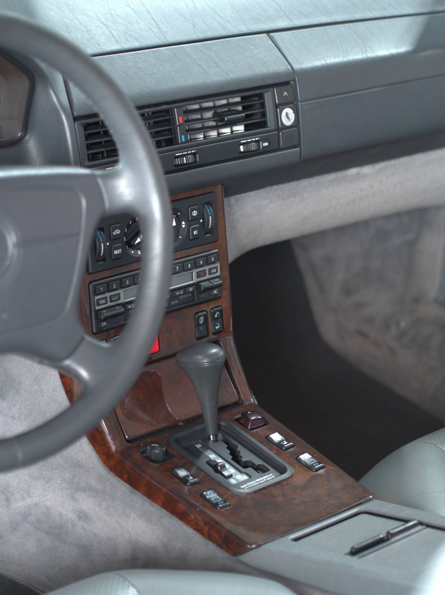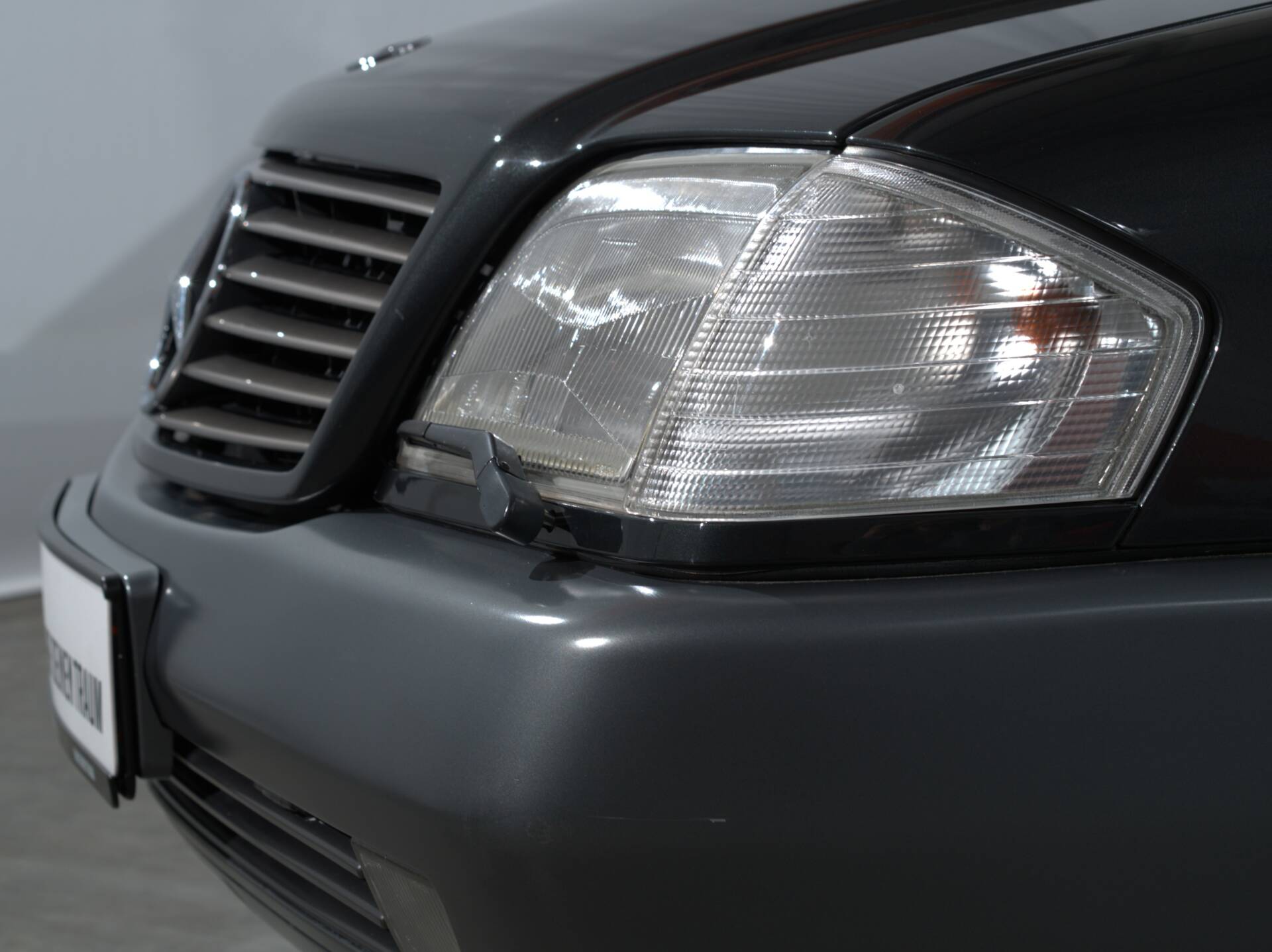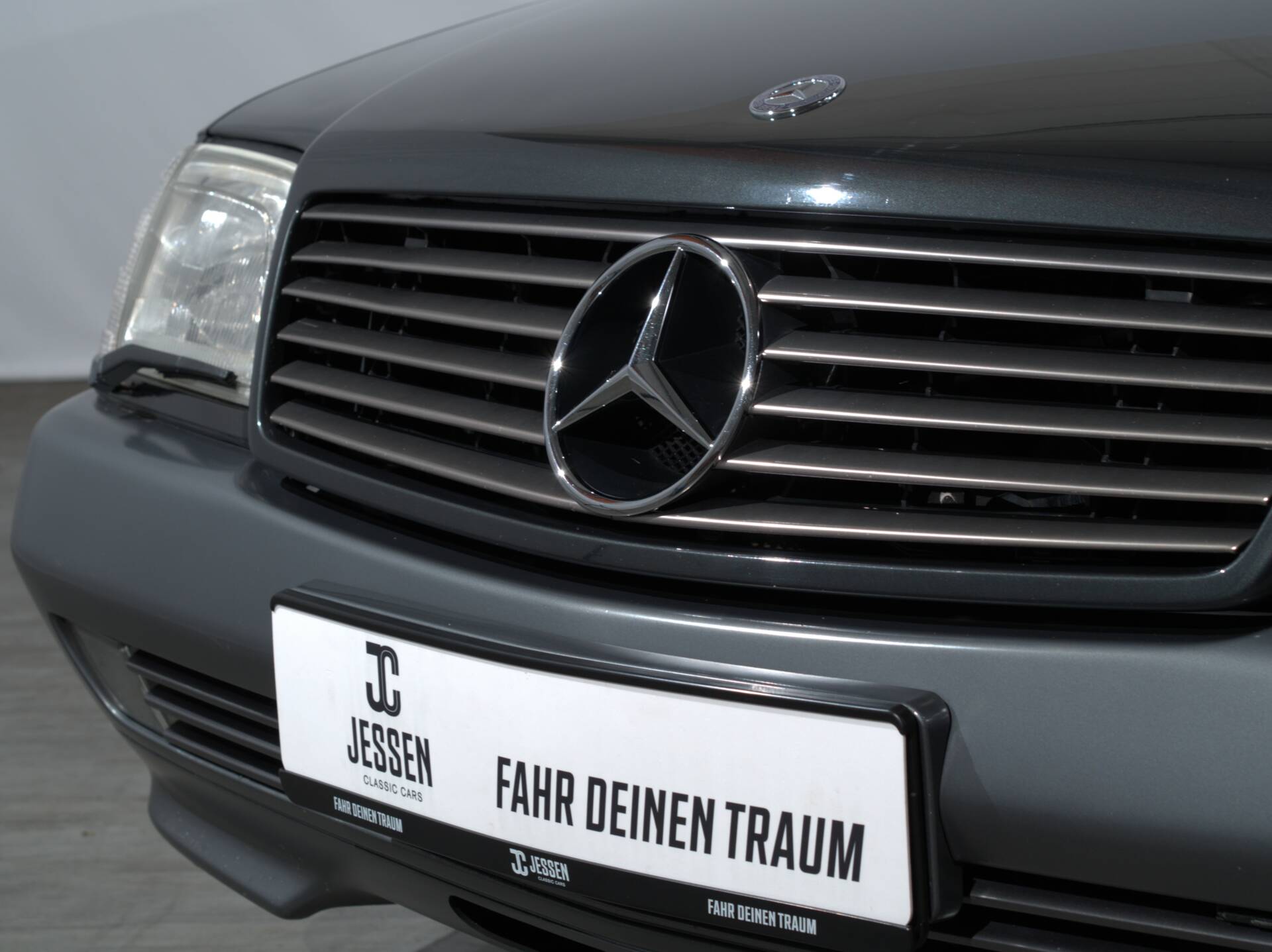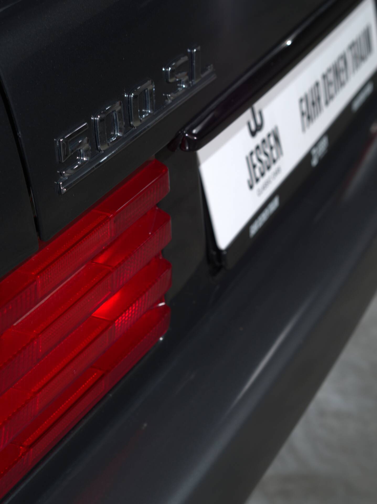 Our 500SL from 1993 is therefore an original model and has a mileage of only 99,100 kilometres. The classic colour combination of 199 blue-black metallic with side panelling in contrasting 700 old grey, black soft top fabric and grey leather does not suggest that we have a truly special vehicle in front of us.