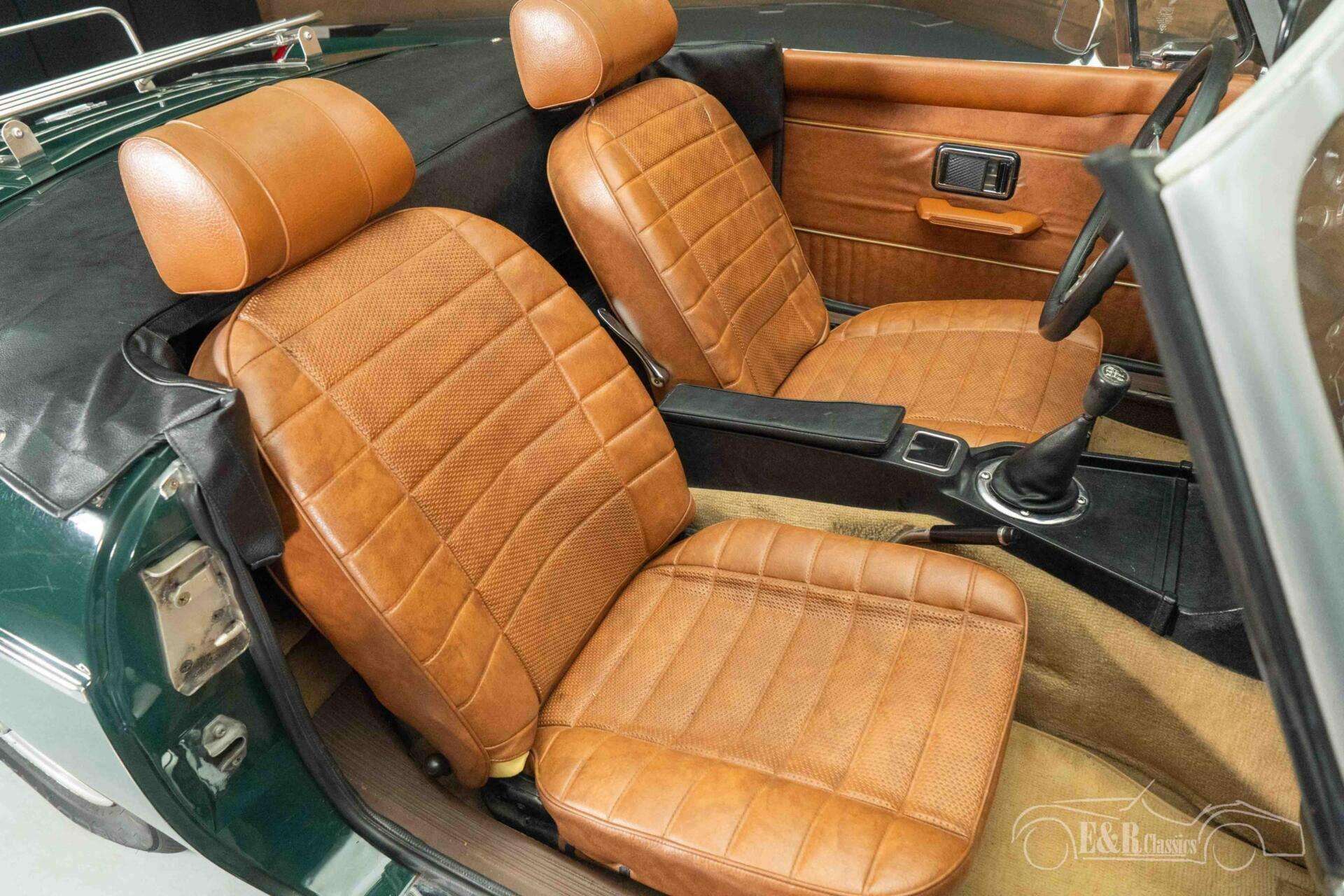 Qua uitstraling komt deze MG MGB uitstekend tot zijn recht in het stijlvolle British Racing Green lakwerk, gecombineerd met een zwarte soft top en klassiek bagagerek achterop. Het geheel wordt afgemaakt door de karakteristieke velgen en chromen details die het sportieve design versterken. Het interieur is uitgevoerd in warm bruin leder, wat een mooi contrast vormt met de donkergroene buitenzijde en zorgt voor een uitnodigende, authentieke sfeer. Deze MGB ademt Britse klasse en nodigt uit tot zorgeloze ritten met open kap.