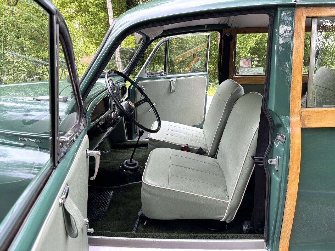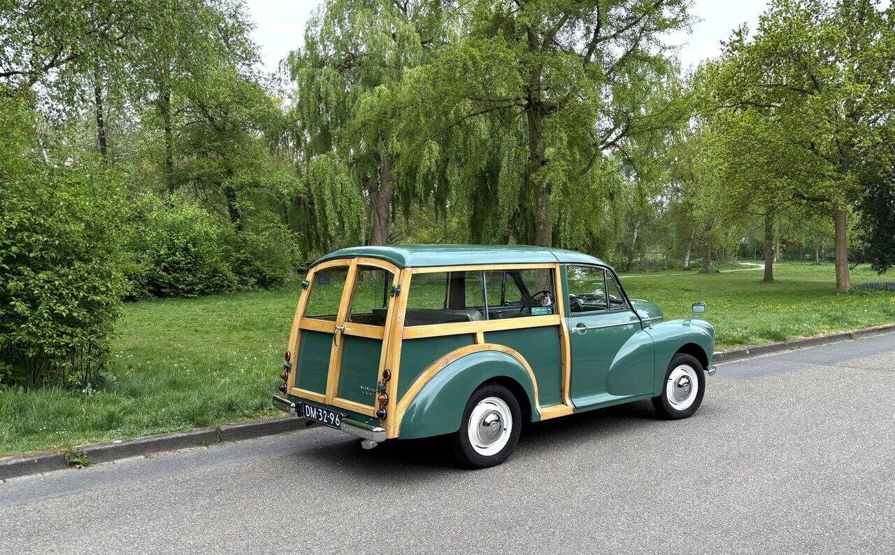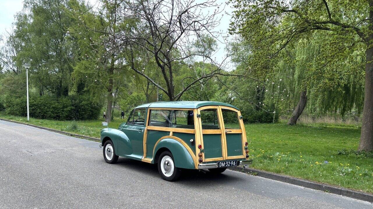 De Traveller is tijdens de restauratie overgespoten in de originele kleur “Almond Green" en de lak ziet er strak uit met enkele schoonheidsfoutjes. De buitenzijde ziet er gewoon mooi uit en de kleur is geweldig. Almond Green is nu een zeer geliefde Morris kleur, kijk maar naar de klassieke Mini. Ook het bekende essenhouten frame is compleet vernieuwd en gelakt net als de chromen bumpers. Er zijn toen nieuwe velgen met nieuwe banden gemonteerd met de mooie wieldoppen.