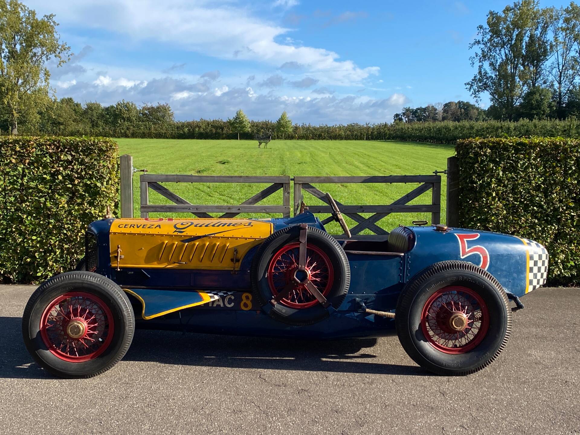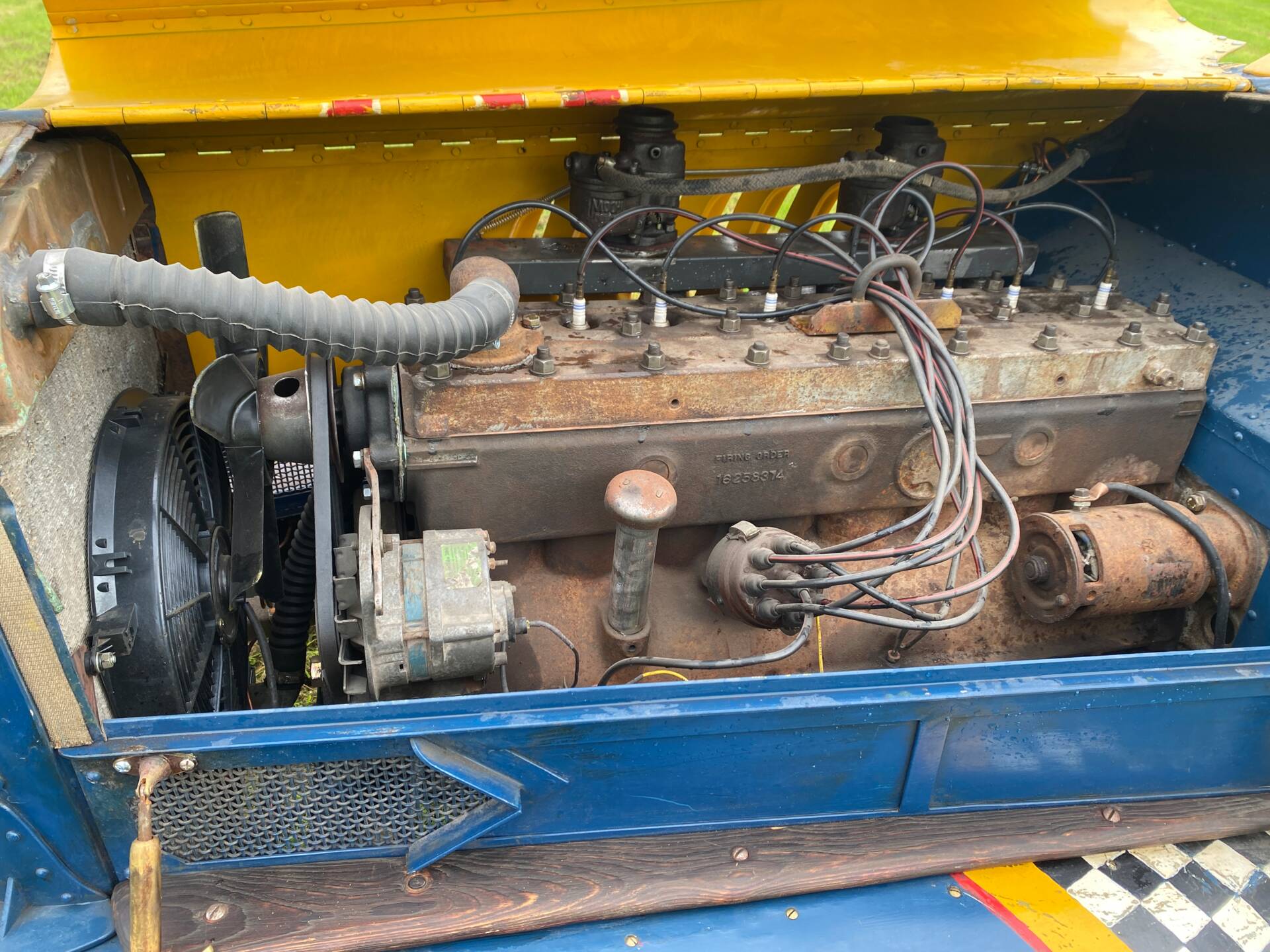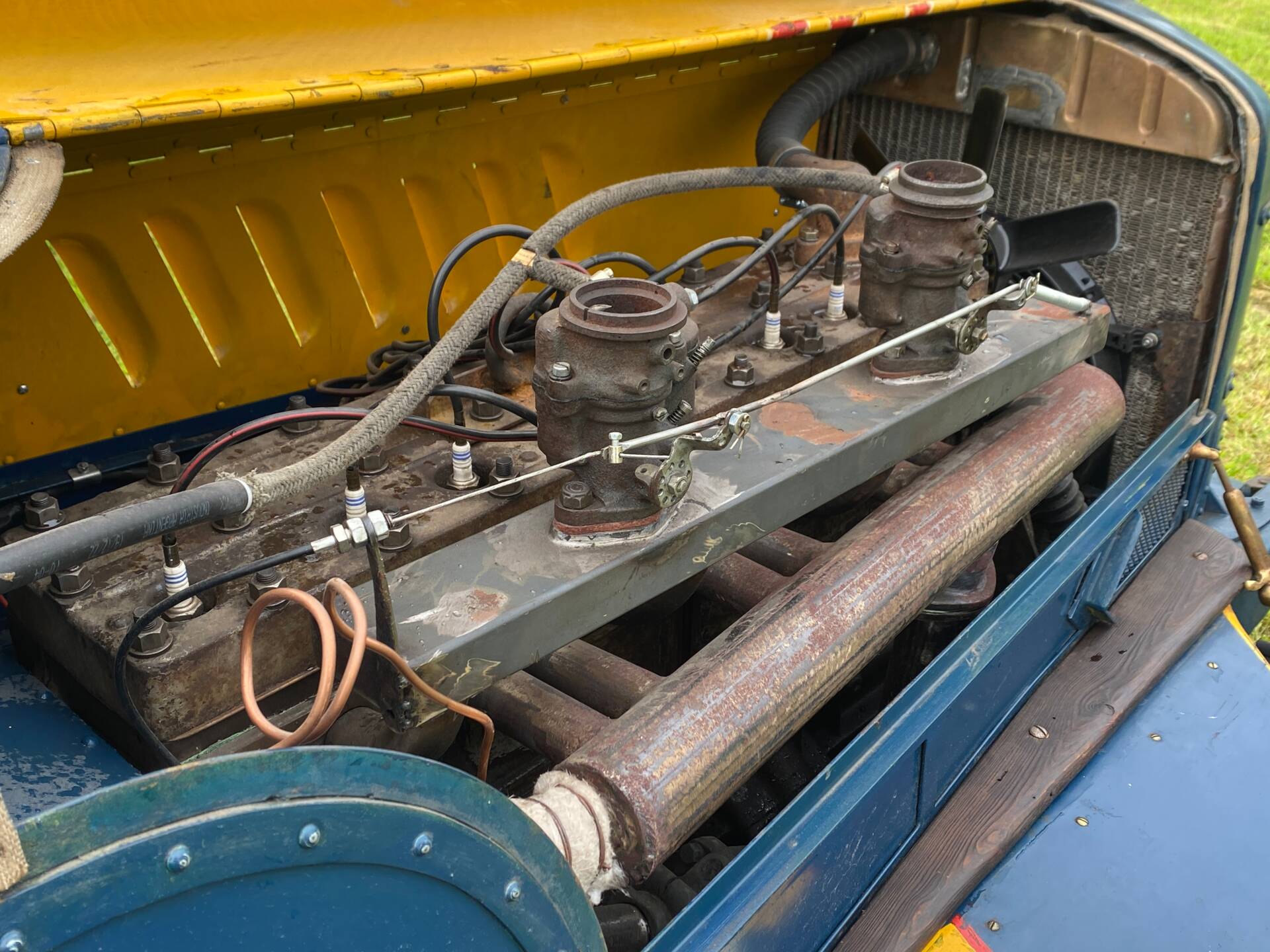 As the car is running quite fast due to all the modifications done, the brakes were modified for hydraulic brakes and foreseen of Alloy drums all around for better brake performance. As for the road handling, the leaf springs have been equipped with Hartford friction shocks in the front and rear. The 18-inch spoke wheels are fitted with BF Goodrich tires, and the car has been given an identical spare wheel. Other details contributing to the fantastic looks of the car are the leather tool bag on the driver's side, the brass finishing, the dark red leather interior, the little windscreen and its paintwork. A full tonneau cover is provided with the car to protect on rainy days.