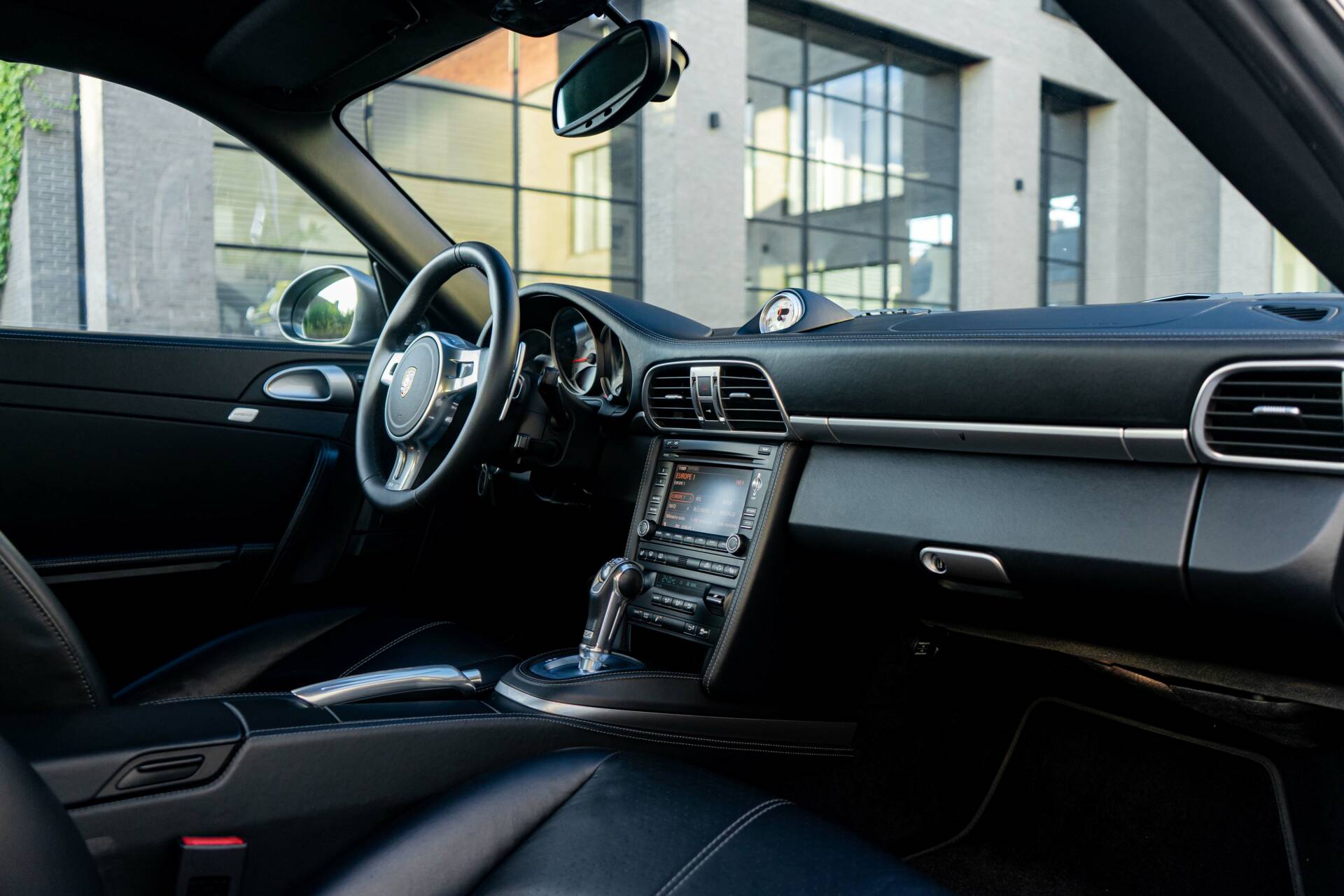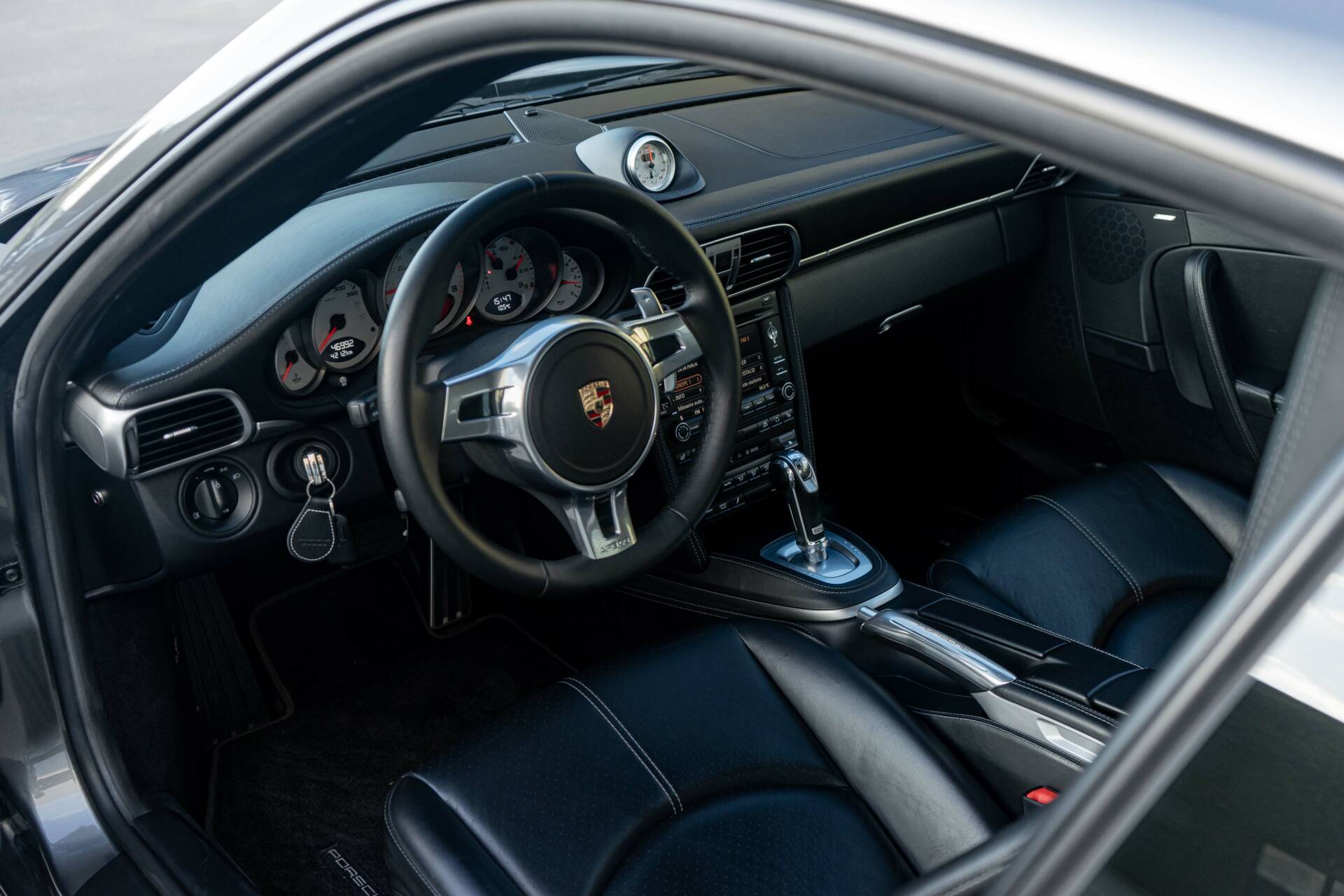 The leather-wrapped steering wheel is equipped with paddle shifters and frames a central tachometer and a 350km/u speedometer, as well as gauges for oil temperature, oil pressure, coolant temperature, and fuel level. The Sport Chrono Package added a stopwatch atop the dashboard. The digital odometer indicates sut under 47.000km, approximately 2.500km of which were added under current ownership.