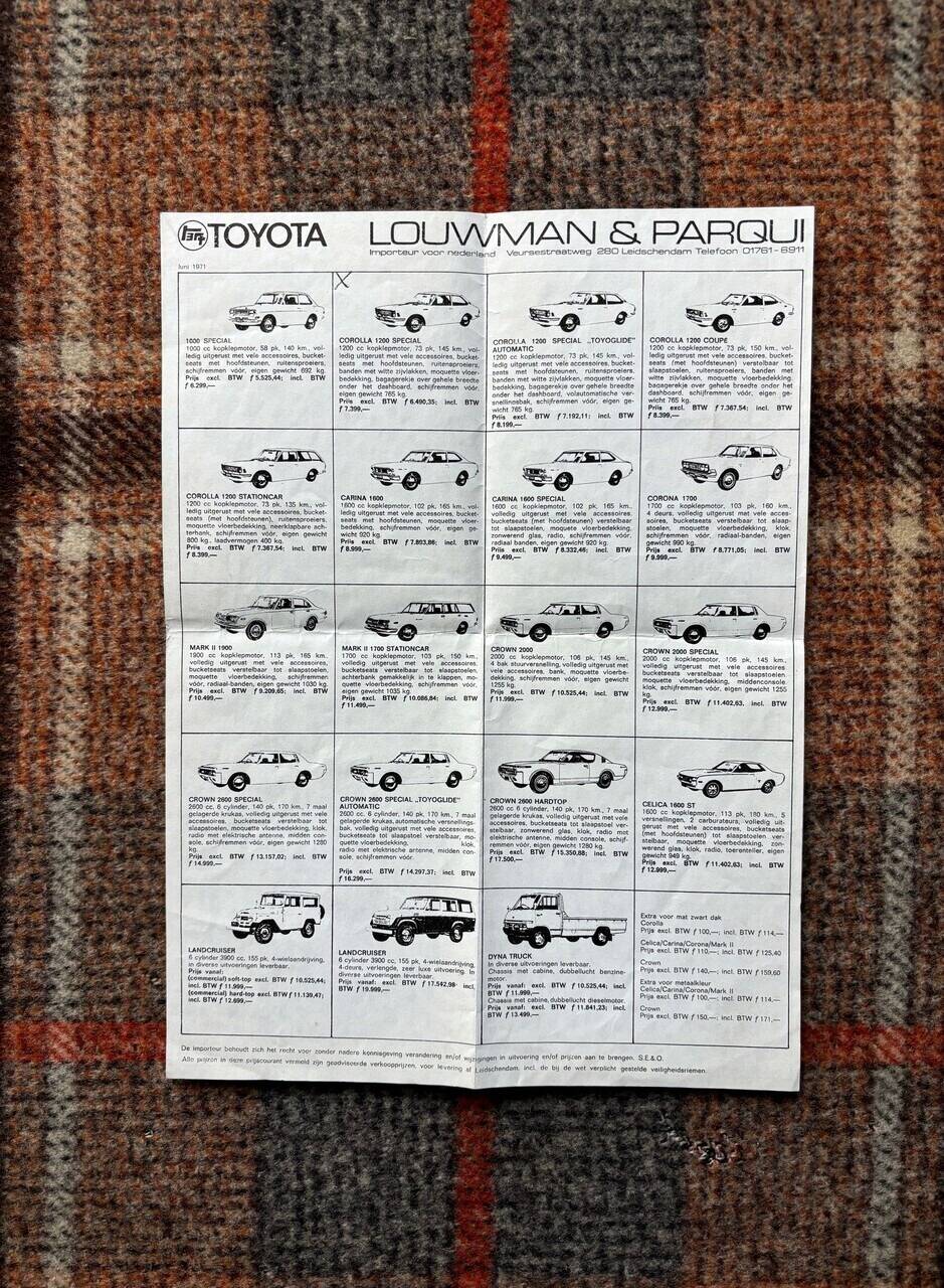 Prachtige Nederlandse Corolla 1200 in een originele staat met 69.944 km van de 2de eigenaar. Compleet met de boekjes, alle sleutels en de originele garantiekaart. Zelfs voorzien van een Vermeulen-Hollandia schuifdak. Ook deze garantiekaart is nog aanwezig. Nieuw gekocht bij de toenmalige garage van Amersfoort in Laren. Het onderhoudsboekje is keurig ingevuld en in 1975 is de Toyota overgeschreven naar een familielid, ook uit Laren. Deze eigenaar had een verzameling oldtimers die gestald stonden in een verwarmde ruimte. Deze Toyota is toen getectyleerd en heeft 49 jaar in een verzameling gestaan. Hij werd zeer sporadisch gebruikt en de Corolla heeft dus al die jaren geen regen of pekel gezien!