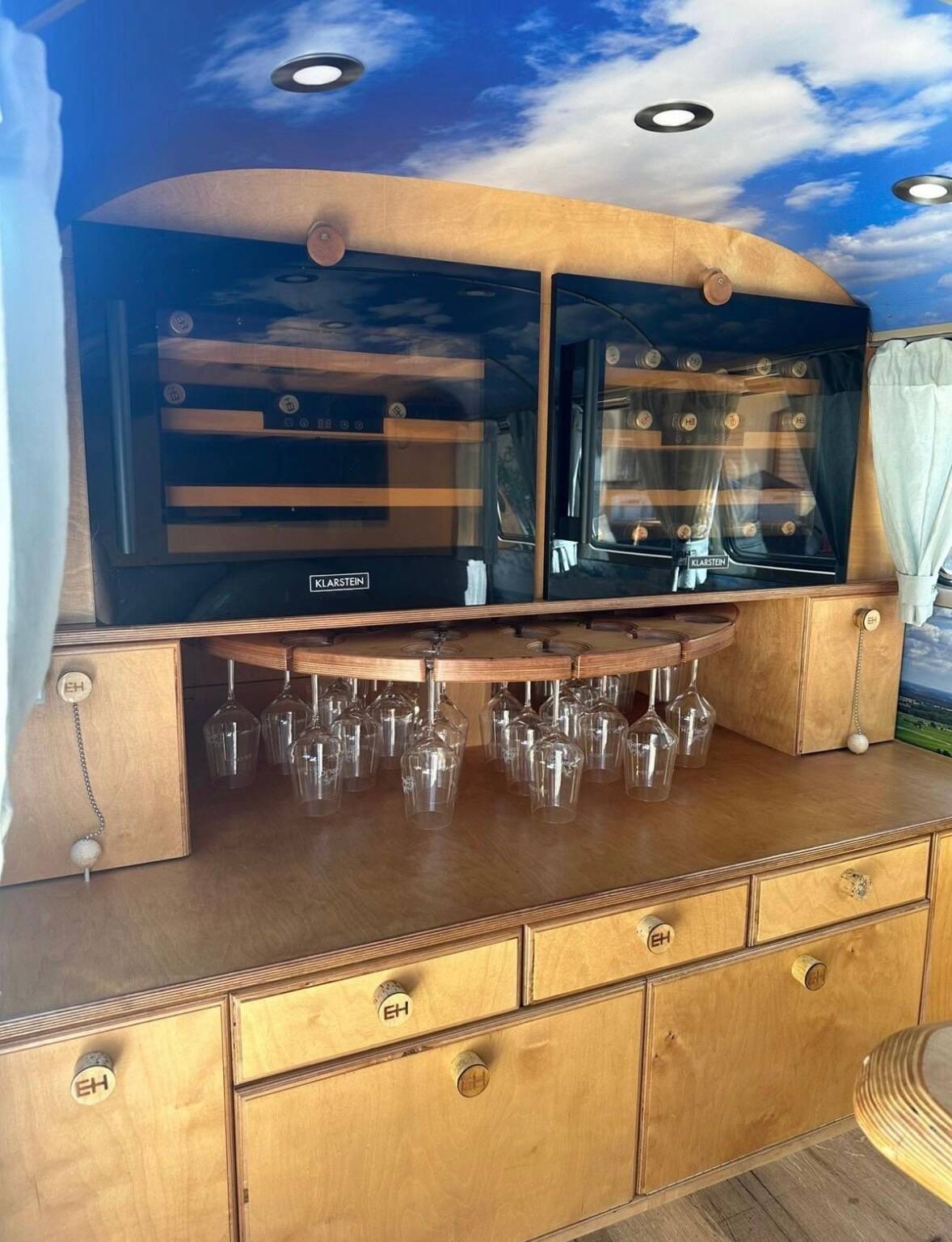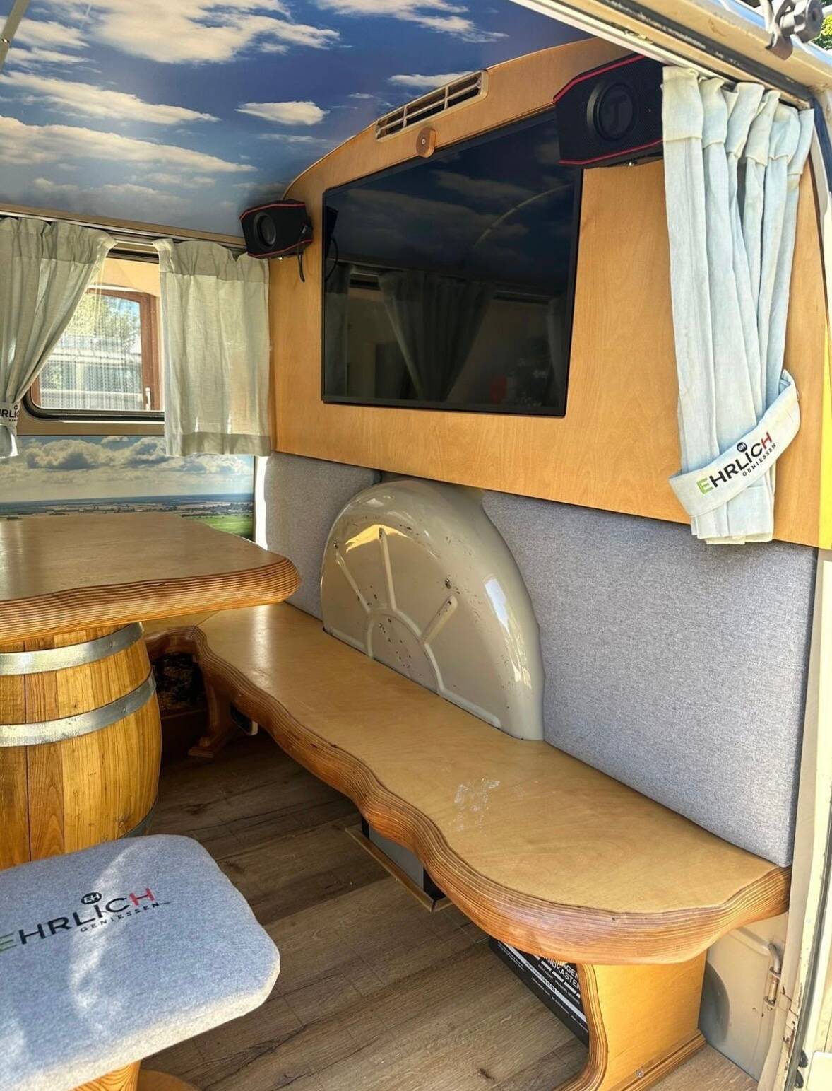 Er hat Standheizung, Teufel Lautsprecher verbaut, zwei Klarstein Getränkekühlschranke und einen Fernseher.