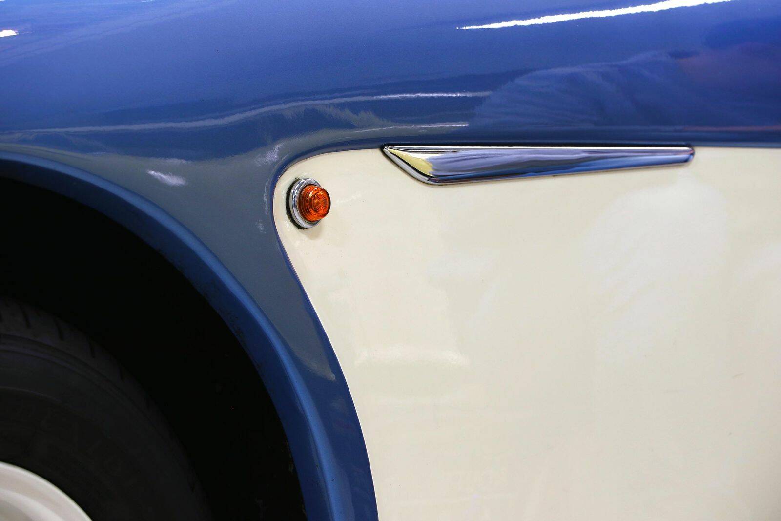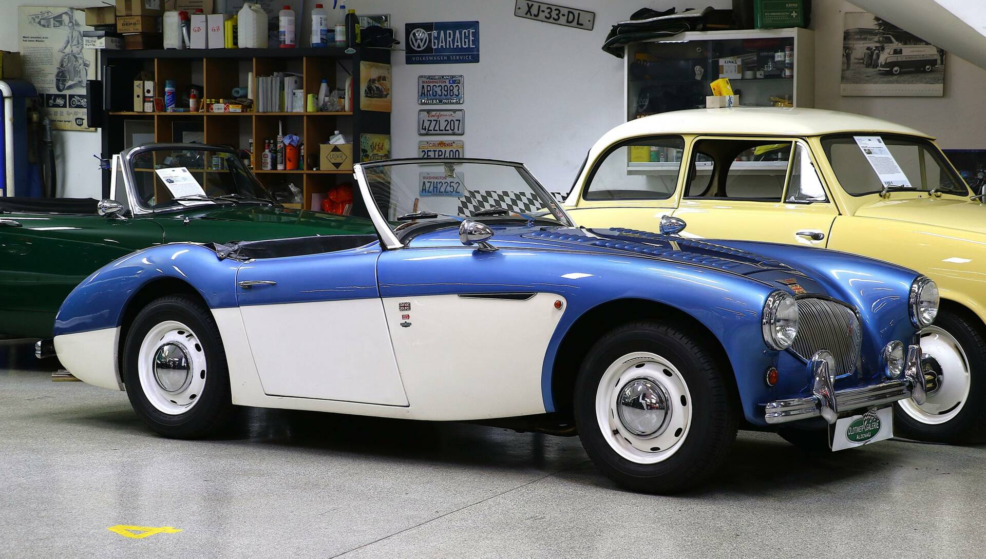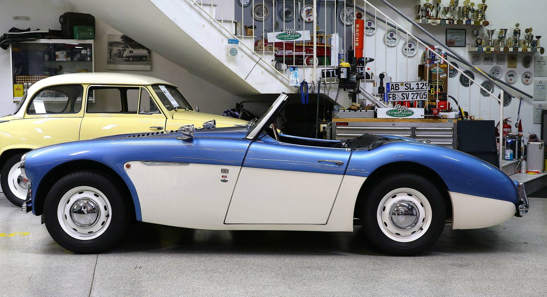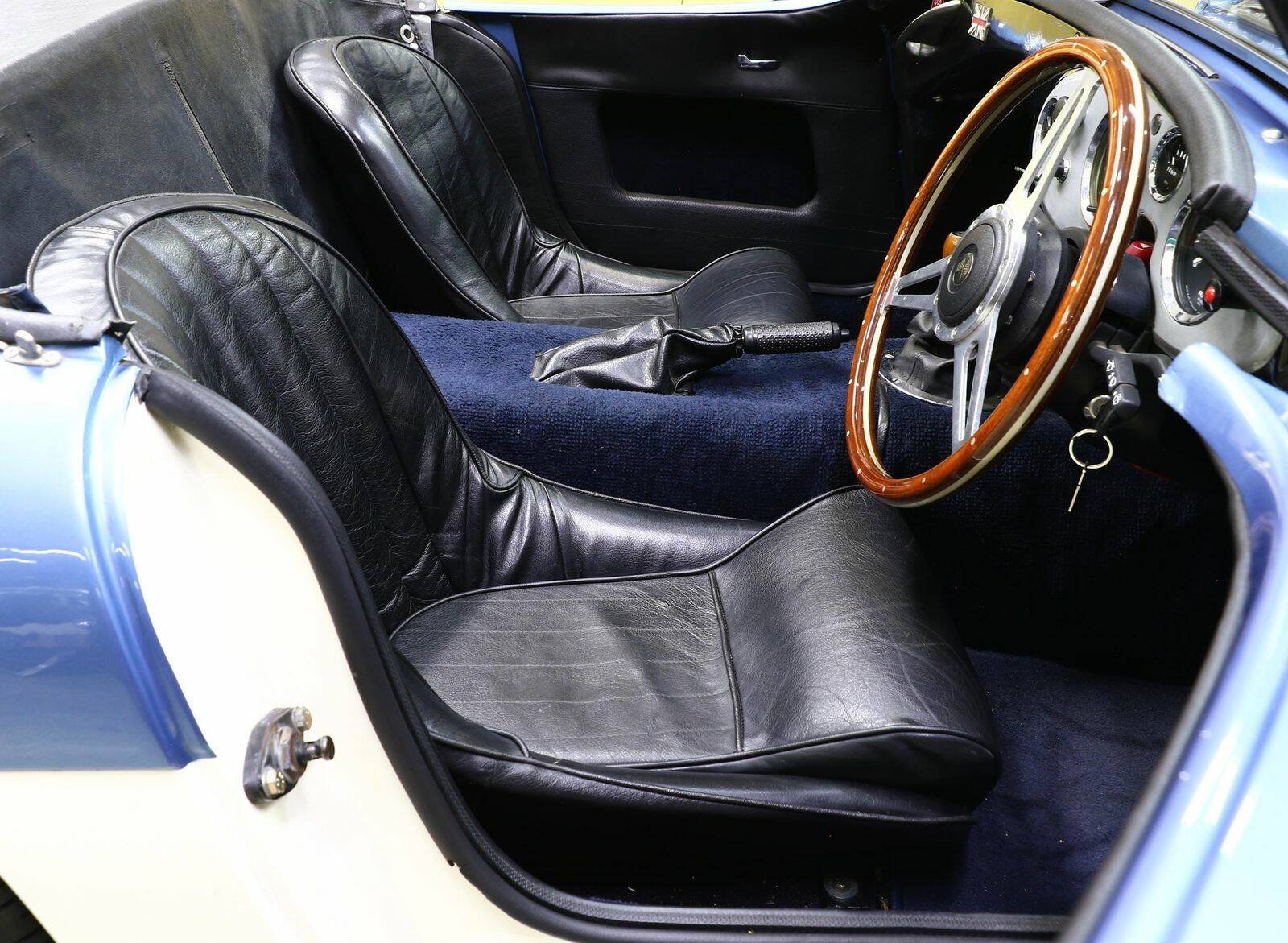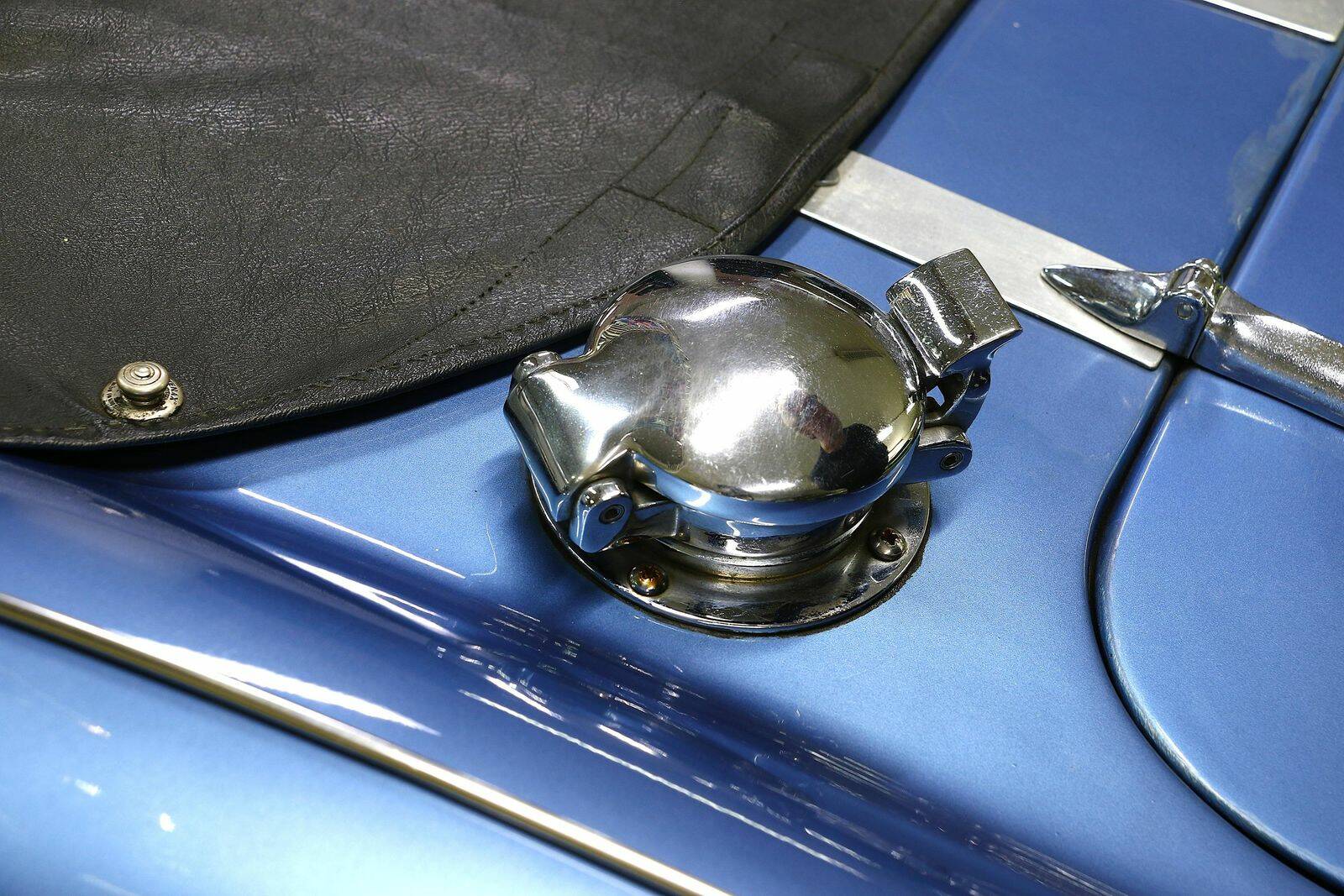 Wie der 100M trägt er 2 Reihen Louvers auf der Motorhaube. Die 2-farbige Lackierung in Blau / Weiß ist den späteren Austin Healey 3000 entliehen -- sie ist auch heute noch in gutem Zustand und steht dem Haldane hervorragend.