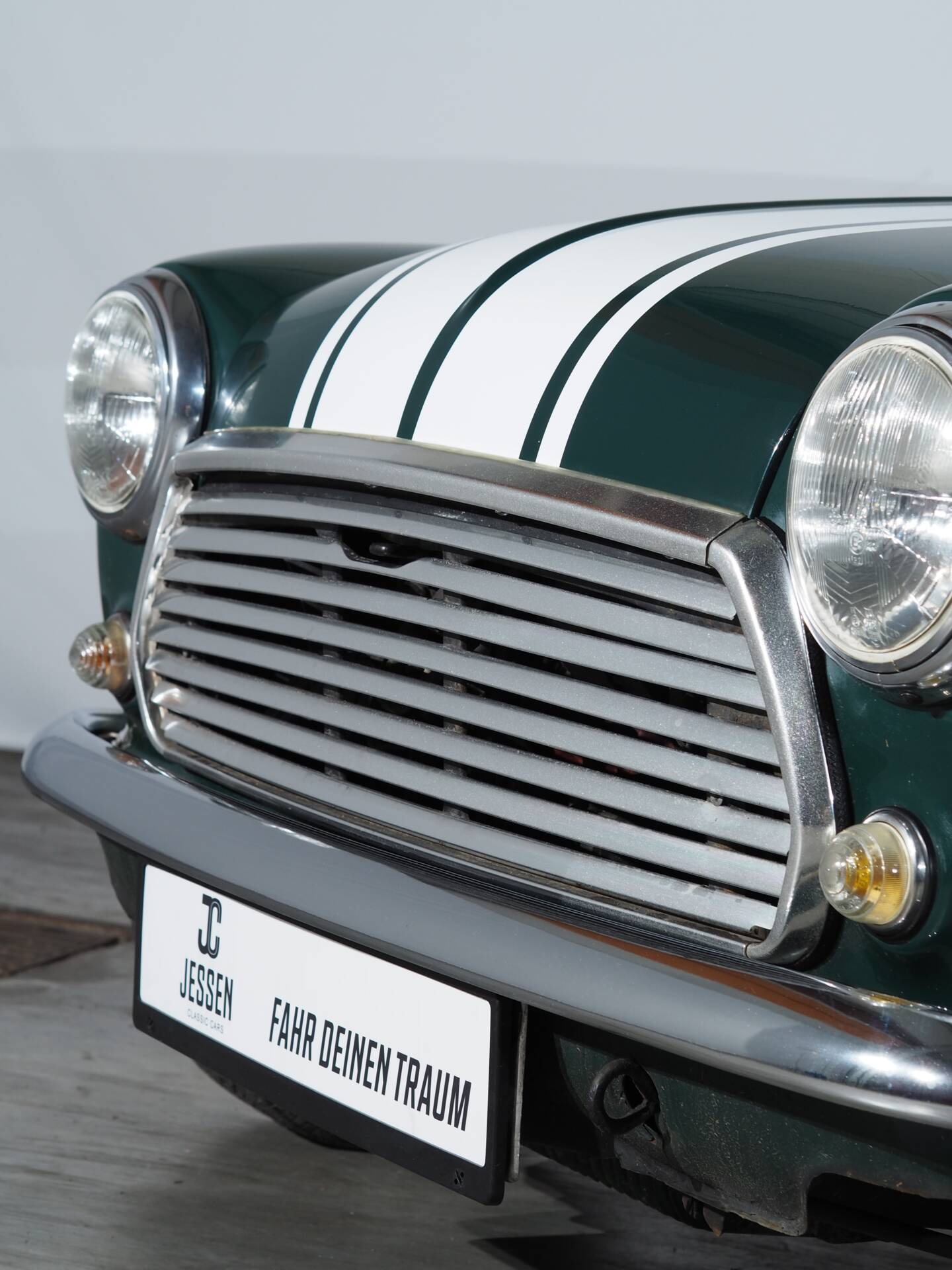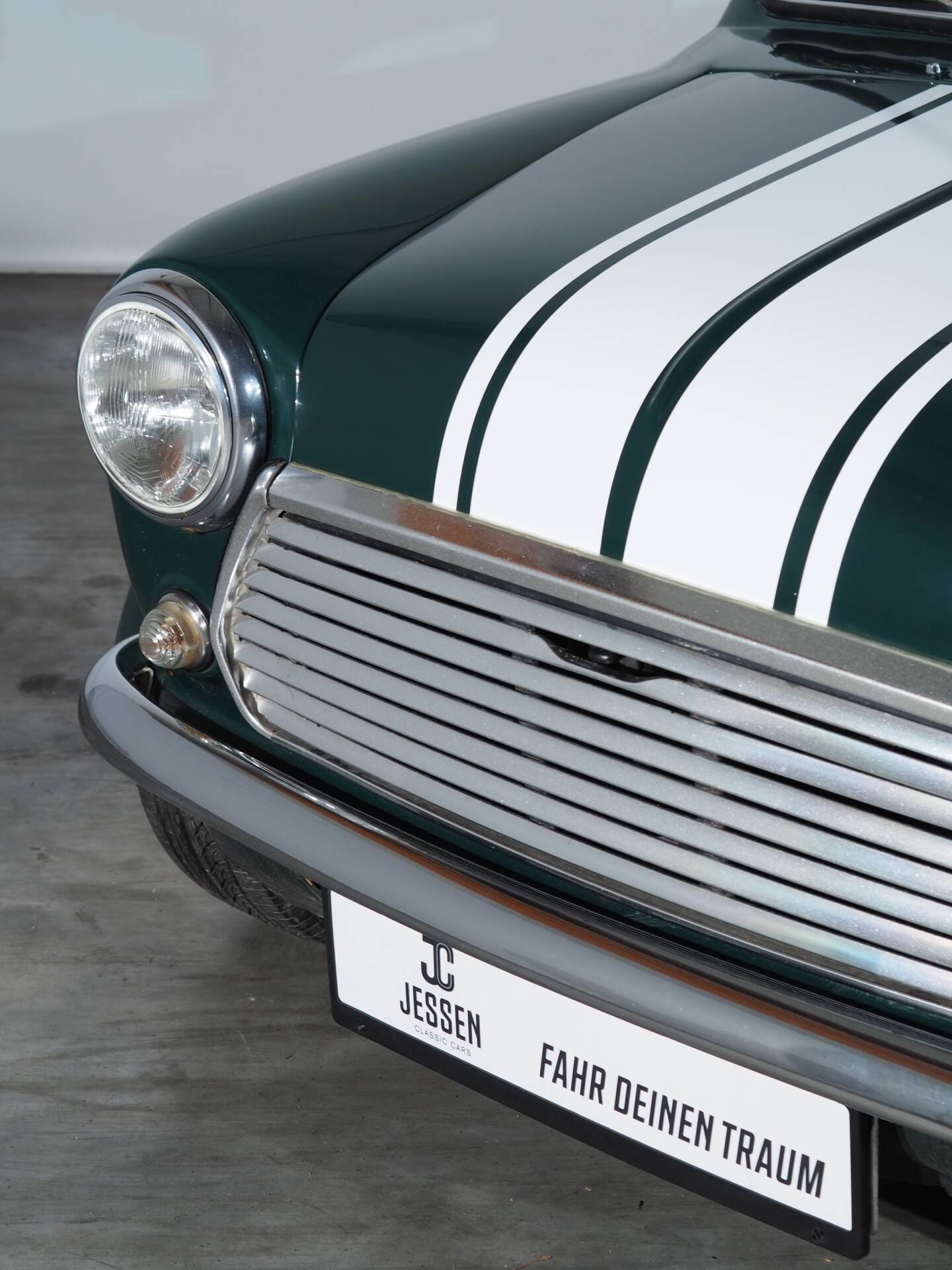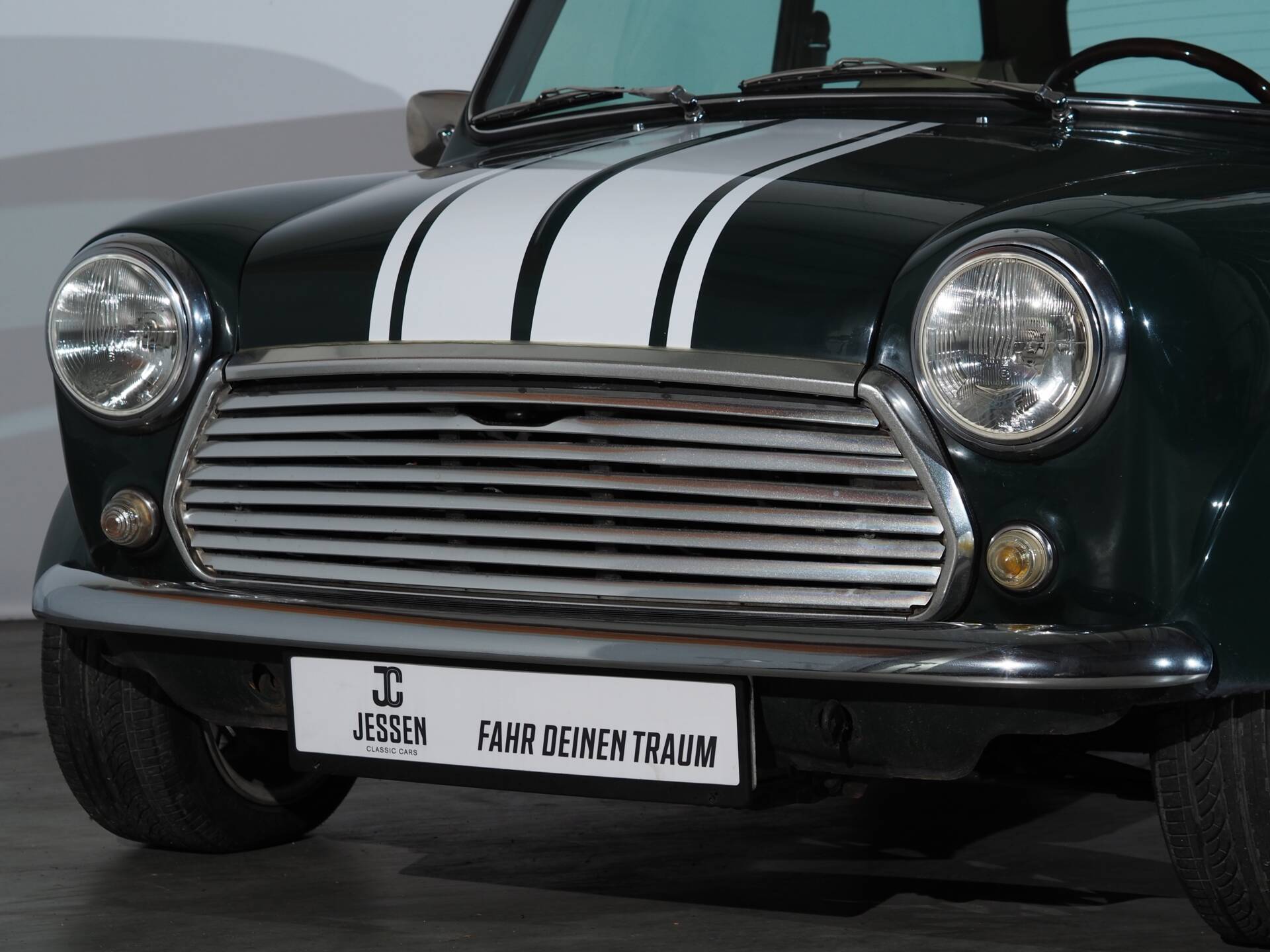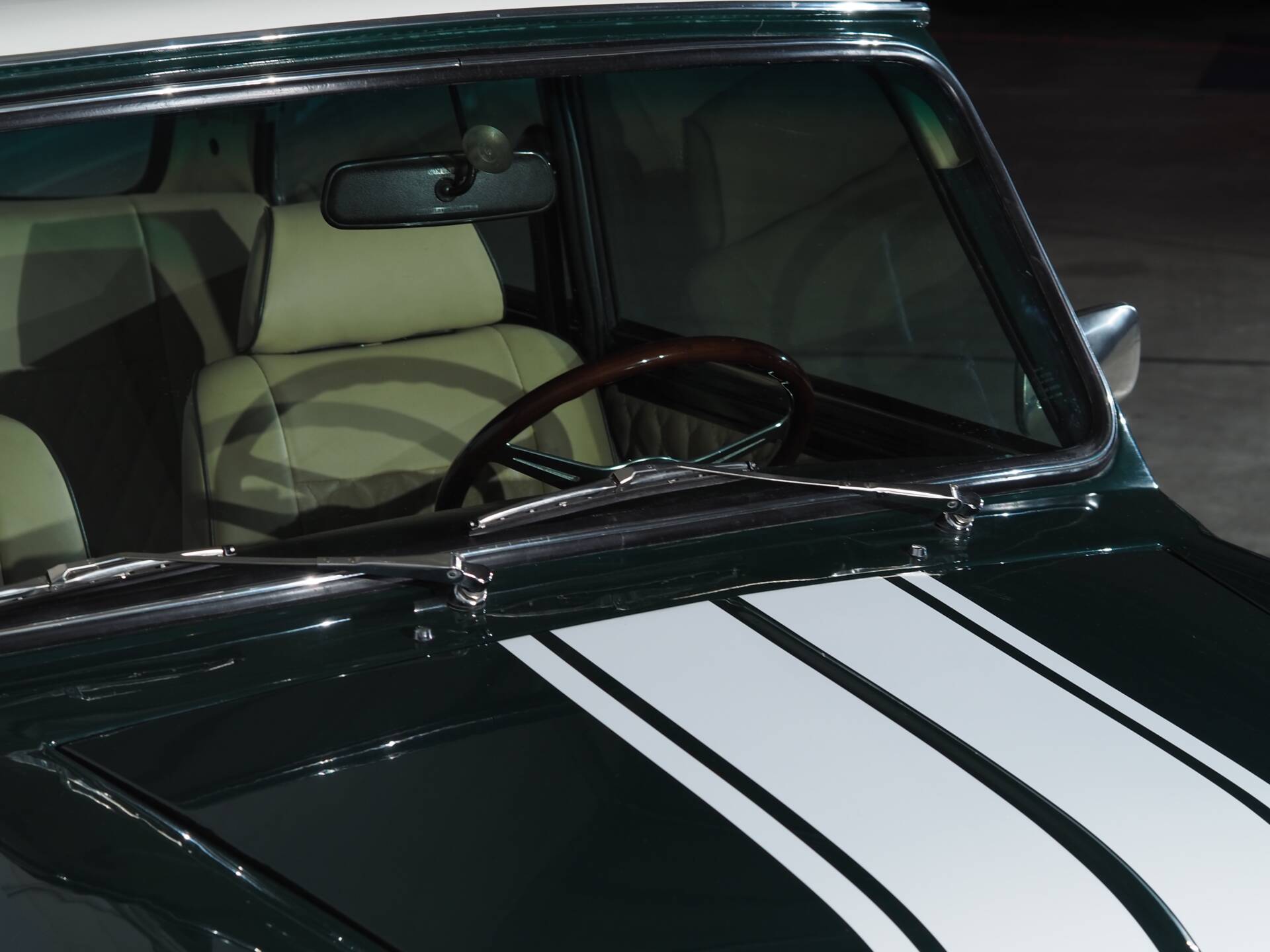 The Mini is presented in a sophisticated British Racing Green, accented with white stripes that stylishly underscore its sporty character. The proportions are unmistakable—short, wide, and determined.