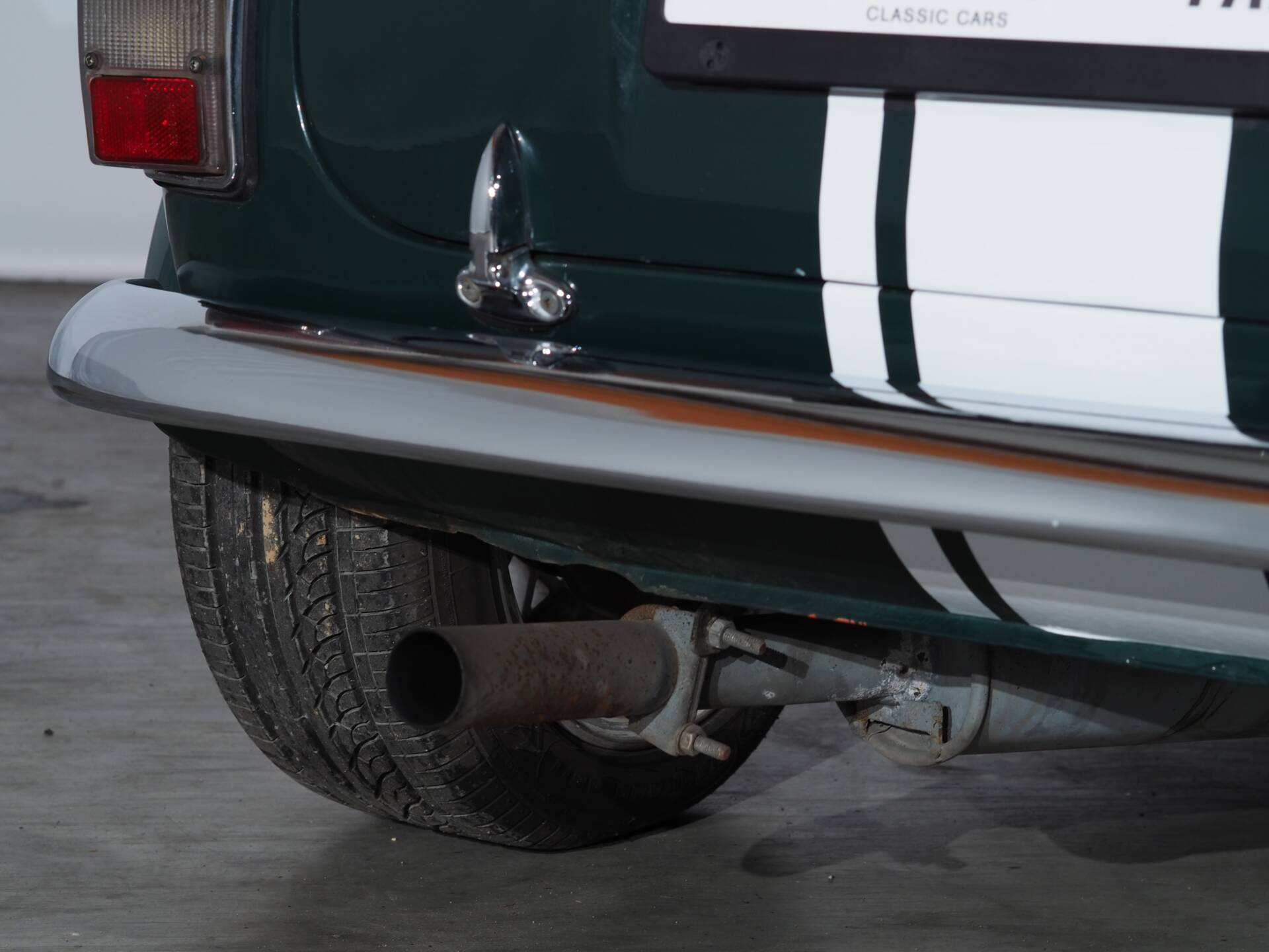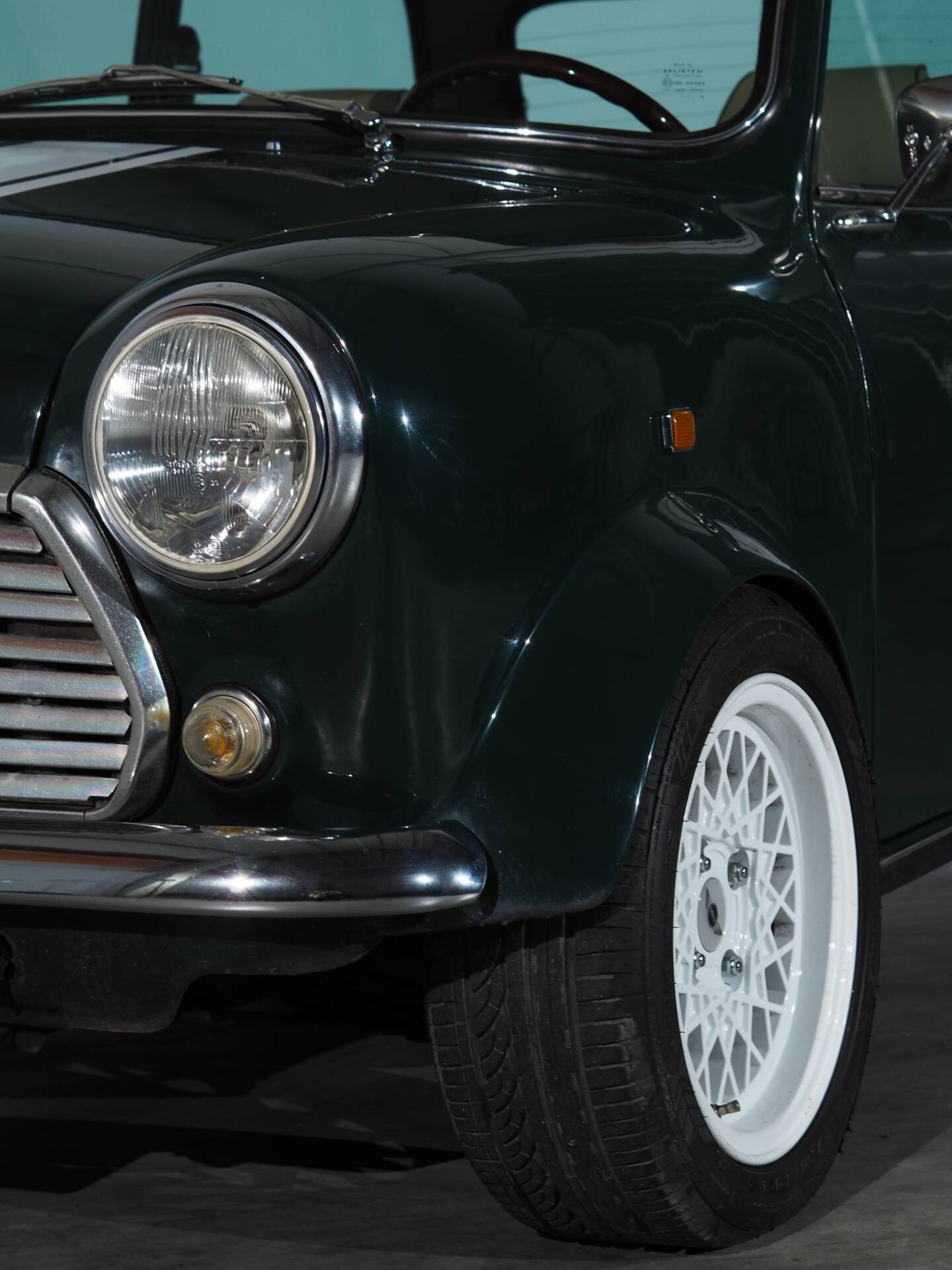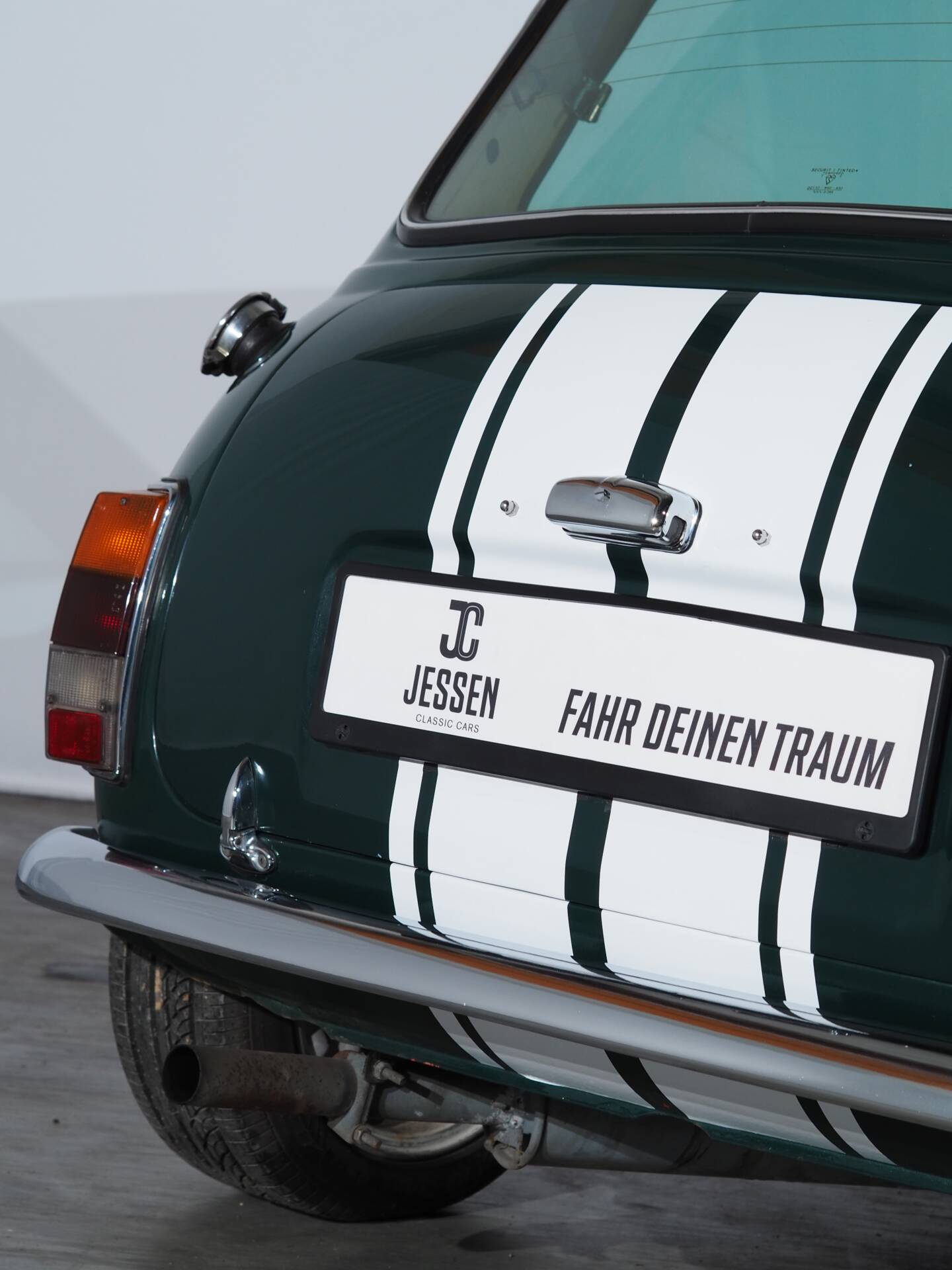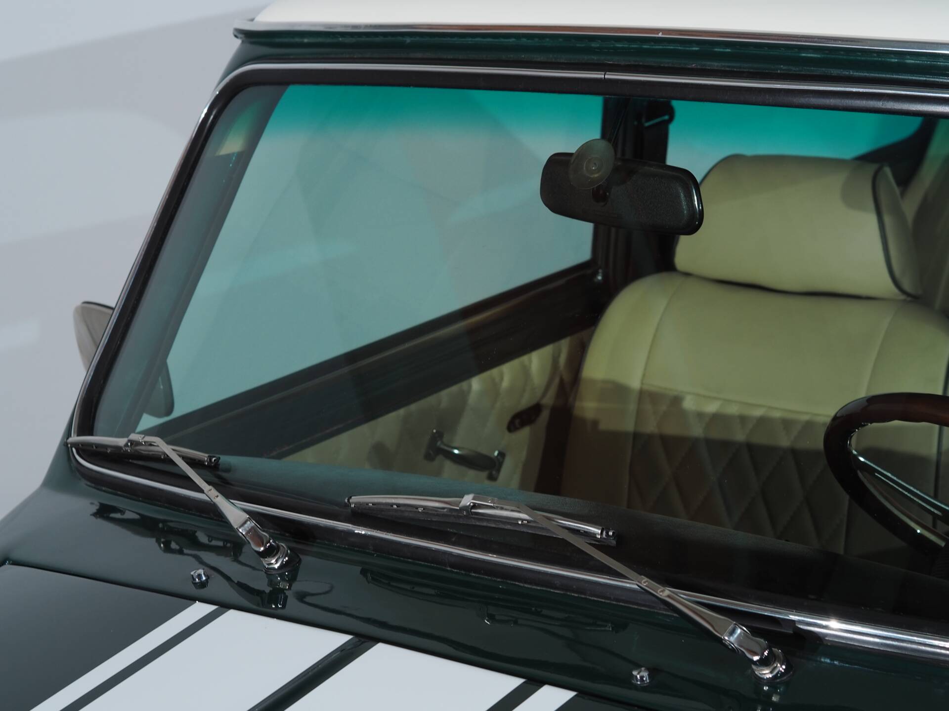 The Mini is presented in a sophisticated British Racing Green, accented with white stripes that stylishly underscore its sporty character. The proportions are unmistakable—short, wide, and determined.