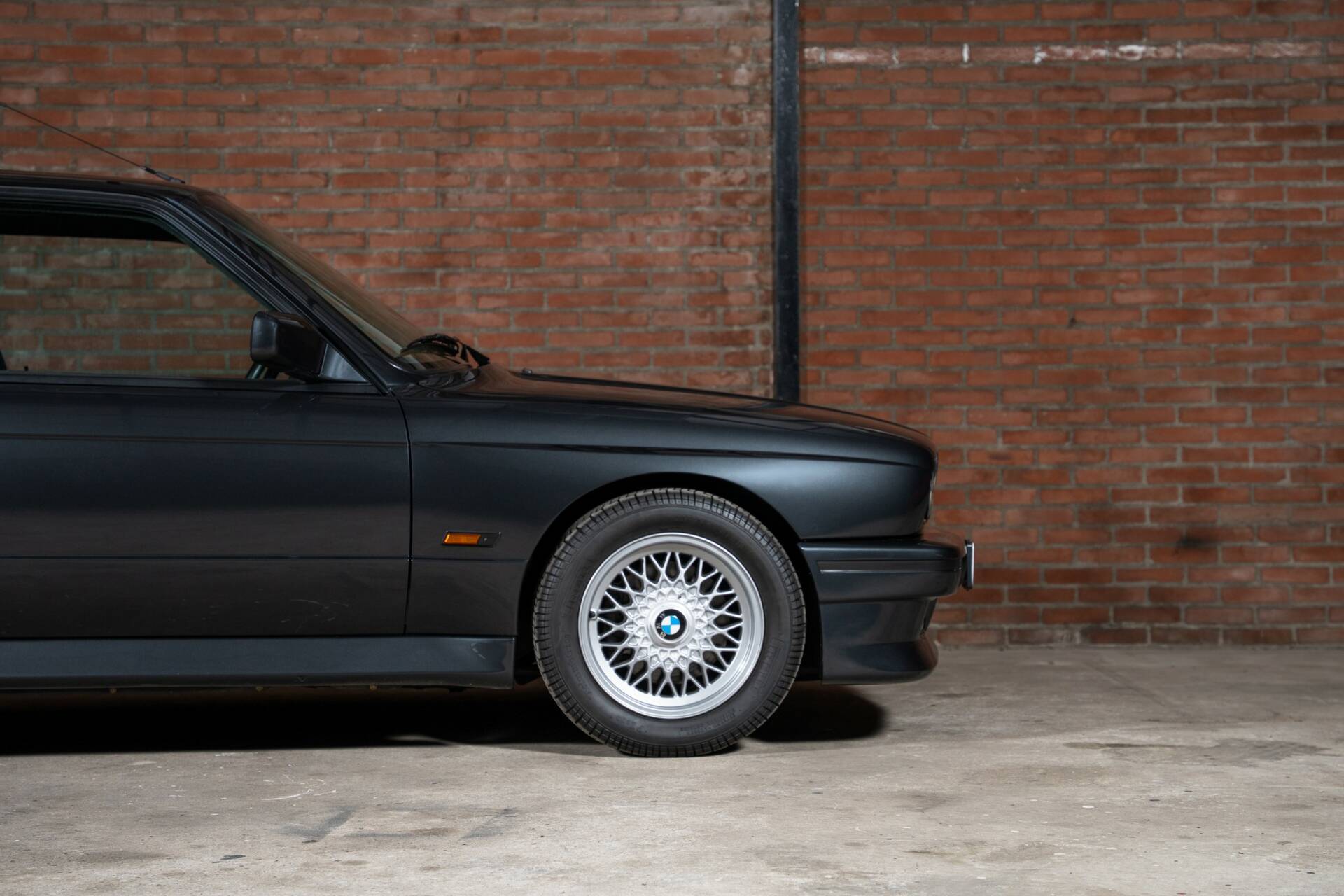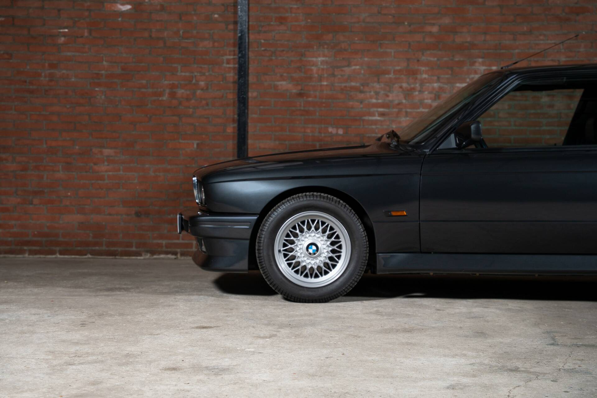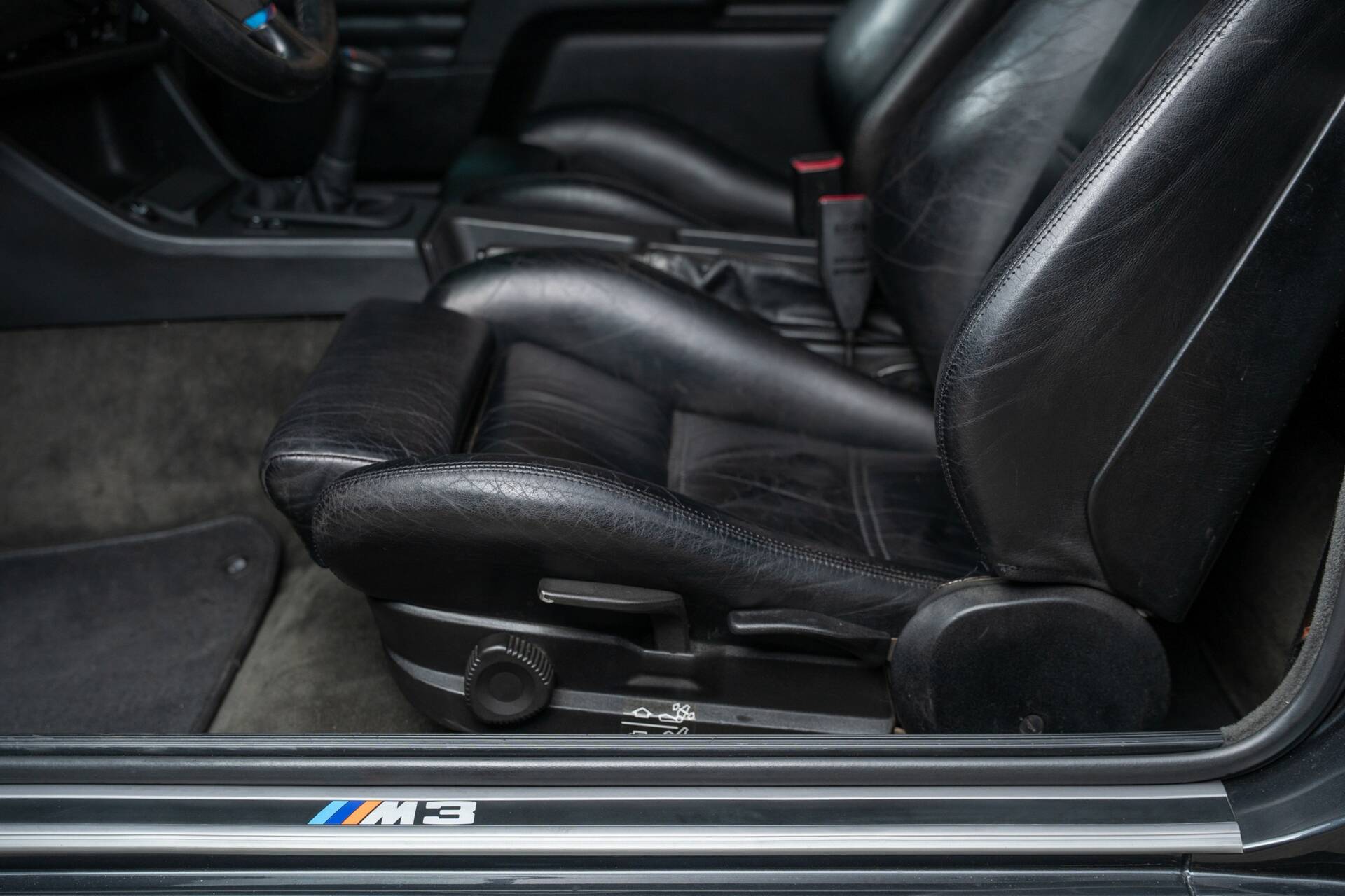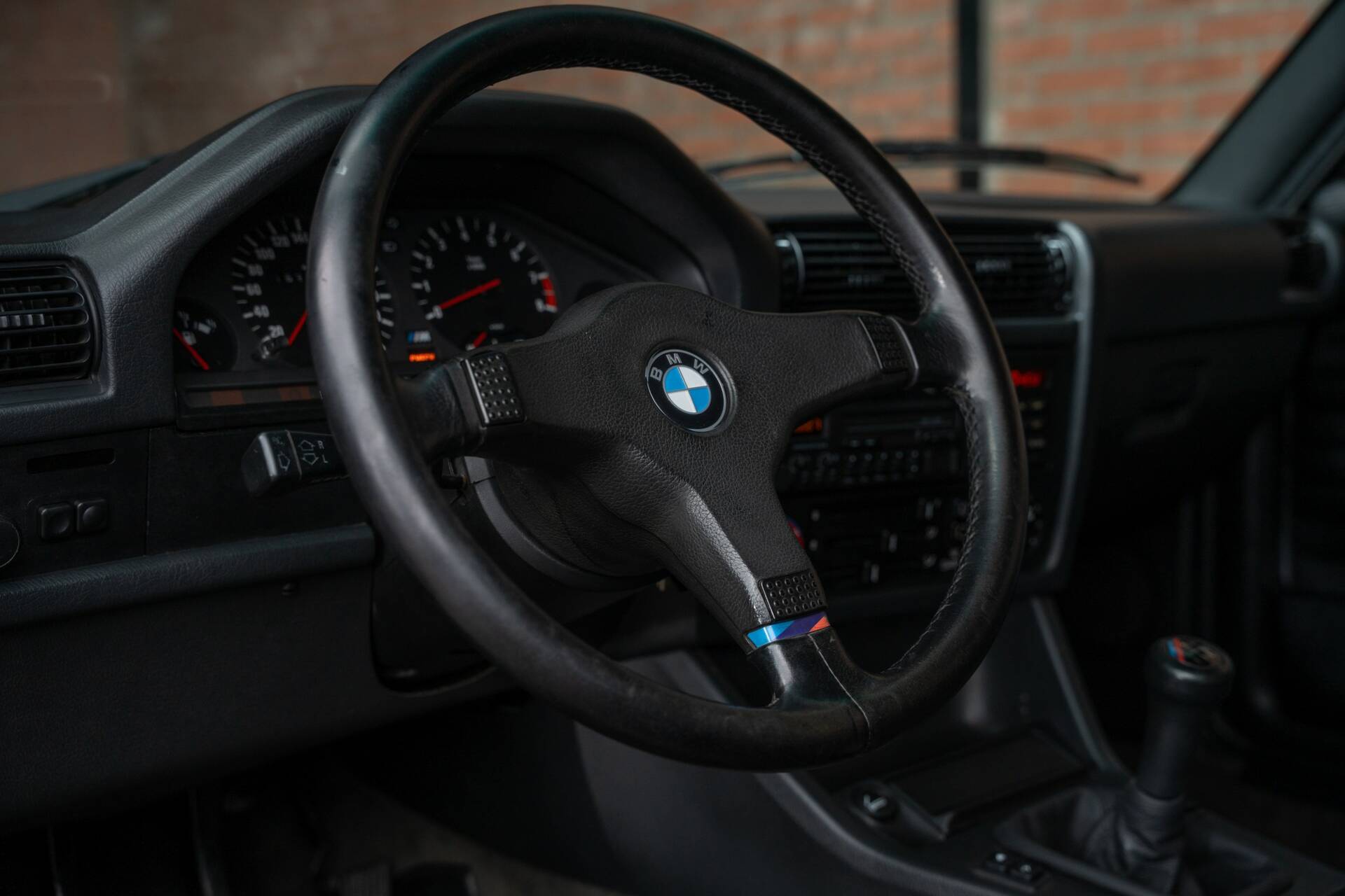 Het exterieur is werkelijk in uitmuntende staat. De kenmerkende brede schermen zijn niet zo vormgegeven voor de uitstraling! Ze geven ruimte aan een vergrote spoorbreedte, wat het haarscherpe stuurgedrag weer ten goede komt. Zijn plaatwerk is vrij van enige oneffenheden en/of schades en zijn ‘diamant zwart’ afwerking toont een diepe glans. De diepe kleur komt tot leven wanneer de auto buiten in de zon word genoten. In tegenstelling tot de standaard E30 heeft de M3 aerodynamisch geoptimaliseerde buitenspiegels. Zijn originele BBS styling 5 velgen zijn eveneens volledig vrij van beschadigingen en voorzien van Pirelli P Zero banden in de maat 225/50ZR15 (DOT code 09/19). Verder is het voertuig voorzien van een elektrisch dakraam.