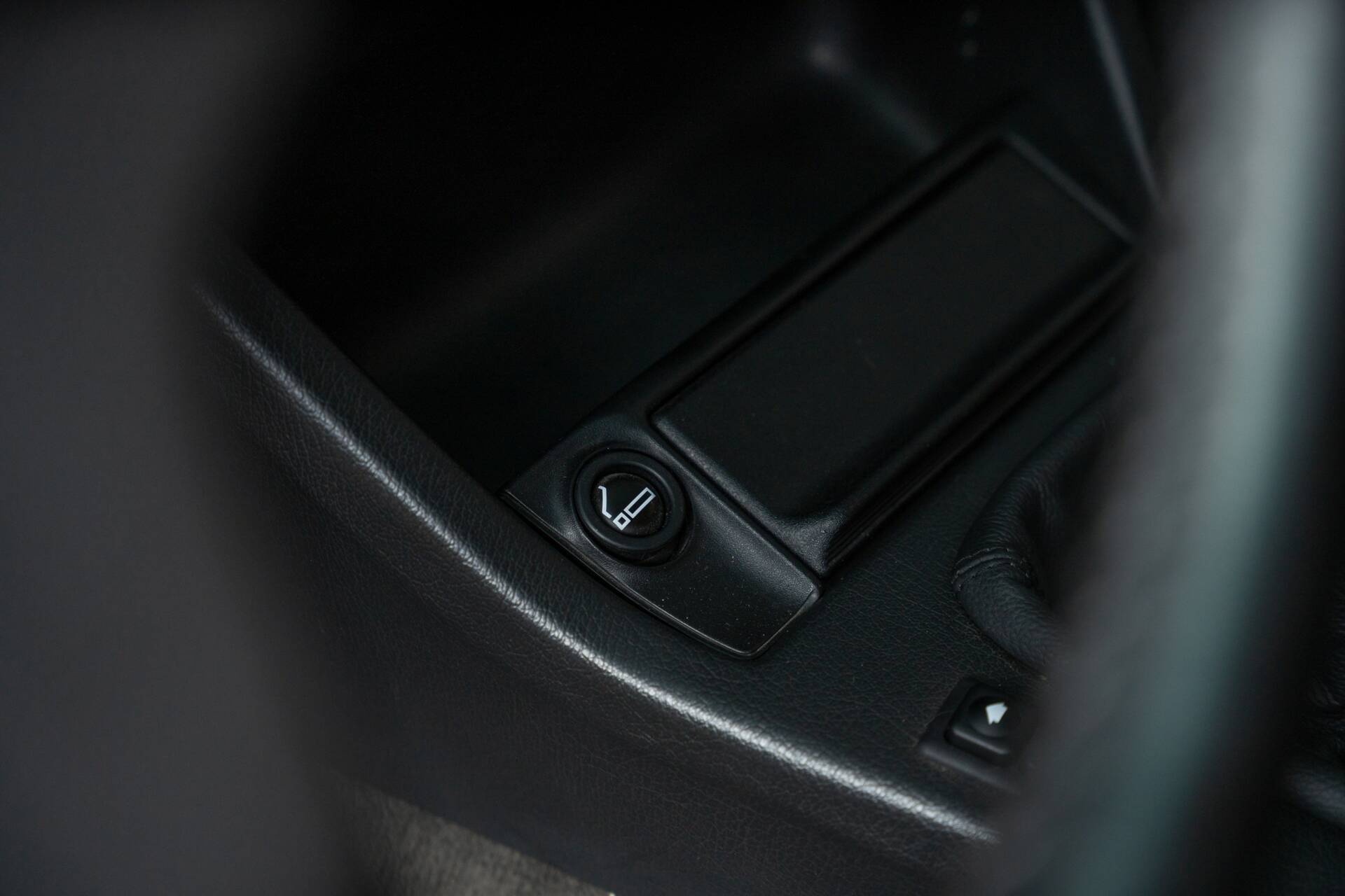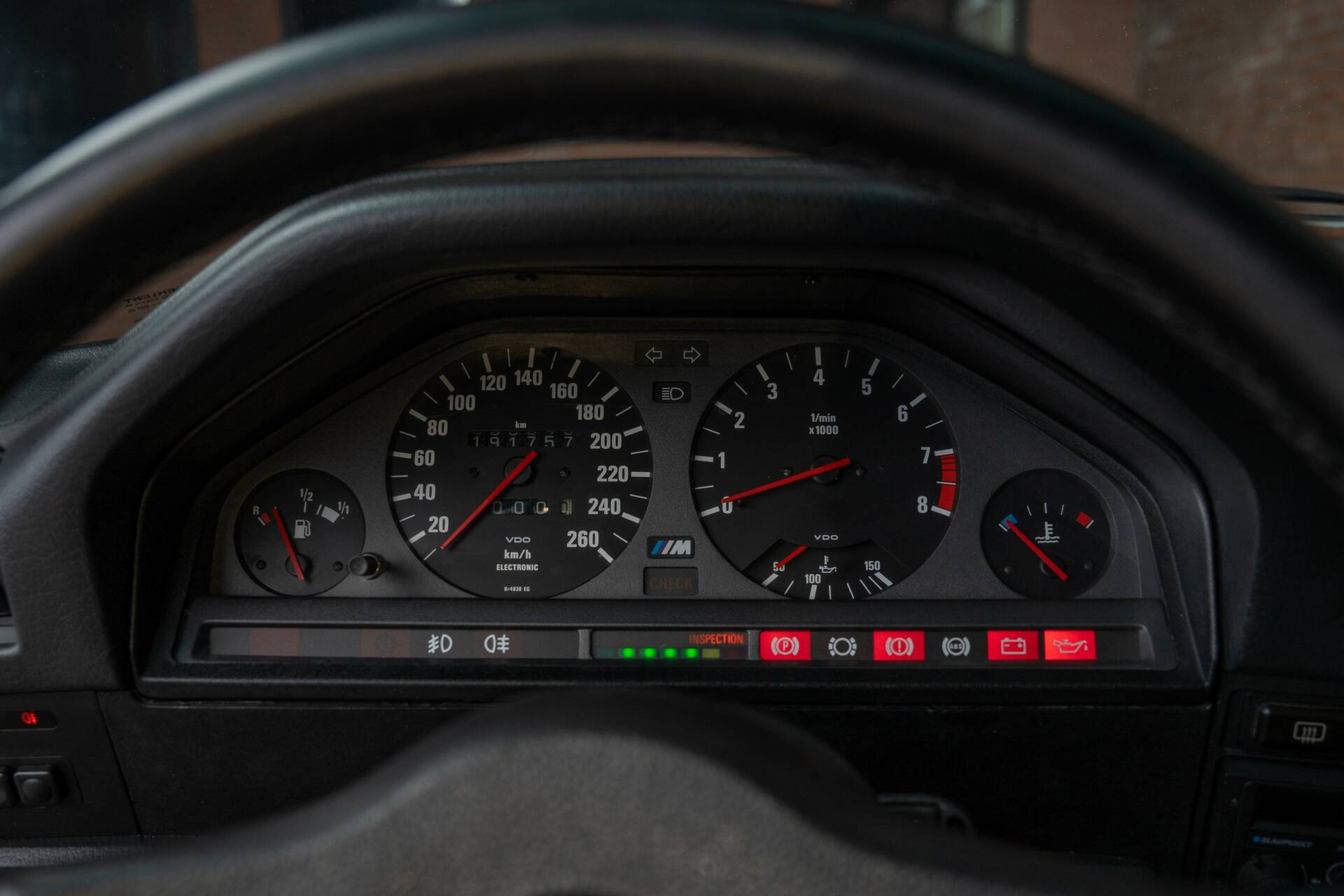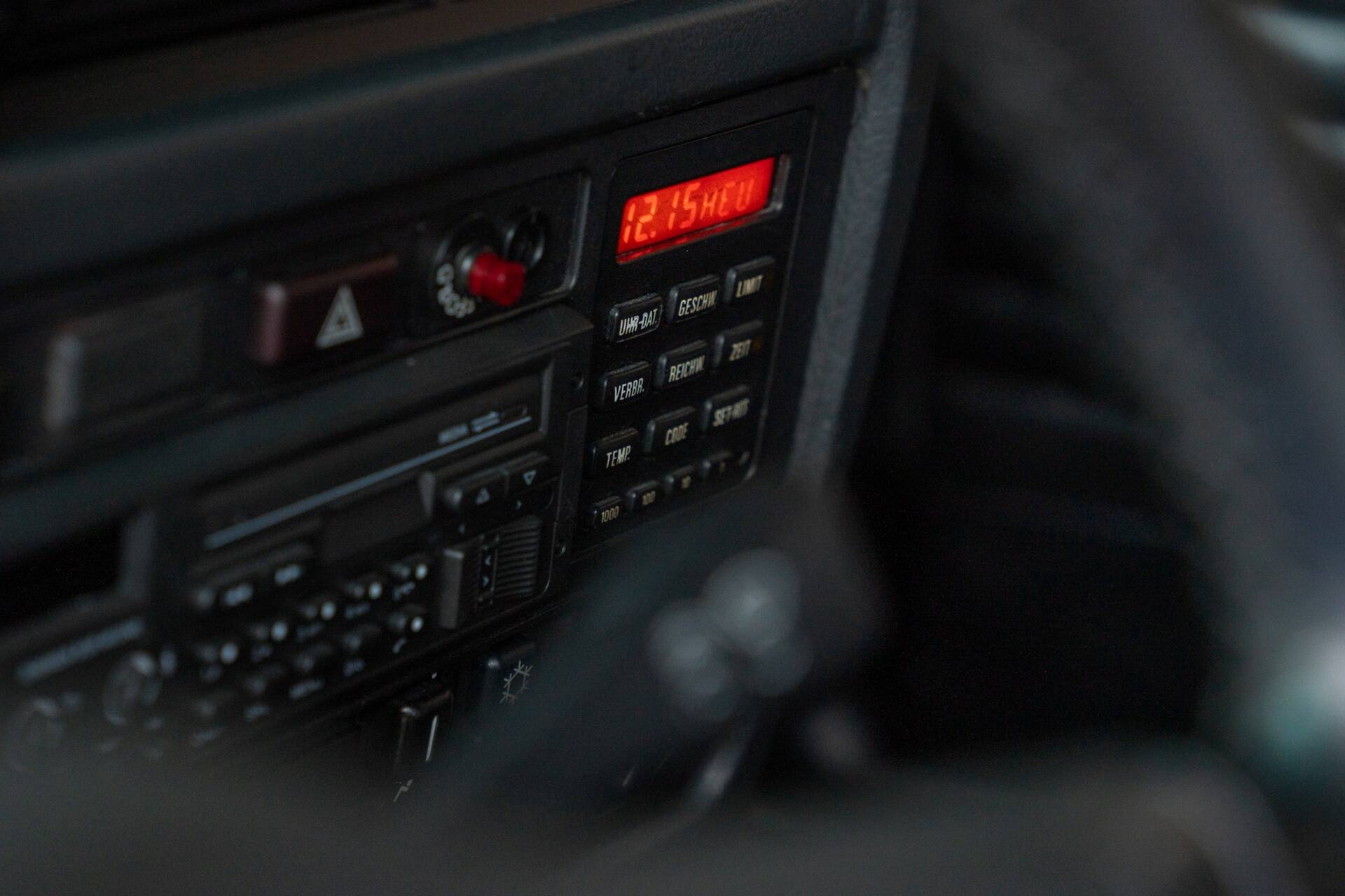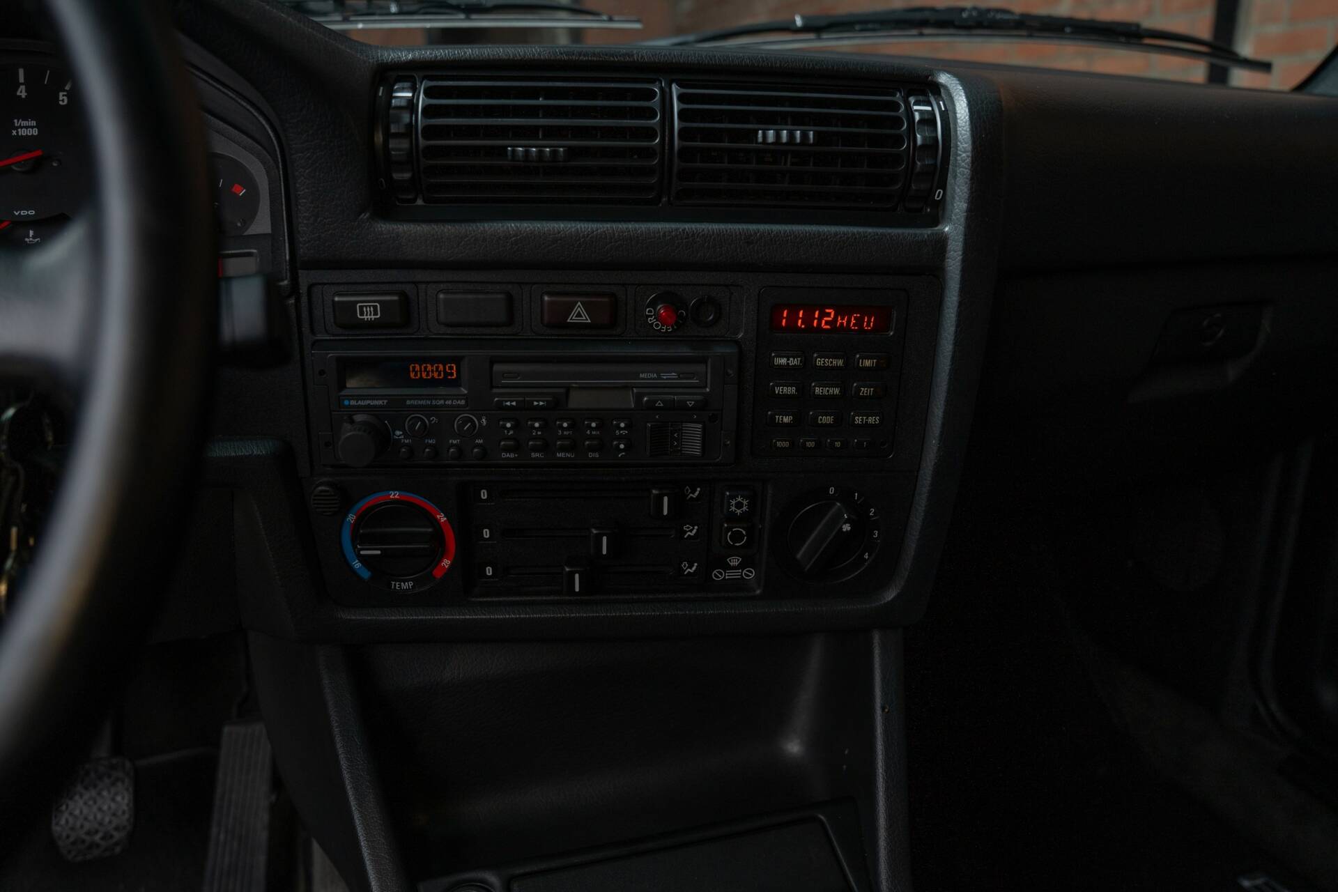 Bij het instappen aan de bestuurderszijde valt direct het zwart lederen interieur op dat werkelijk in topstaat verkeerd. Bij het plaatsnemen achter het M-tech 1 stuurwiel toont dat alles in perfecte staat verkeerd. De bestuurdersstoel zit sportief zoals bedoeld. De afgelezen tellerstand is 191716 kilometer. De versnellingspook oogt in nieuwstaat en laat zien dat het om een zogeheten ‘dogleg’ versnellingsbak gaat waarbij de 1e versnelling linksonder zit. Het elektrisch bedienbare schuif/kanteldak verzorgt voor verkoeling op een mooie zomerdag. Verder is het voertuig reeds voorzien van retro Blaupunkt Bremen SQR46 radio, hiermee heeft u de looks van een oude Blaupunkt maar de gemakken van de huidige tijd, zoals bluetooth streamen en carkit. Naast de radio merken we tevens een knop voor de airconditioning op! Alle elektronica functioneert verder naar behoren. De achterruit is voorzien van zonblinderingsscherm.
