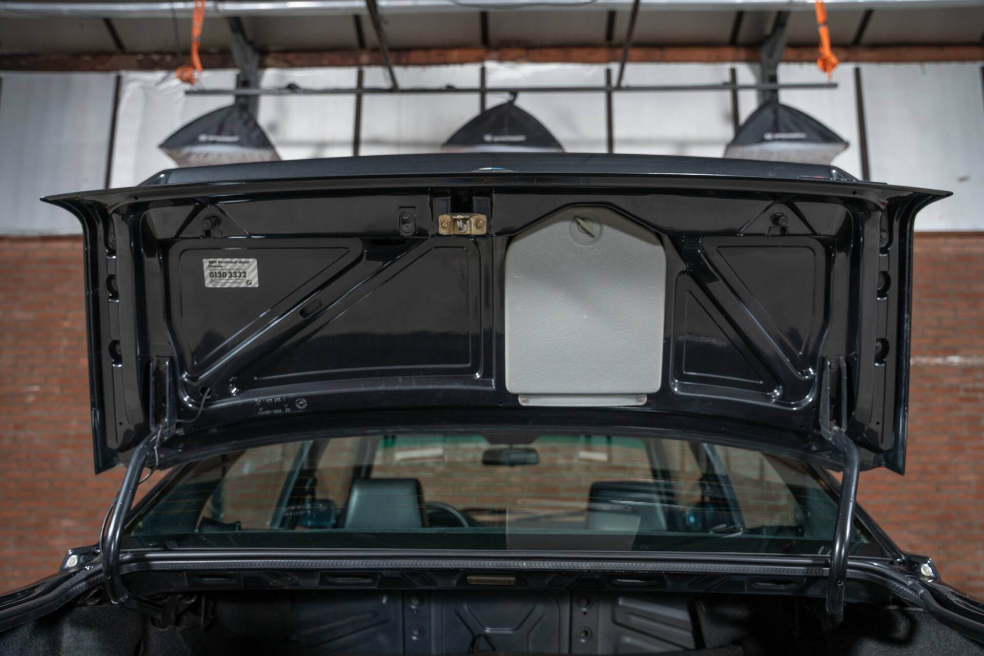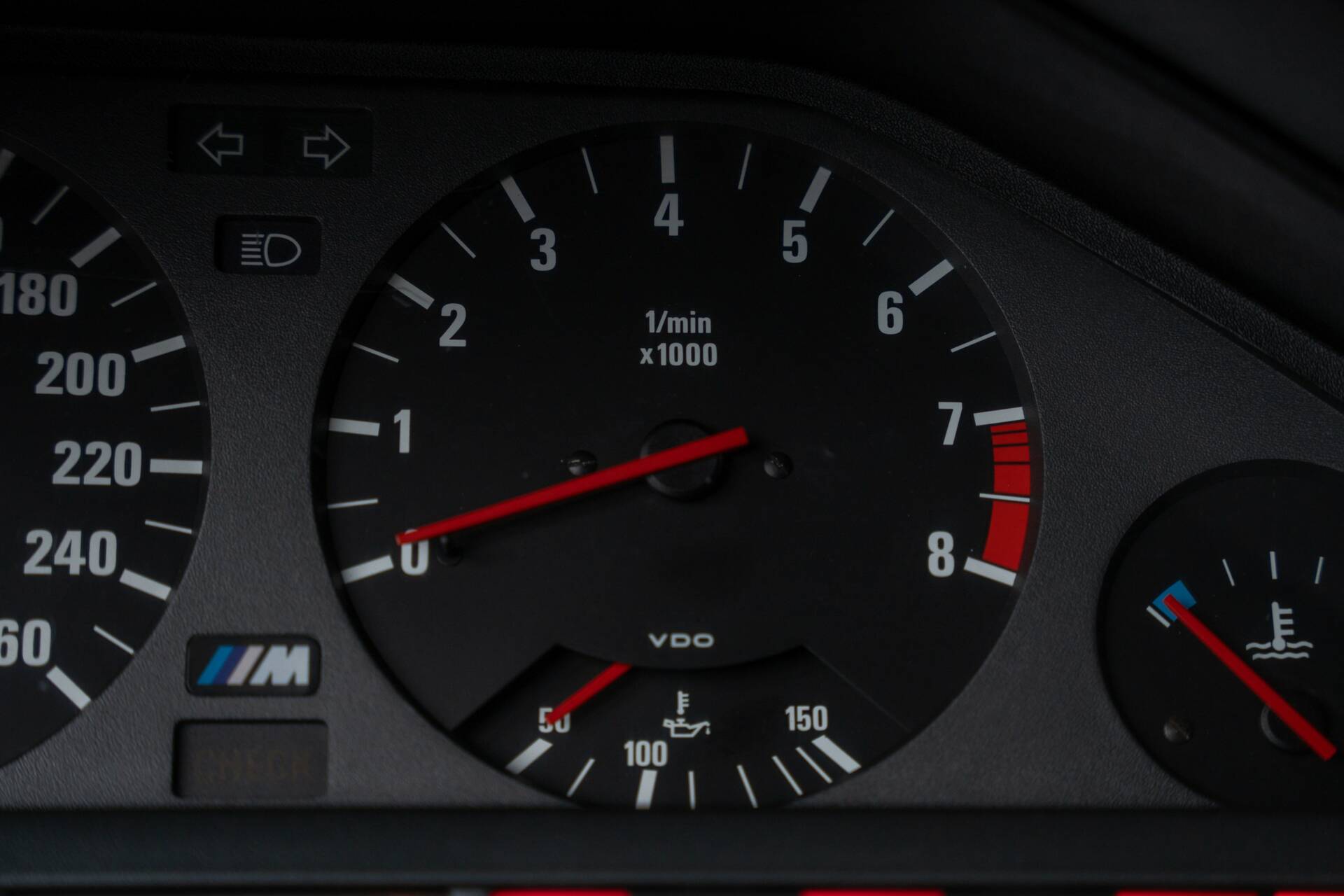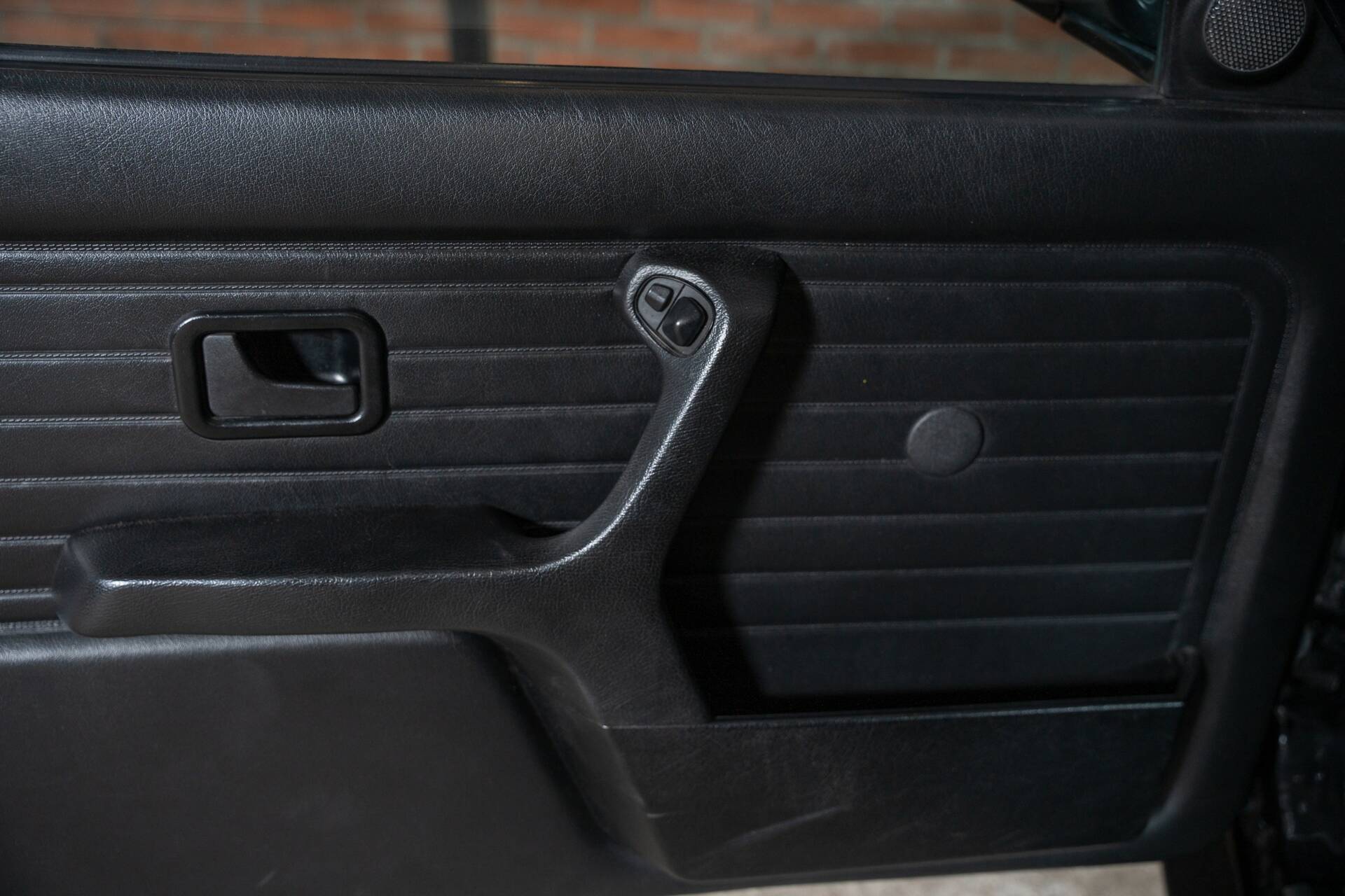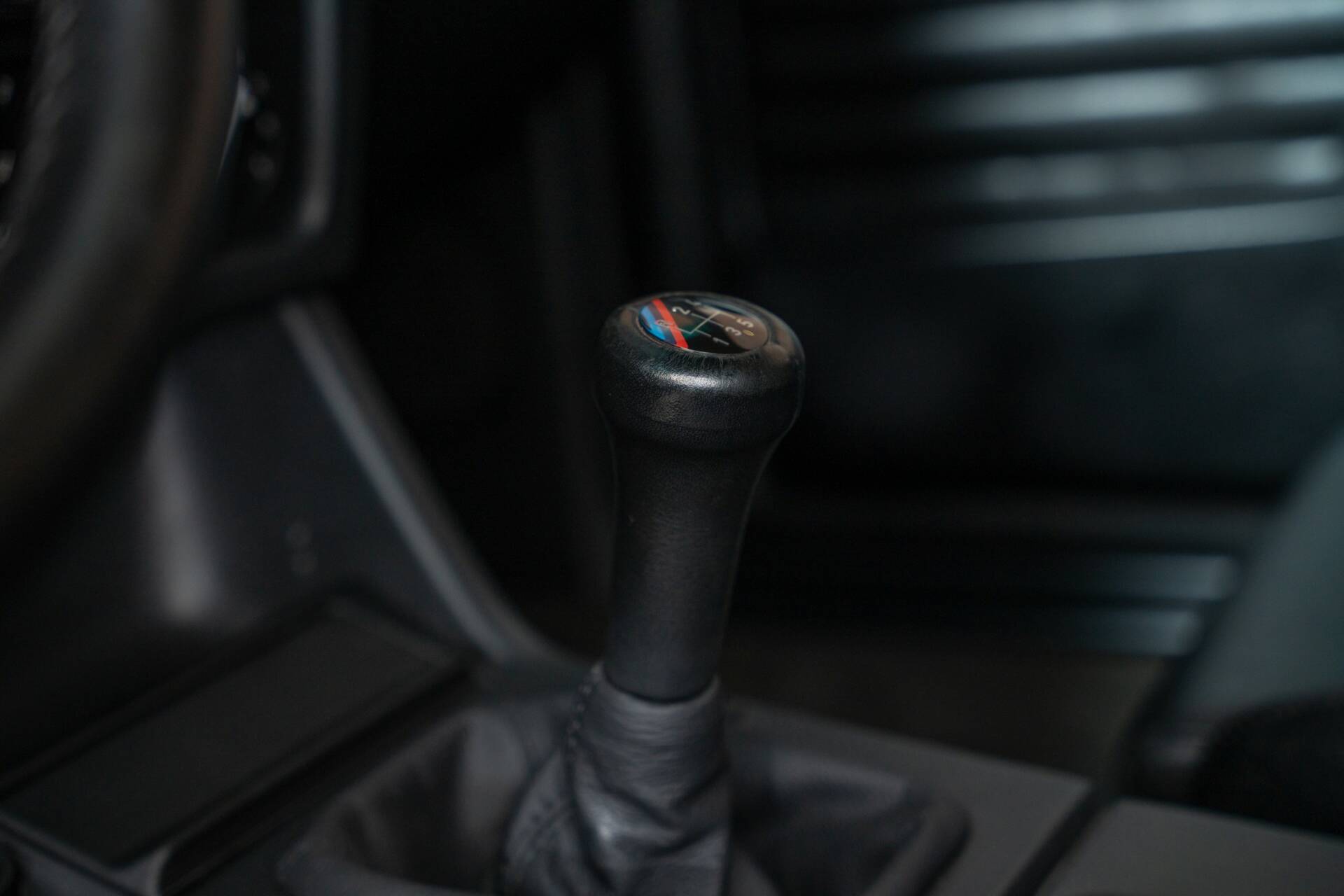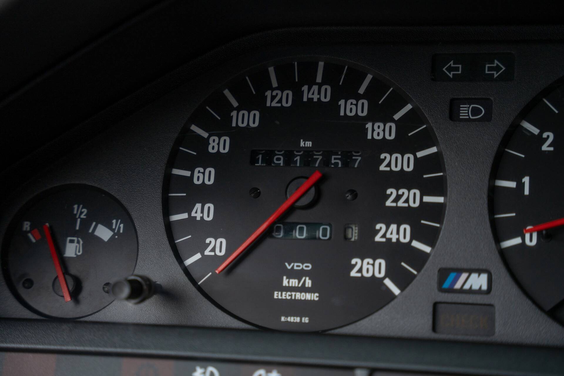 Bij het instappen aan de bestuurderszijde valt direct het zwart lederen interieur op dat werkelijk in topstaat verkeerd. Bij het plaatsnemen achter het M-tech 1 stuurwiel toont dat alles in perfecte staat verkeerd. De bestuurdersstoel zit sportief zoals bedoeld. De afgelezen tellerstand is 191716 kilometer. De versnellingspook oogt in nieuwstaat en laat zien dat het om een zogeheten ‘dogleg’ versnellingsbak gaat waarbij de 1e versnelling linksonder zit. Het elektrisch bedienbare schuif/kanteldak verzorgt voor verkoeling op een mooie zomerdag. Verder is het voertuig reeds voorzien van retro Blaupunkt Bremen SQR46 radio, hiermee heeft u de looks van een oude Blaupunkt maar de gemakken van de huidige tijd, zoals bluetooth streamen en carkit. Naast de radio merken we tevens een knop voor de airconditioning op! Alle elektronica functioneert verder naar behoren. De achterruit is voorzien van zonblinderingsscherm.