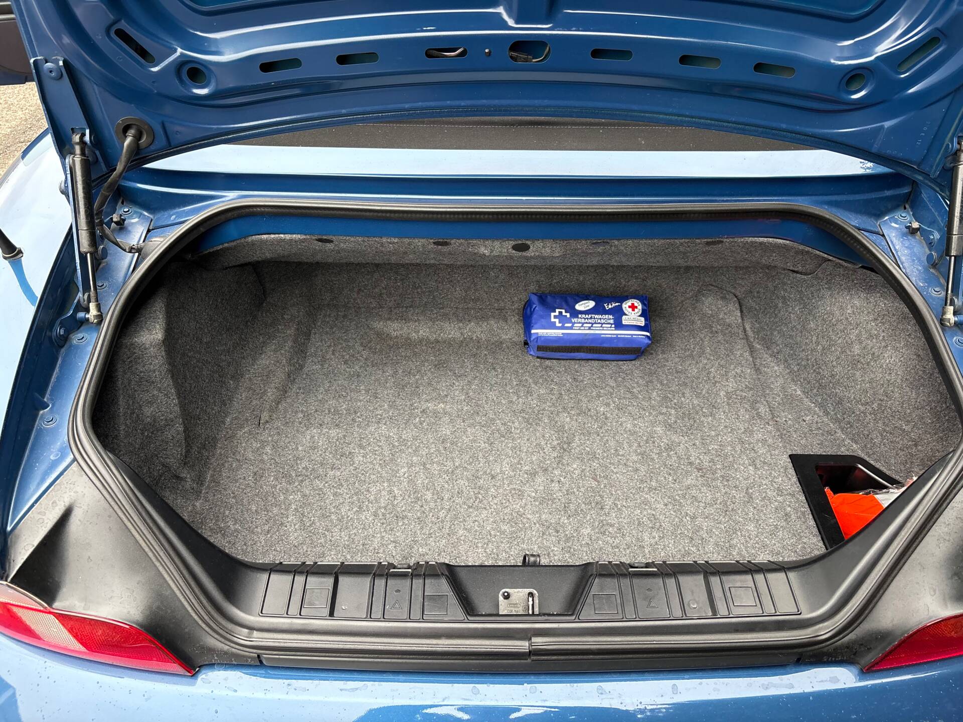 La carrozzeria è blu metallizzato, abbinata a una capote nera in ottimo stato, che si integra perfettamente con il carattere sportivo e raffinato della vettura. Gli interni sono in colore nero, ben conservati, con sedili e plancia in condizioni molto buone, mantenendo il fascino originale del modello.