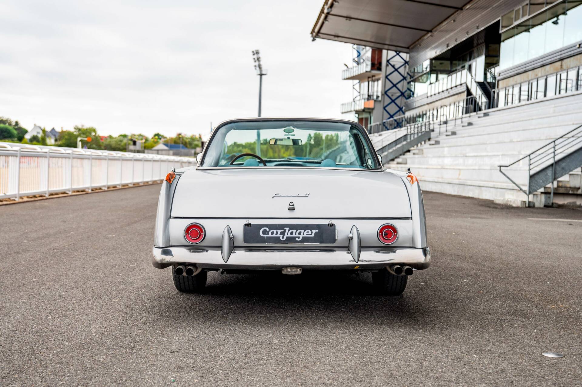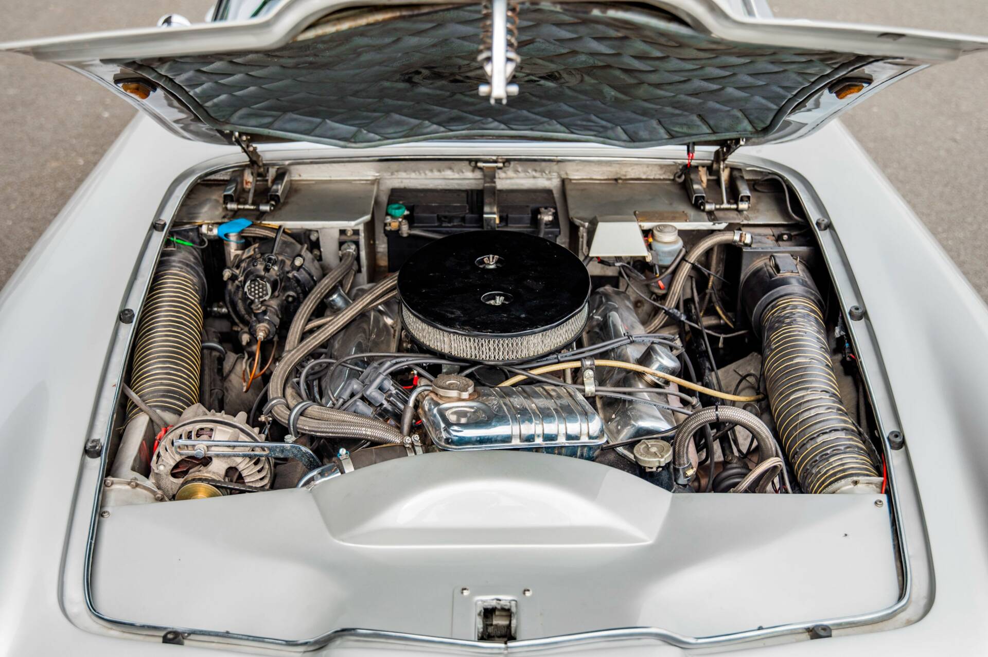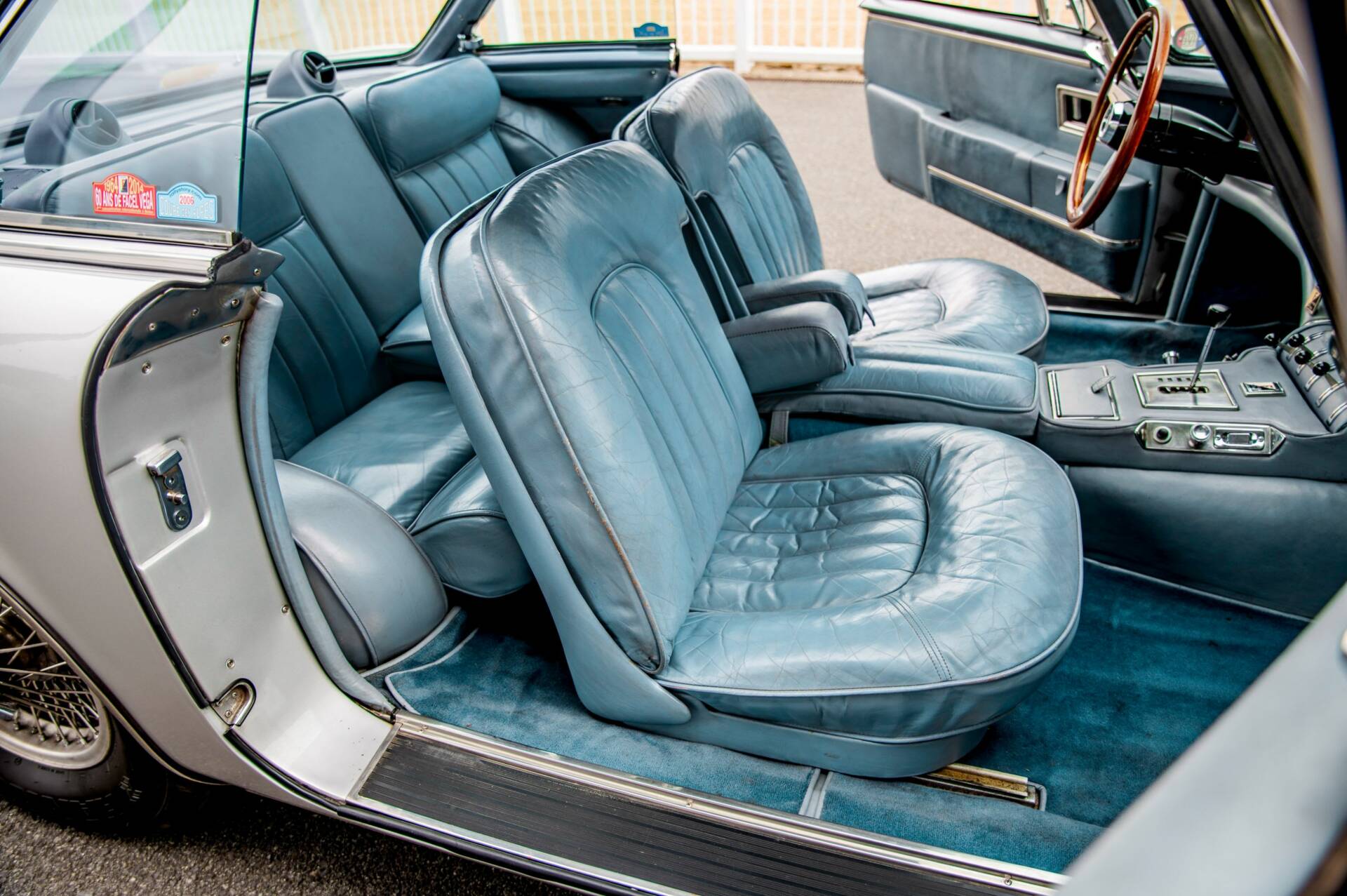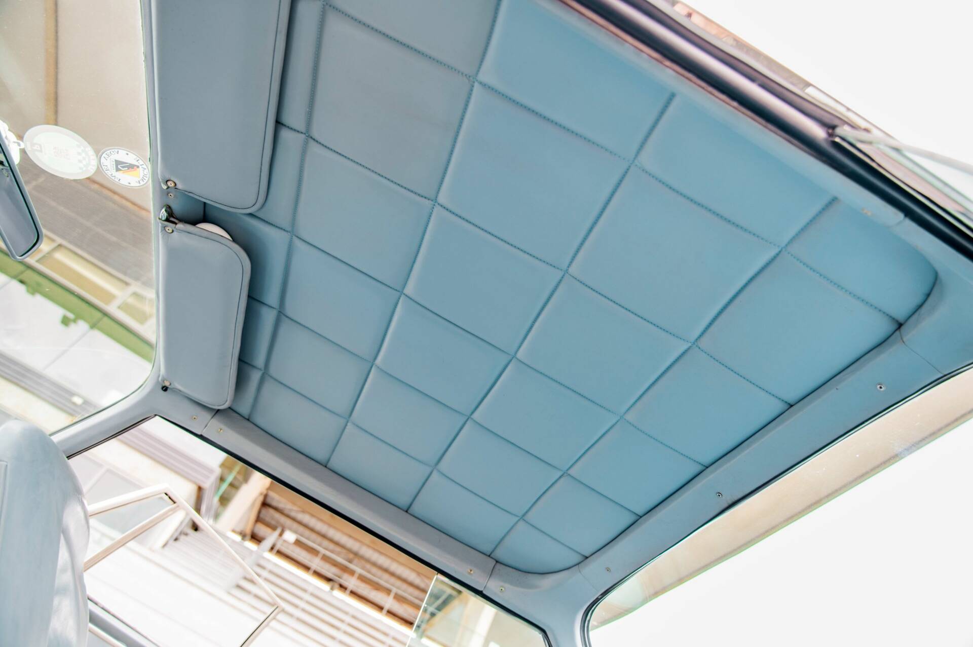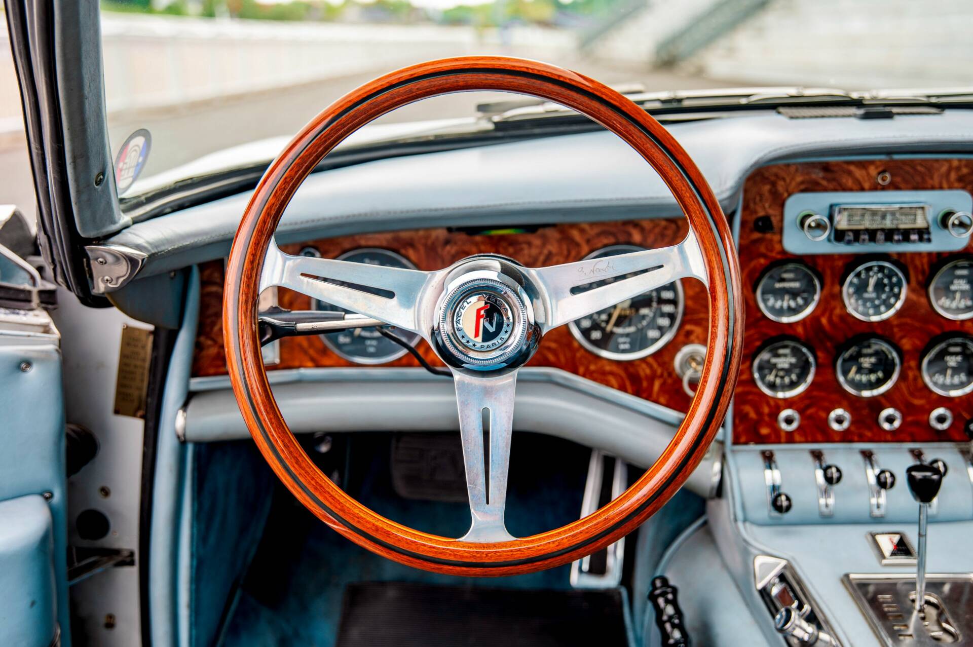 A bord, les sièges en cuir bleu sont en bon état. Nous pouvons relever quelques traces d’usures du cuir à plusieurs endroits mais cela reste cohérent au vu de l’âge de l’auto. La planche de bord peinte est en bonne condition. Le ciel de toit en cuir à damier est bien tendu. L’instrumentation de bord est fonctionnelle. L’auto est équipée d’un poste radio PO-GO et d’un magnifique volant en acajou Nardi.