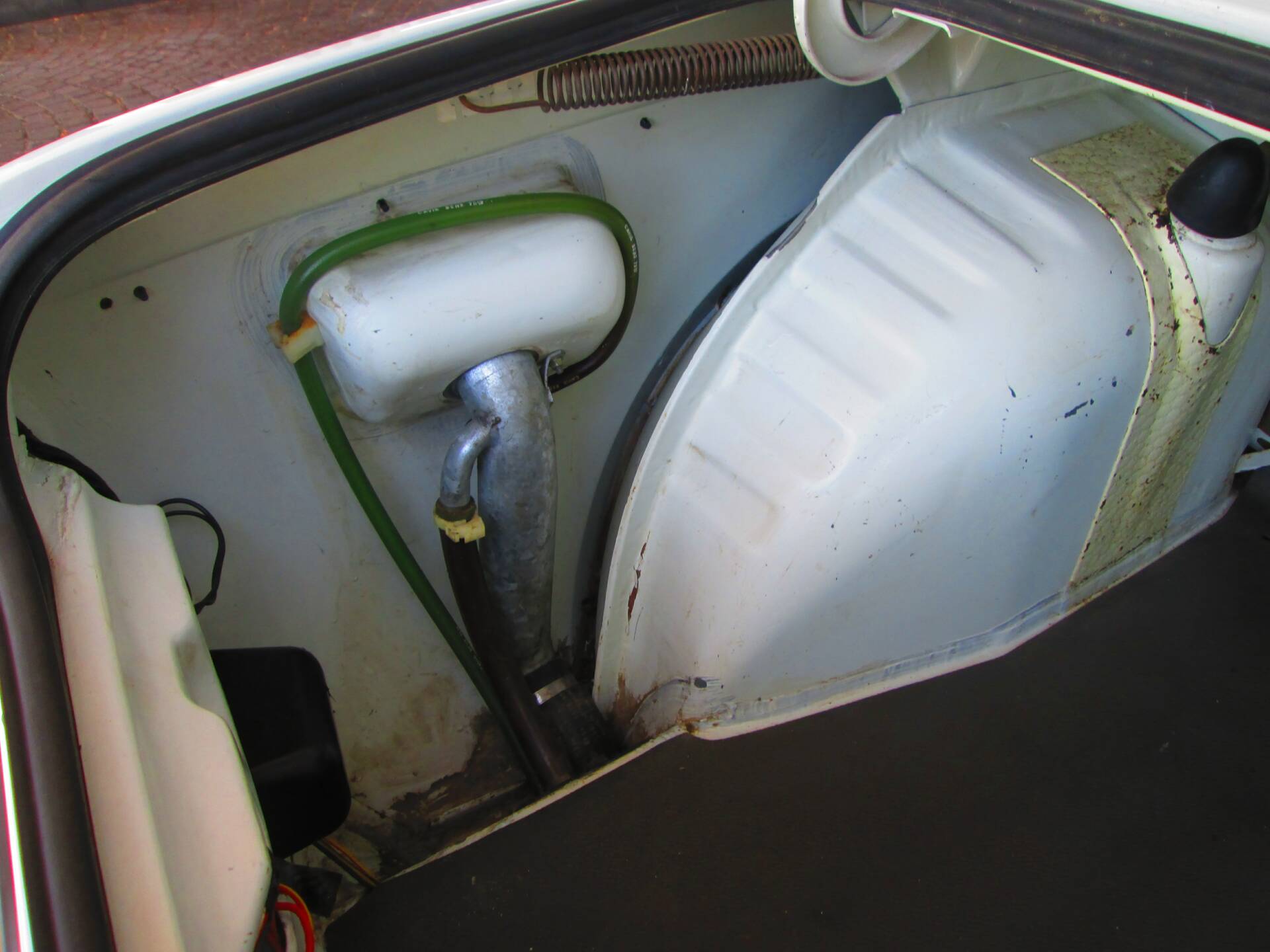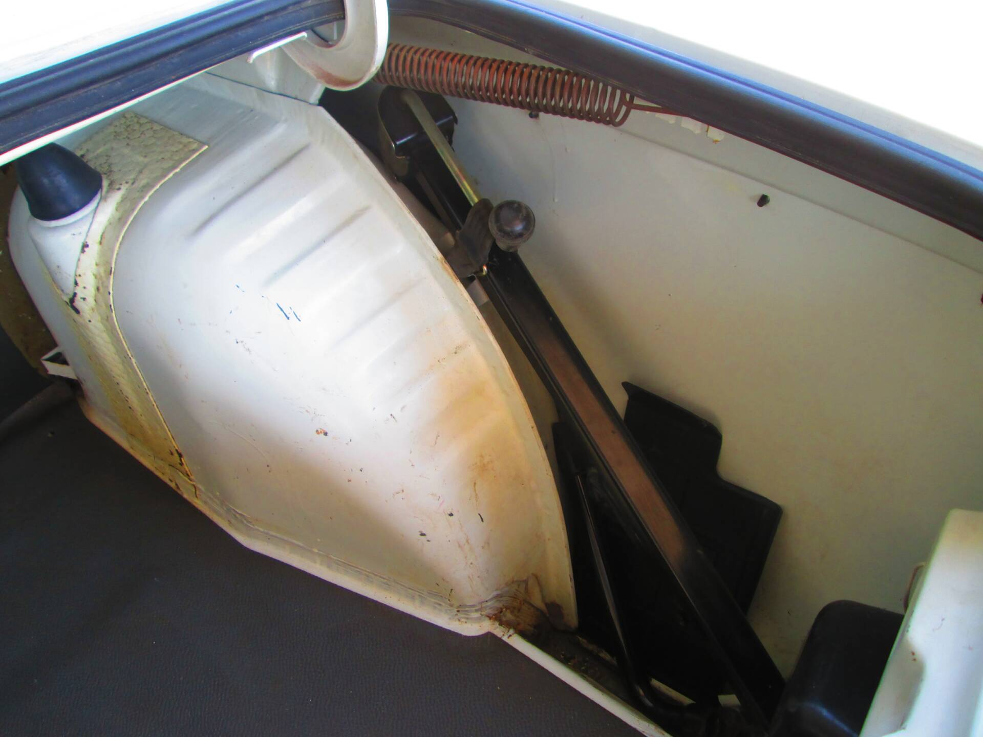 La vettura è descritta come conservata in condizioni originali, con una carrozzeria che mostra segni d’uso compatibili con l’età, senza che ciò comprometta l’insieme. La patina del tempo è parte integrante del suo fascino e testimonia un percorso di vita non alterato da restauri invasivi. Non vengono segnalati interventi di ripristino estetico rilevanti; l’impressione generale è quella di un’auto onesta e coerente con la propria storia.