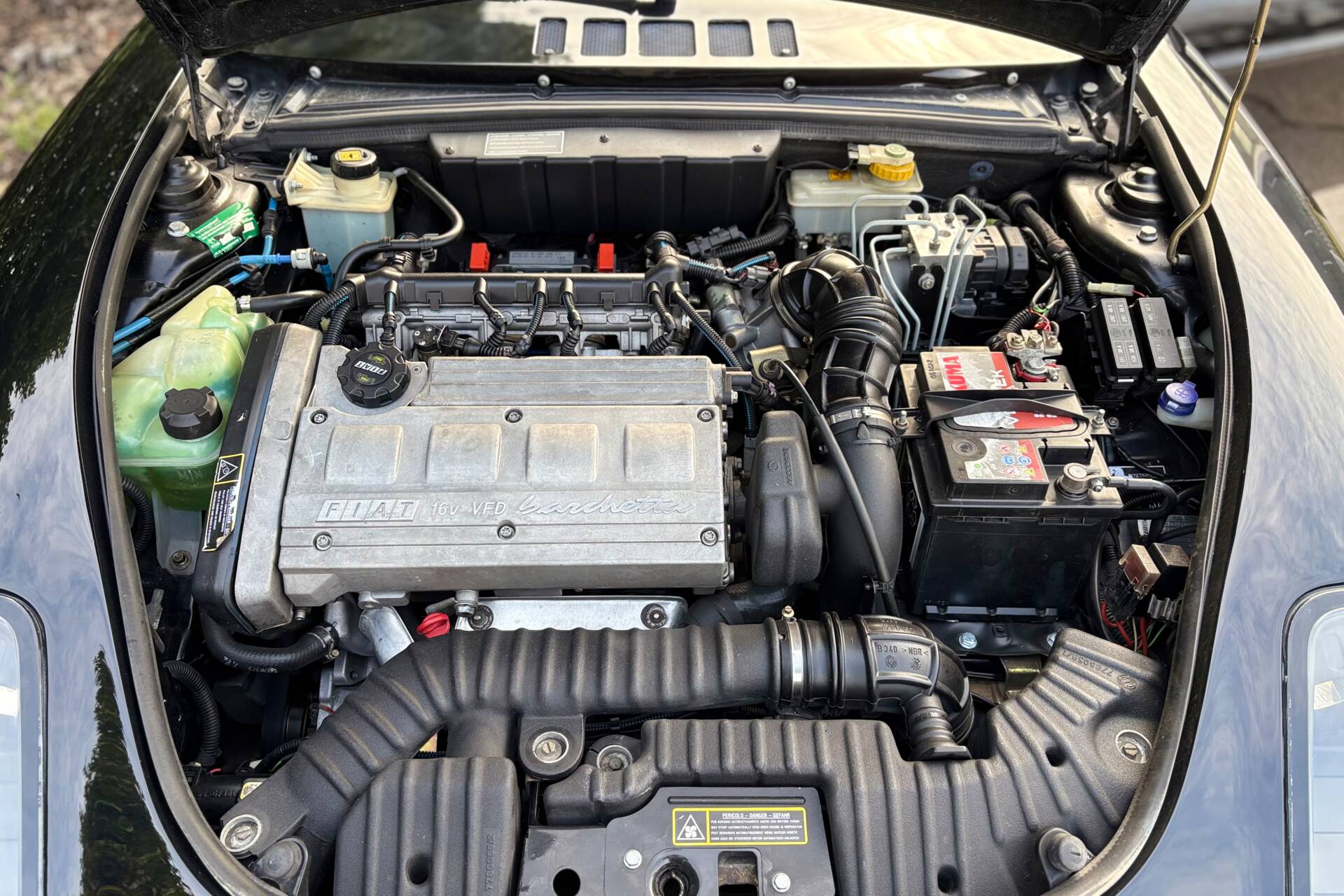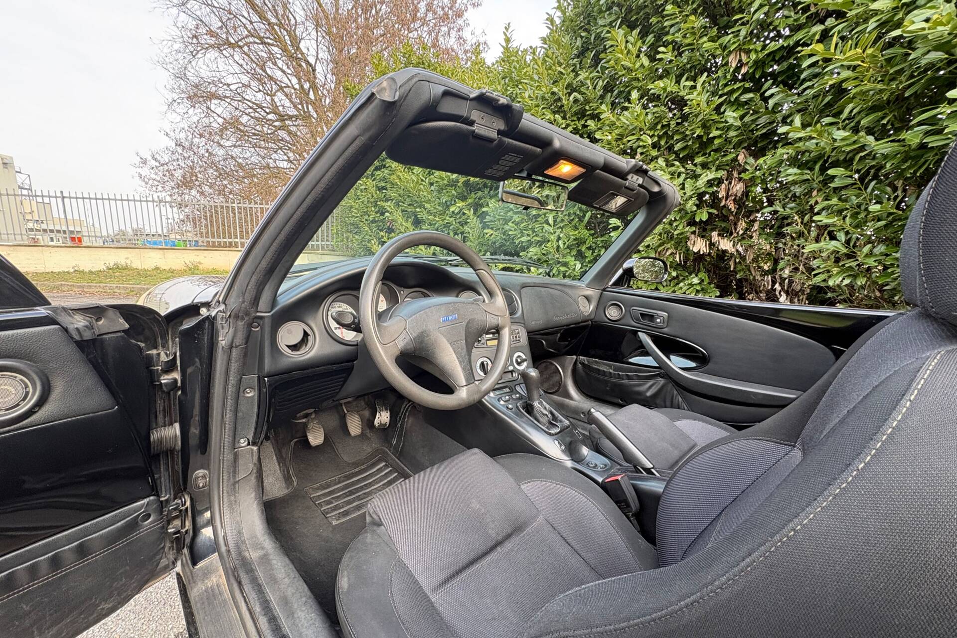 L’auto ha percorso soltanto 94.000 km, un chilometraggio contenuto che riflette una buona cura nel tempo. La carrozzeria è nera, elegante e sportiva, abbinata alla capote nera in ottime condizioni, che si integra perfettamente con il design compatto e armonioso della vettura.