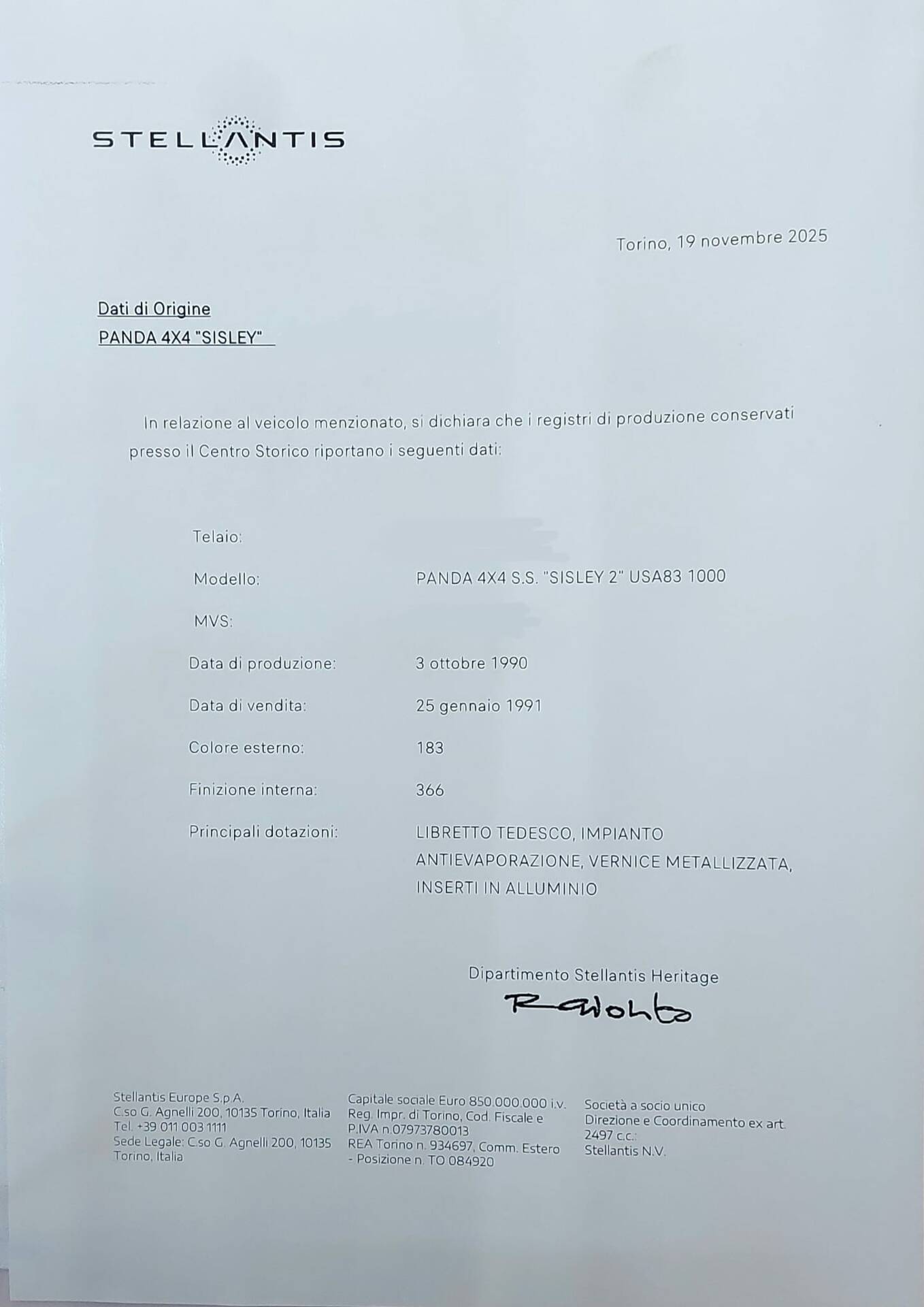 -Immatricolazione: 25 Gennaio 1991