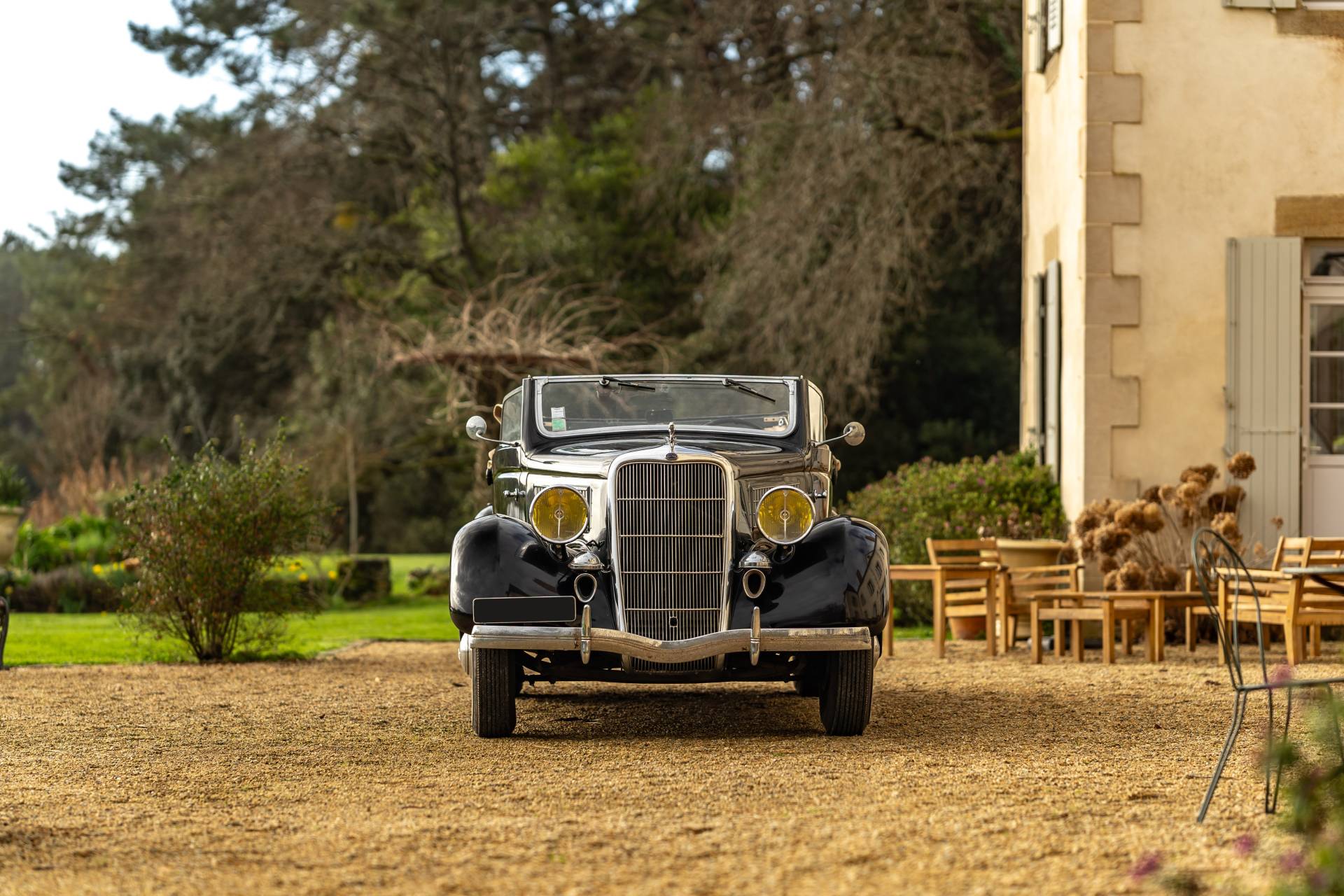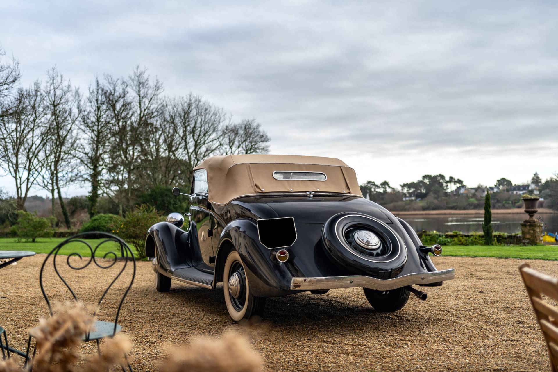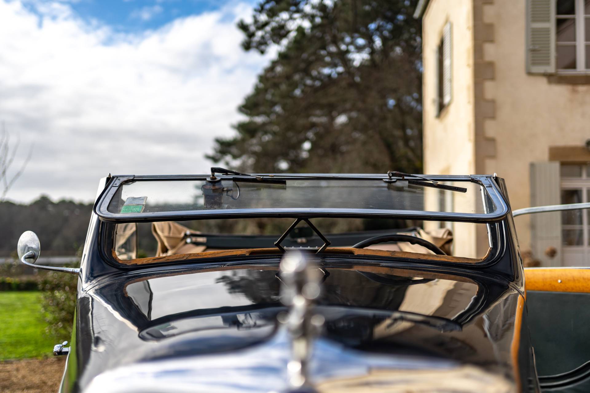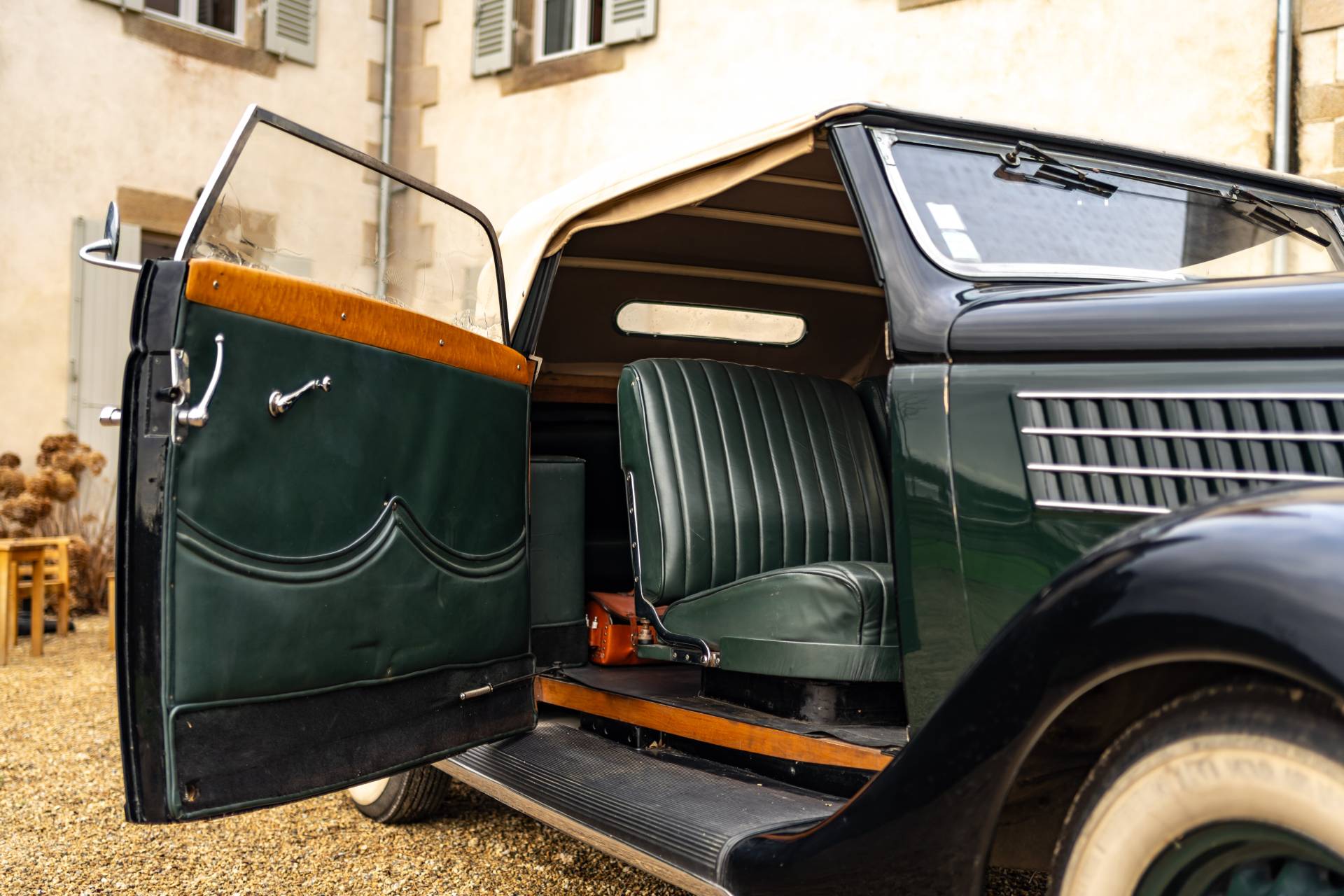 Extérieur : La carrosserie réalisée est en excellent état. La peinture de teinte verte et noir a été refaite lors de la restauration et présente aujourd’hui une très belle patine. La capote a été refaite à neuf il y a quelques années. Les chromes allant de l’imposante calandre aux enjoliveurs ont un très bel éclat, certains apprécieraient néanmoins d’apporter quelques attentions aux pare-chocs.