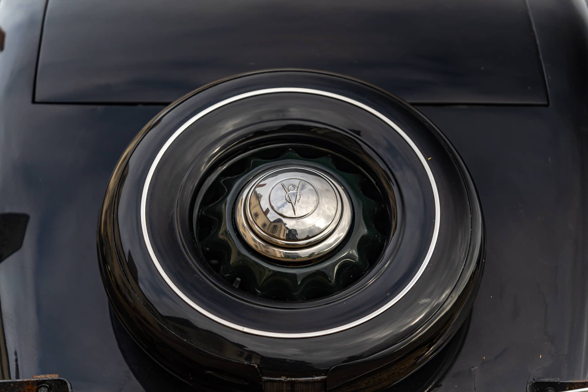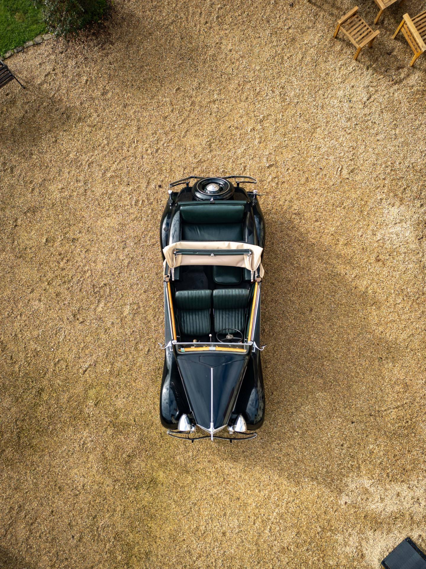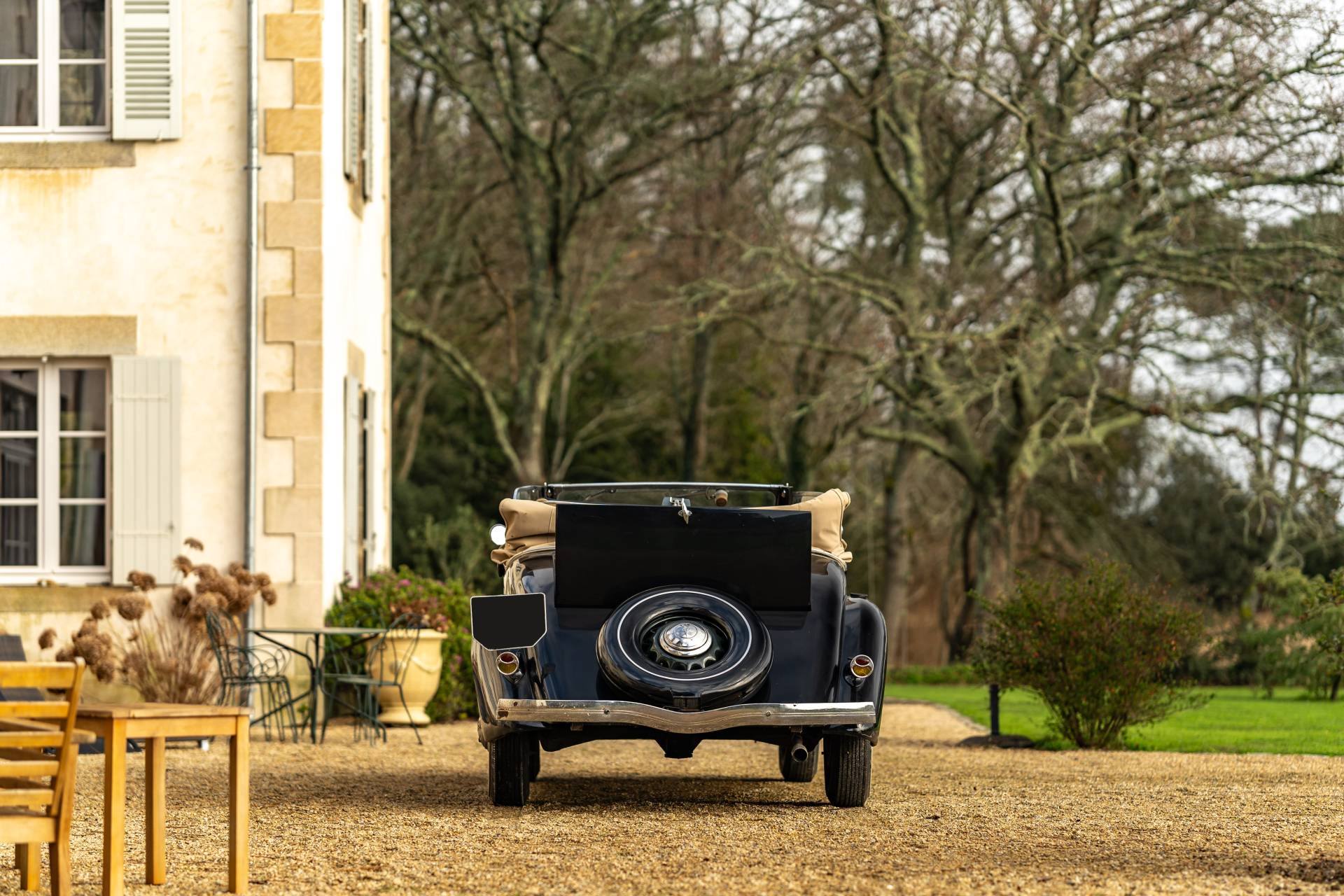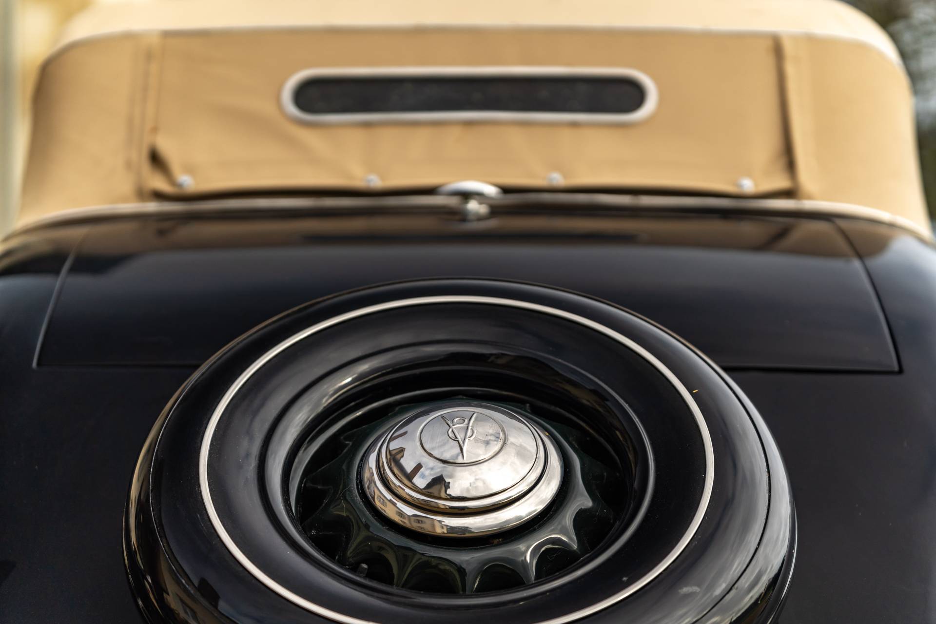 Extérieur : La carrosserie réalisée est en excellent état. La peinture de teinte verte et noir a été refaite lors de la restauration et présente aujourd’hui une très belle patine. La capote a été refaite à neuf il y a quelques années. Les chromes allant de l’imposante calandre aux enjoliveurs ont un très bel éclat, certains apprécieraient néanmoins d’apporter quelques attentions aux pare-chocs.