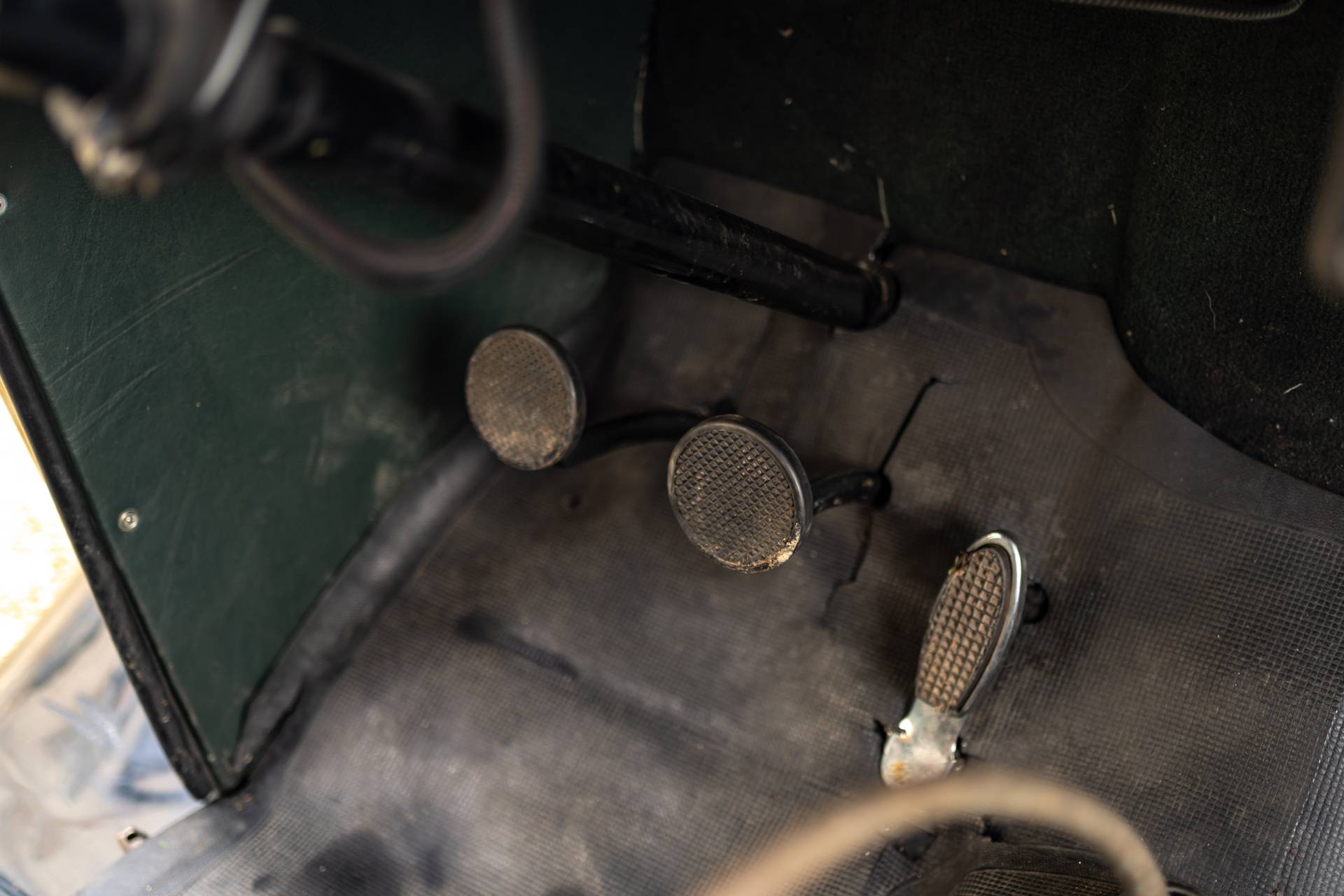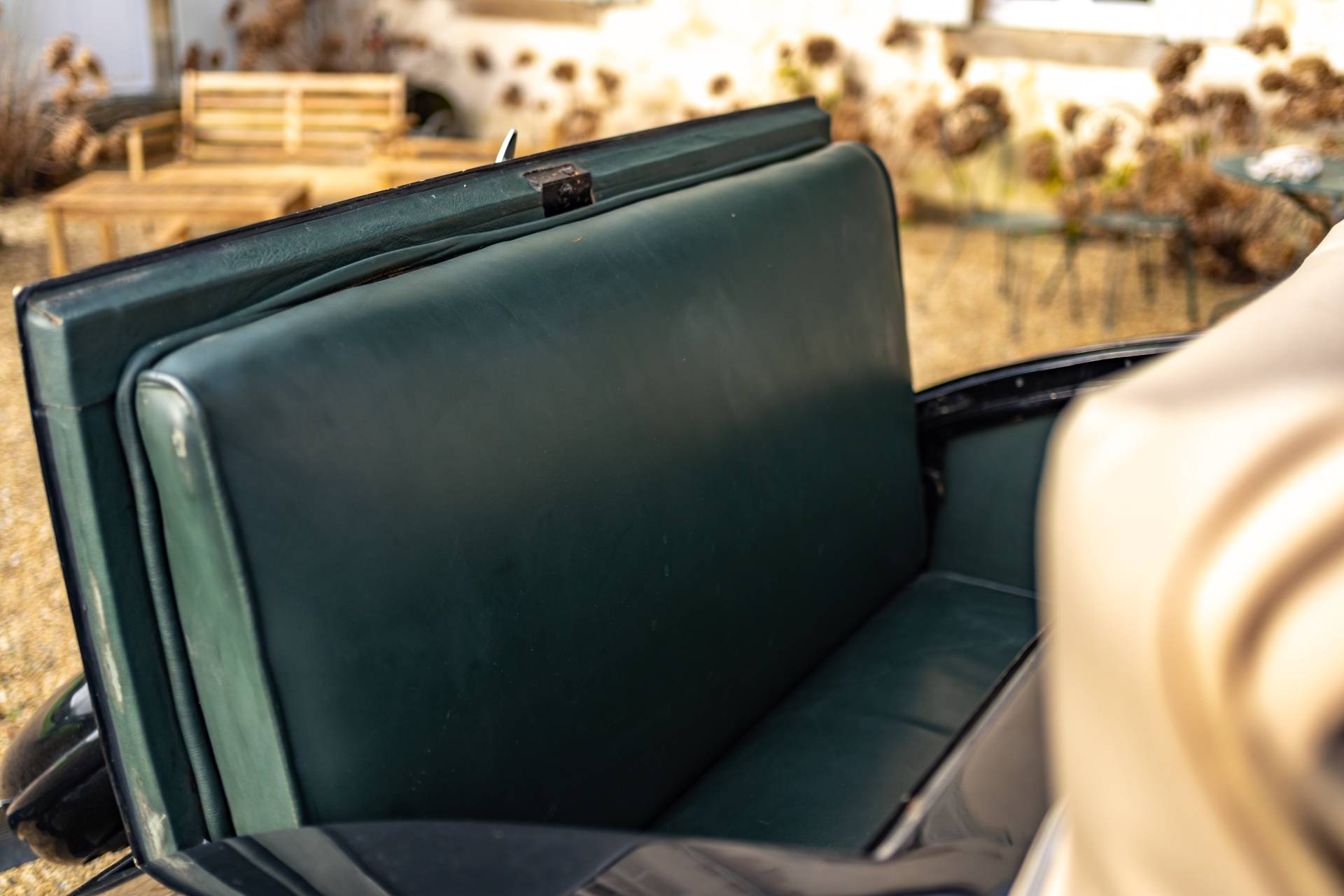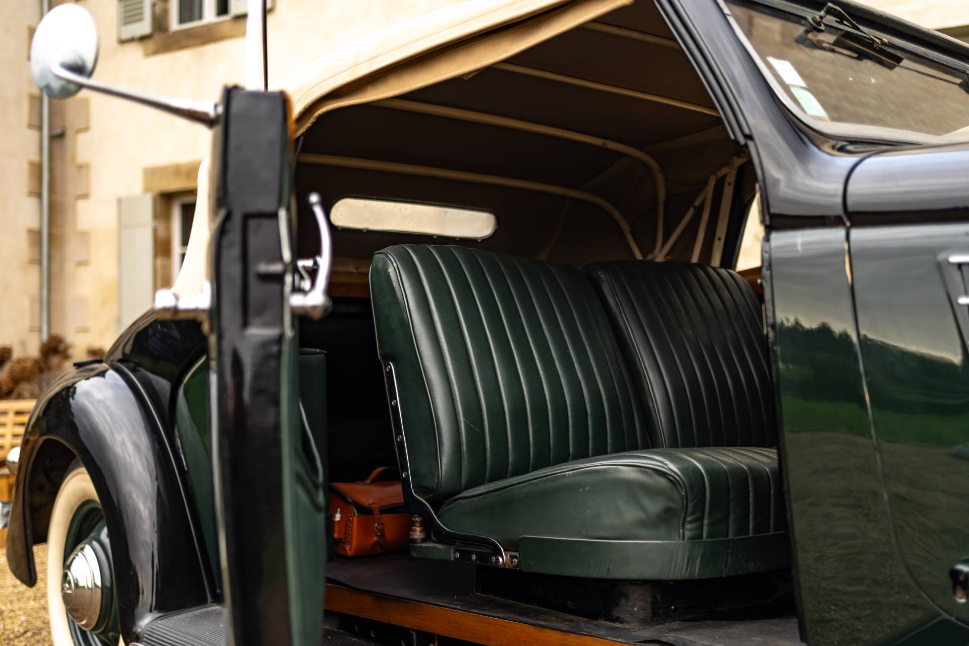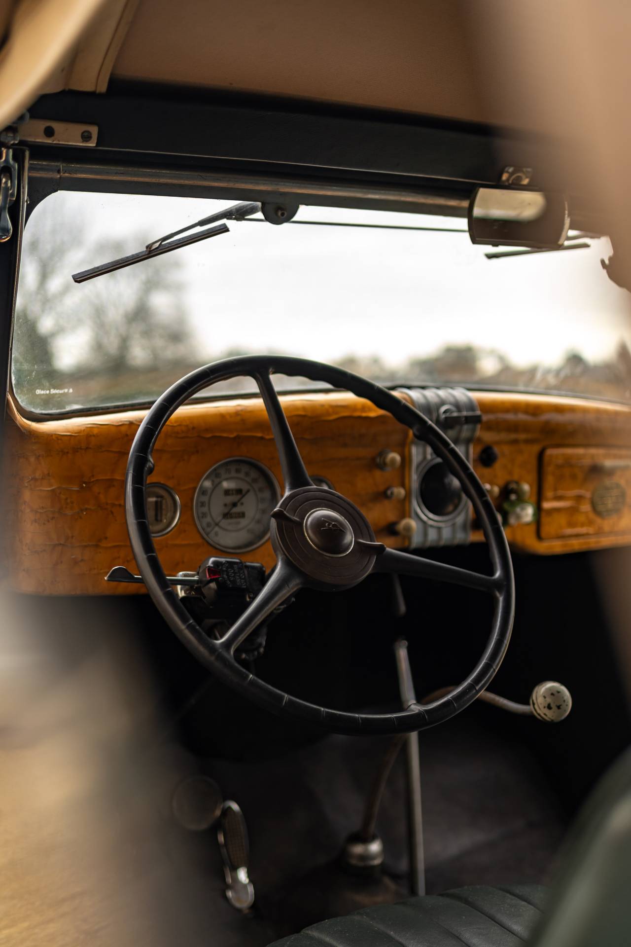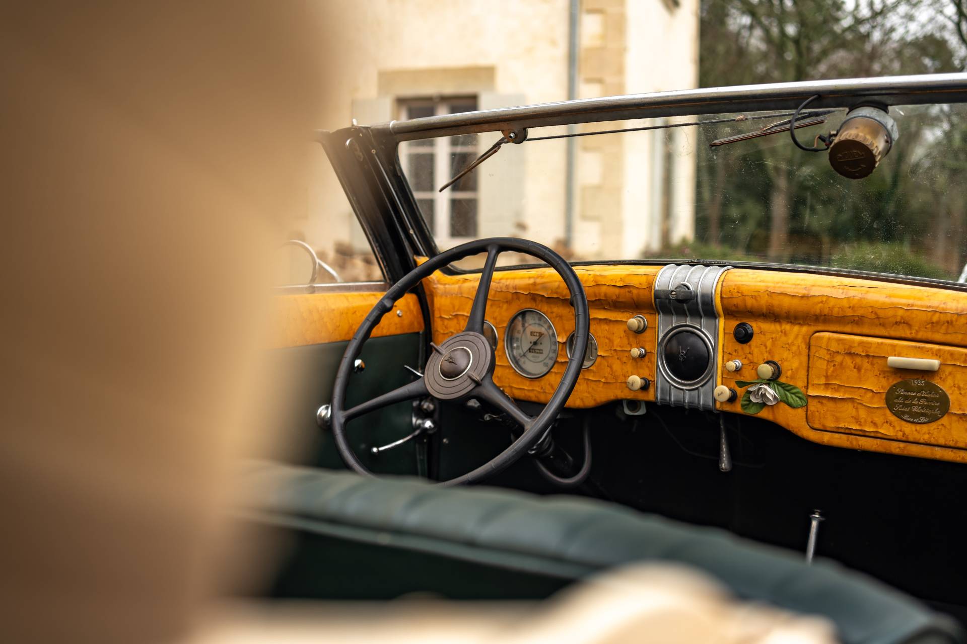 Intérieur : L’habitacle est lui aussi dans un très bel état. Les cuirs verts ont été refaits lors de la restauration, et bien entretenus depuis. Les boiseries ont été revernies, sauf la planche de bord pour témoigner des années passées. Le compteur de vitesse ainsi que le manomètre de température d’eau fonctionnent. La jauge à essence est à rebrancher. Un manomètre pour la pression d’huile est ajouté discrètement dans la boîte à gants.