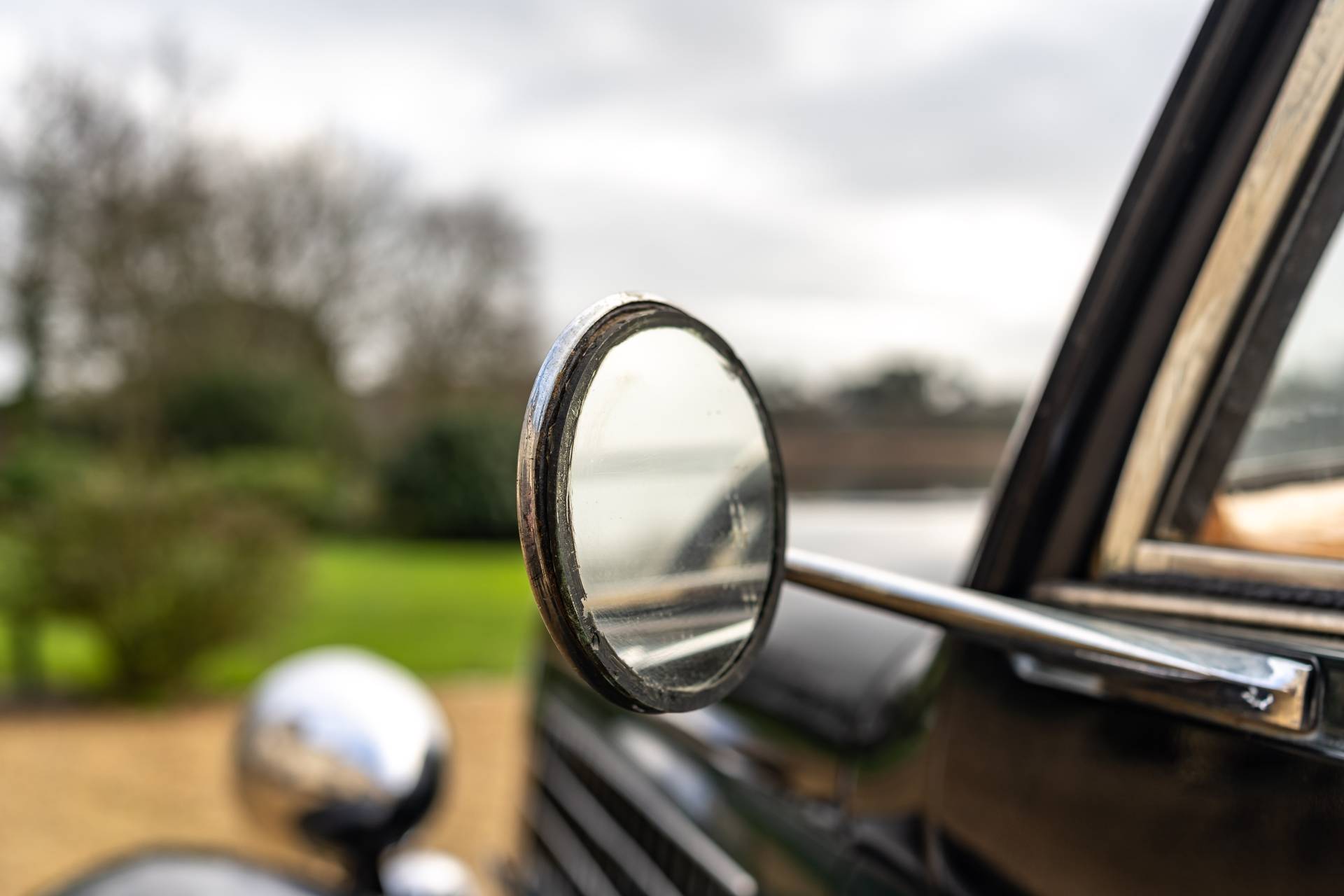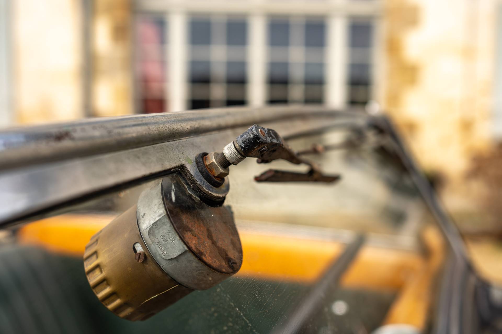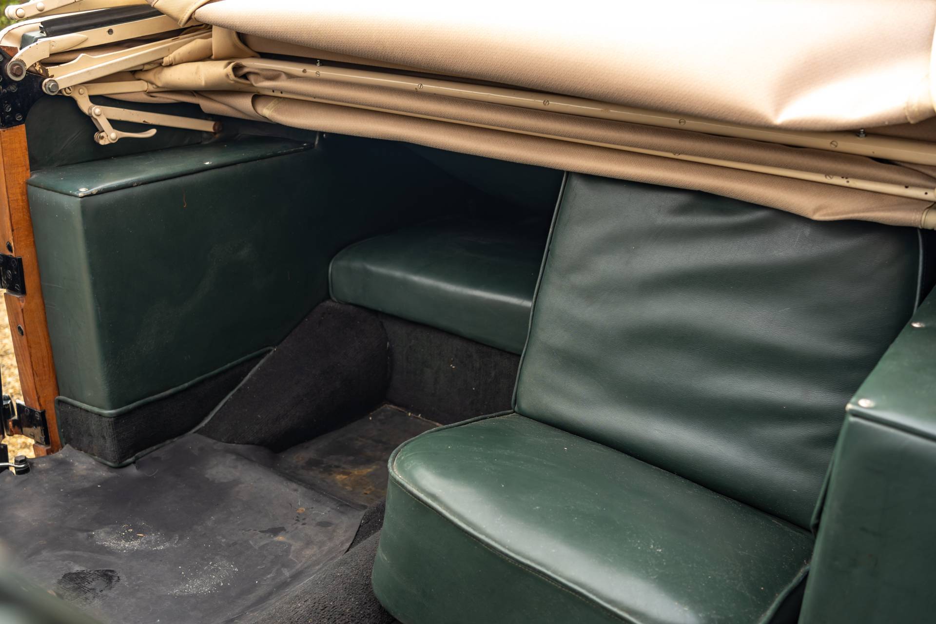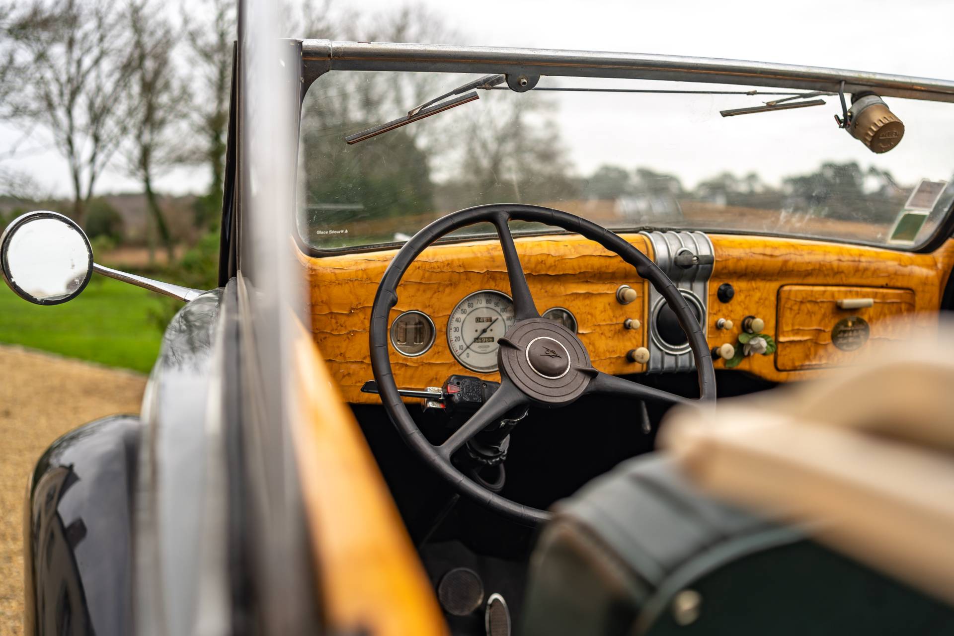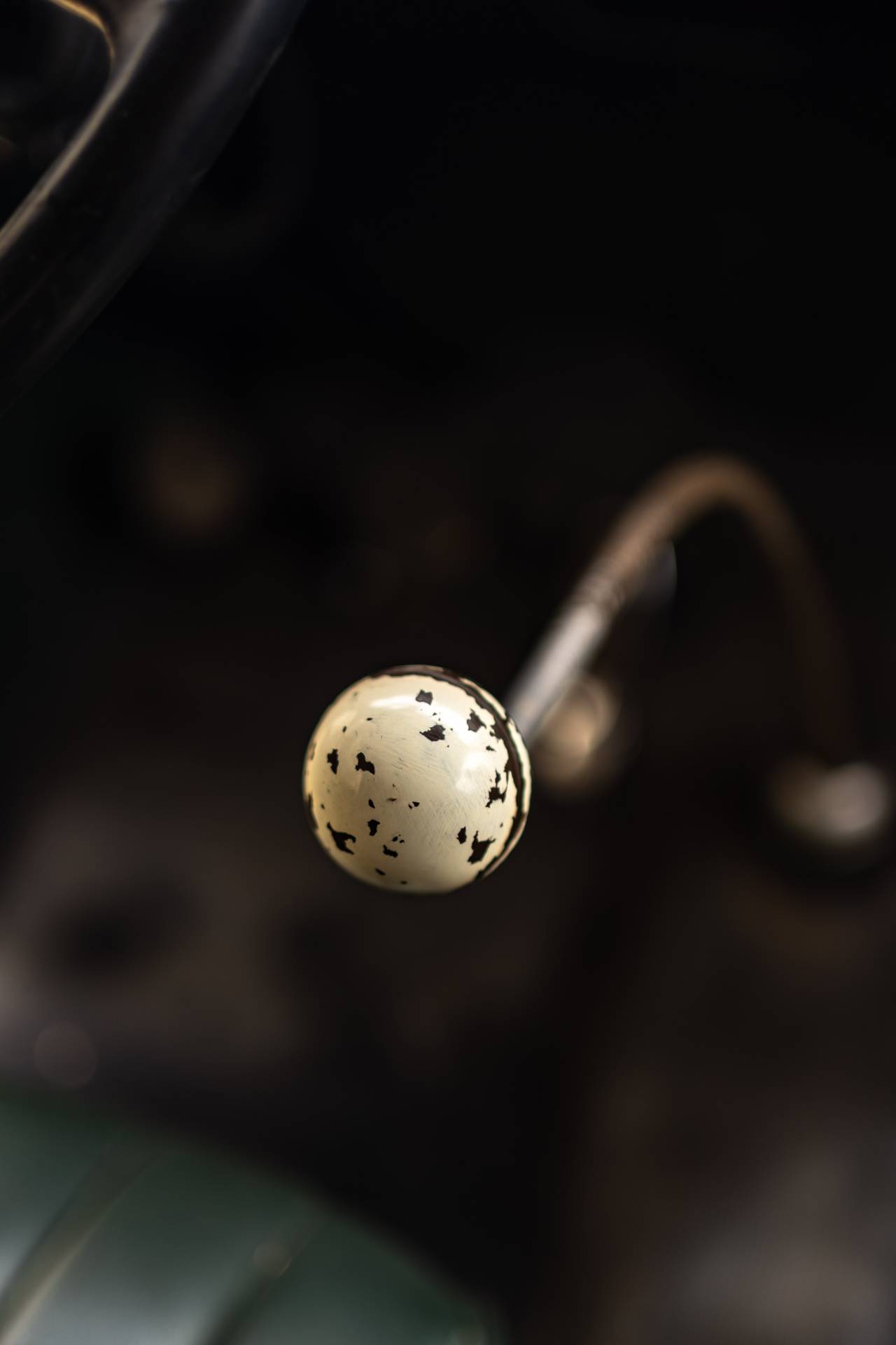 Intérieur : L’habitacle est lui aussi dans un très bel état. Les cuirs verts ont été refaits lors de la restauration, et bien entretenus depuis. Les boiseries ont été revernies, sauf la planche de bord pour témoigner des années passées. Le compteur de vitesse ainsi que le manomètre de température d’eau fonctionnent. La jauge à essence est à rebrancher. Un manomètre pour la pression d’huile est ajouté discrètement dans la boîte à gants.