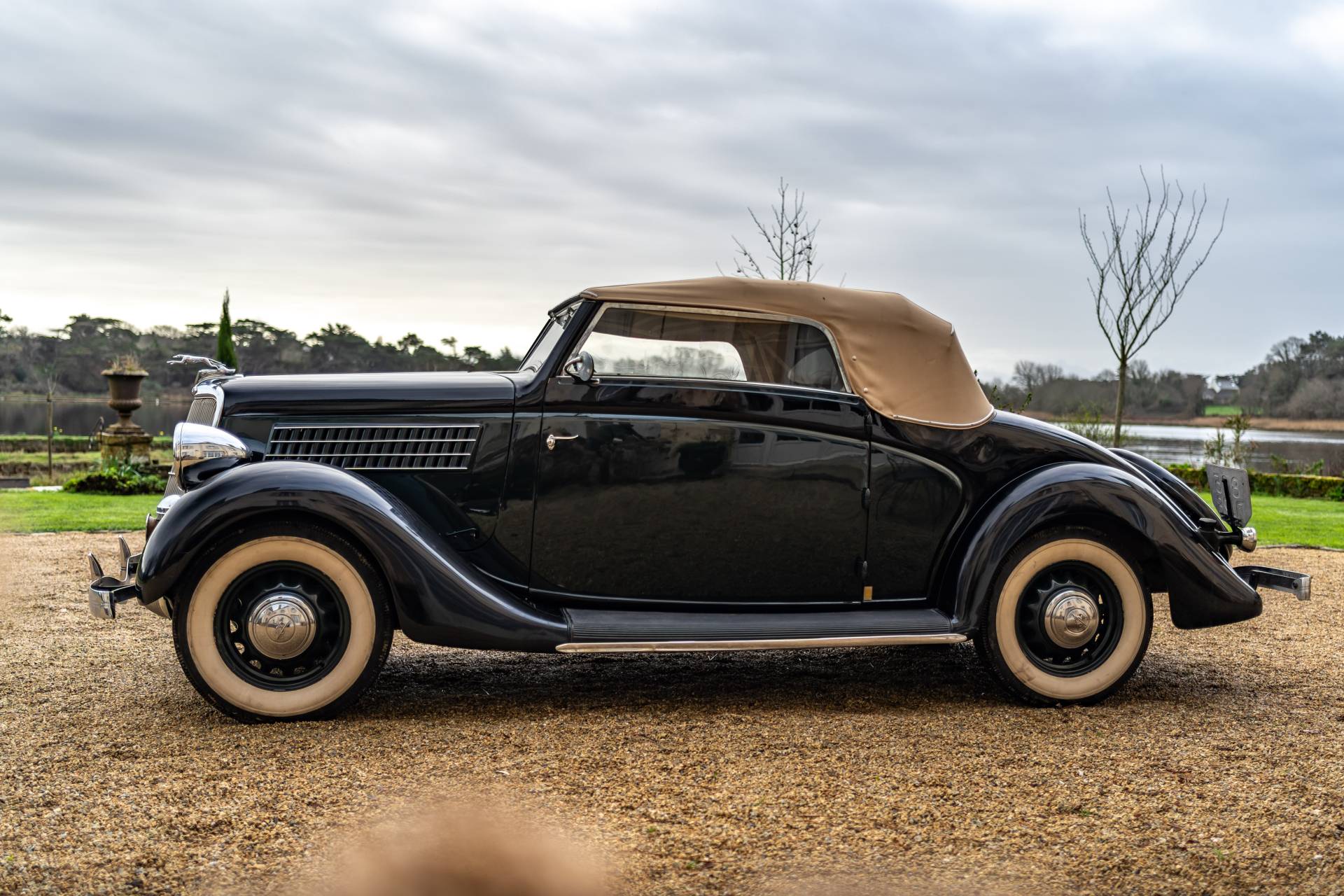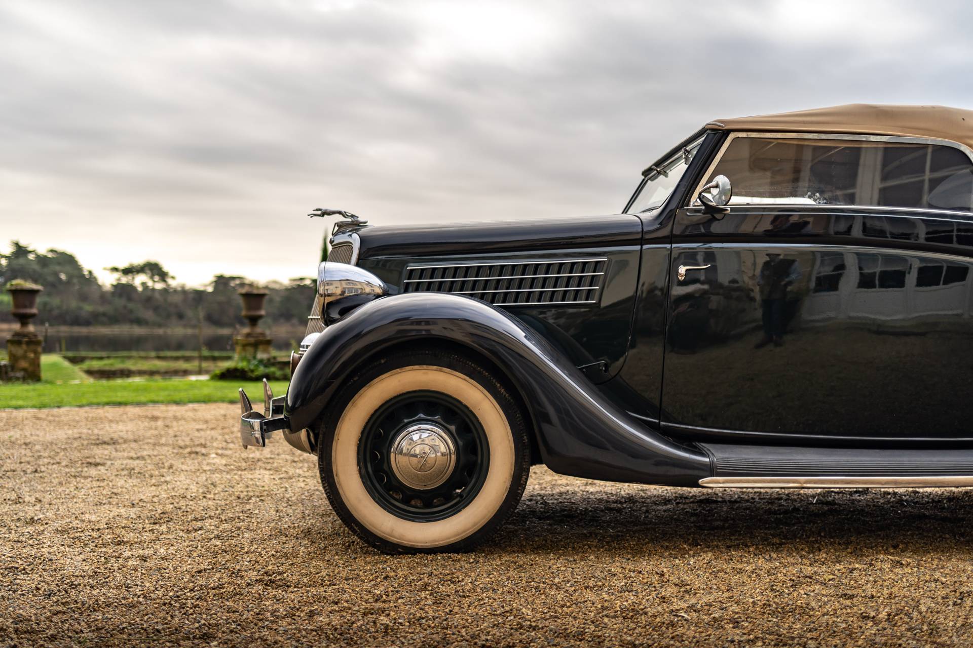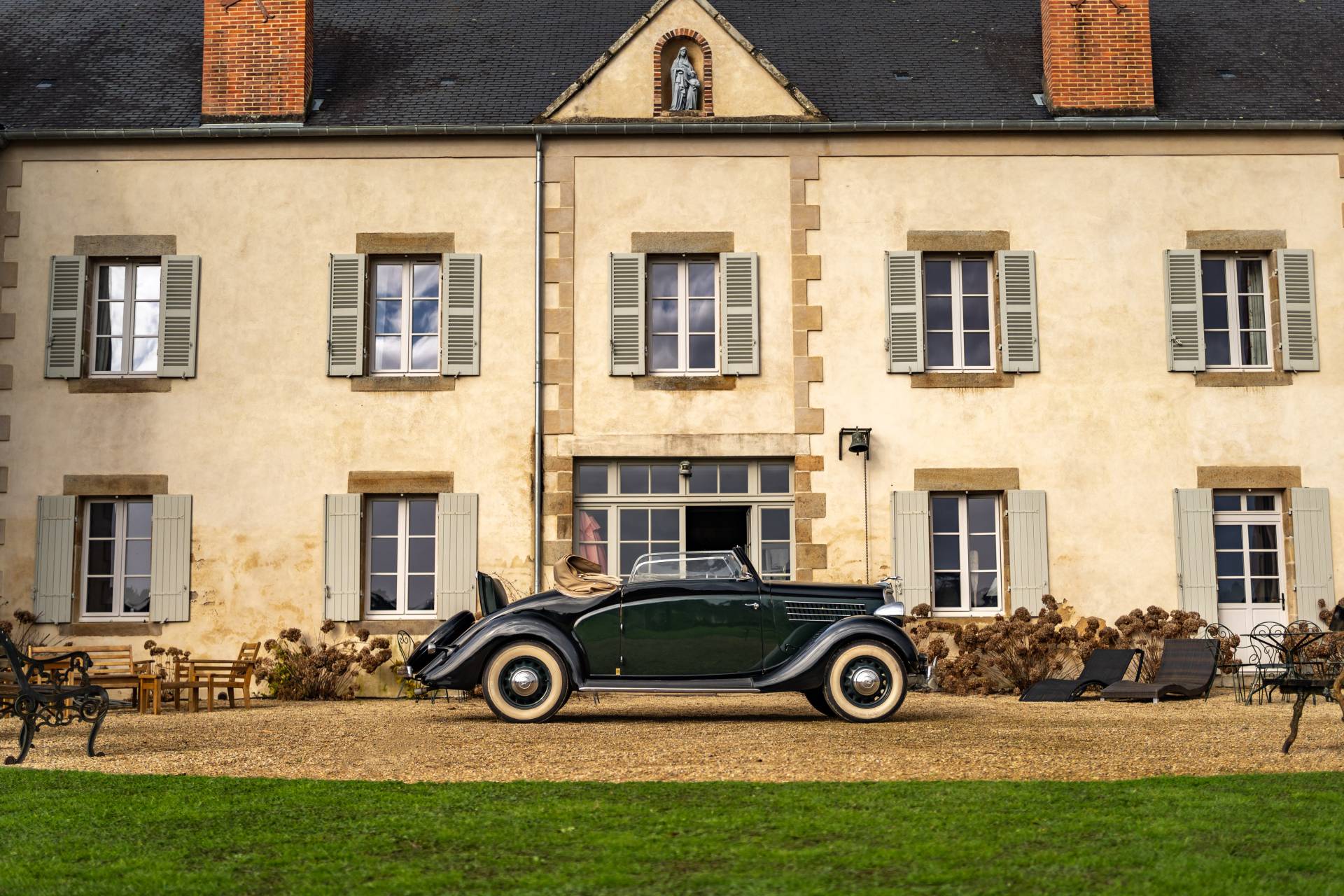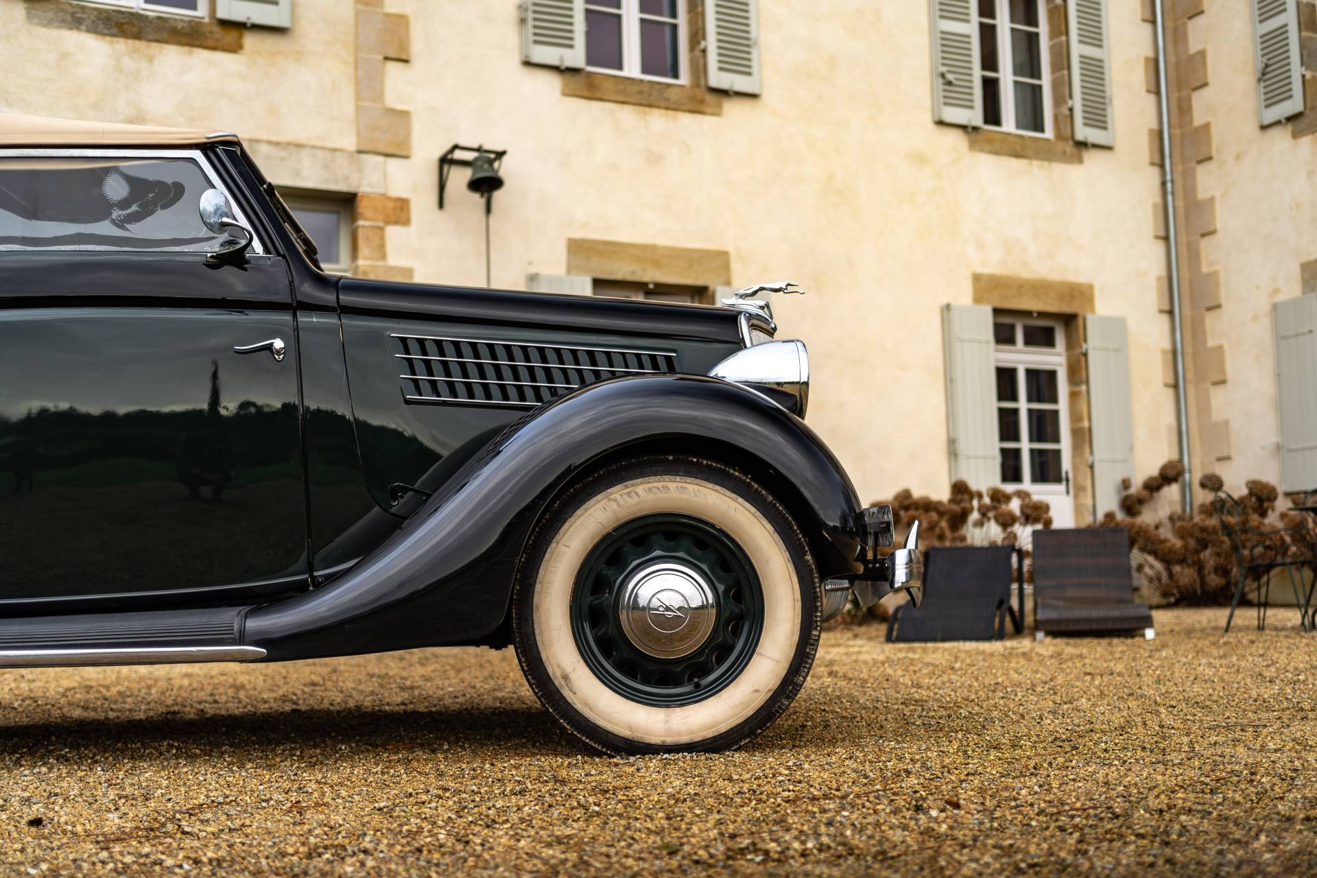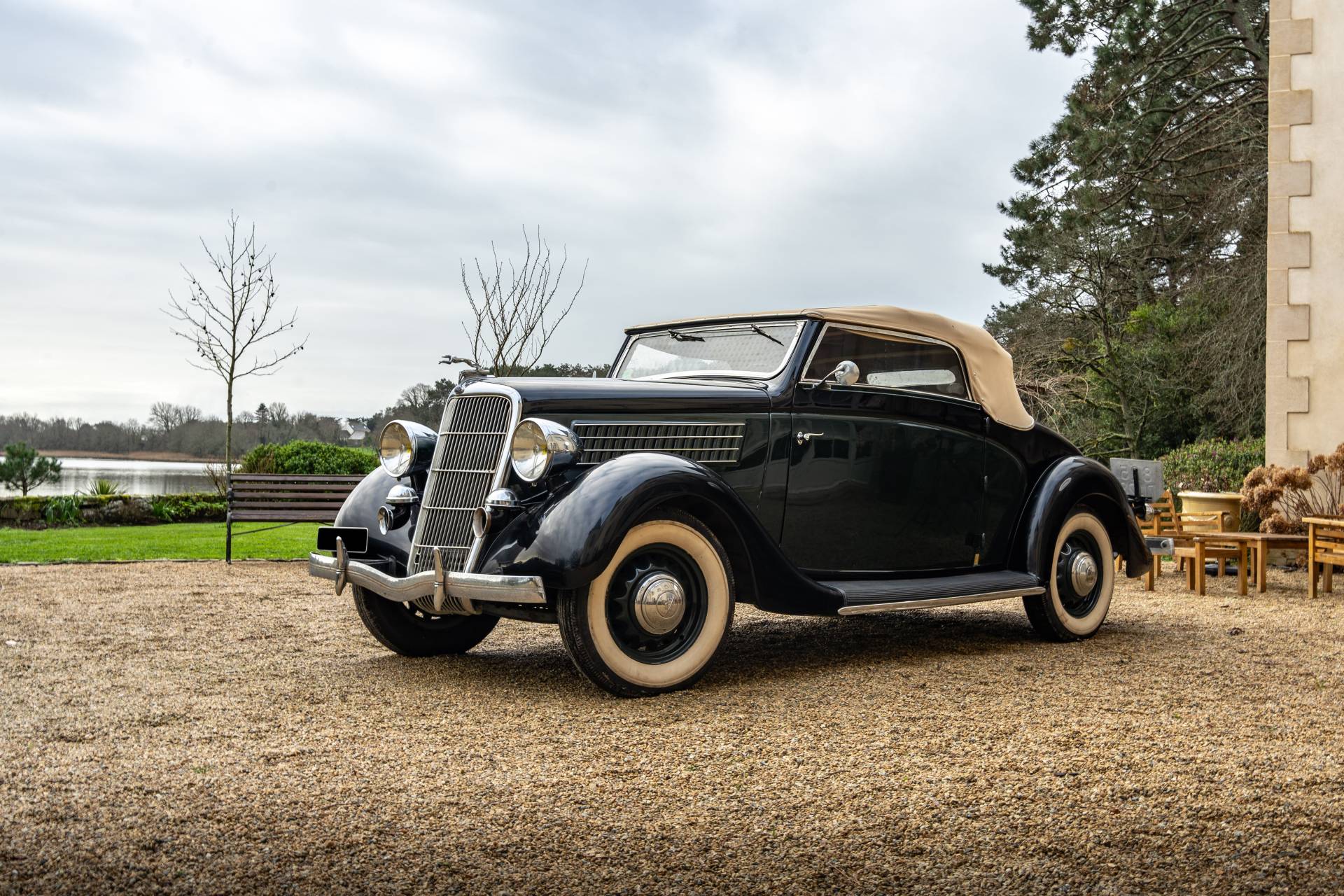Historique : Cette Ford a été assemblée en deux étapes. En 1935, le moteur et le châssis sont commandés auprès de Ford, par la grand tante du propriétaire actuel. Cette femme avait une maison de couture à Paris, elle a commandé cette voiture pour l’occasion du salon des maisons de haute couture parisien de 1935 pour lequel elle a remporté le premier prix d'élégance (photos disponibles). Le choix de ce modèle avait du sens : Ford venait de lancer le premier V8 produit en grande série, une mécanique performante jusqu'ici peu connue.