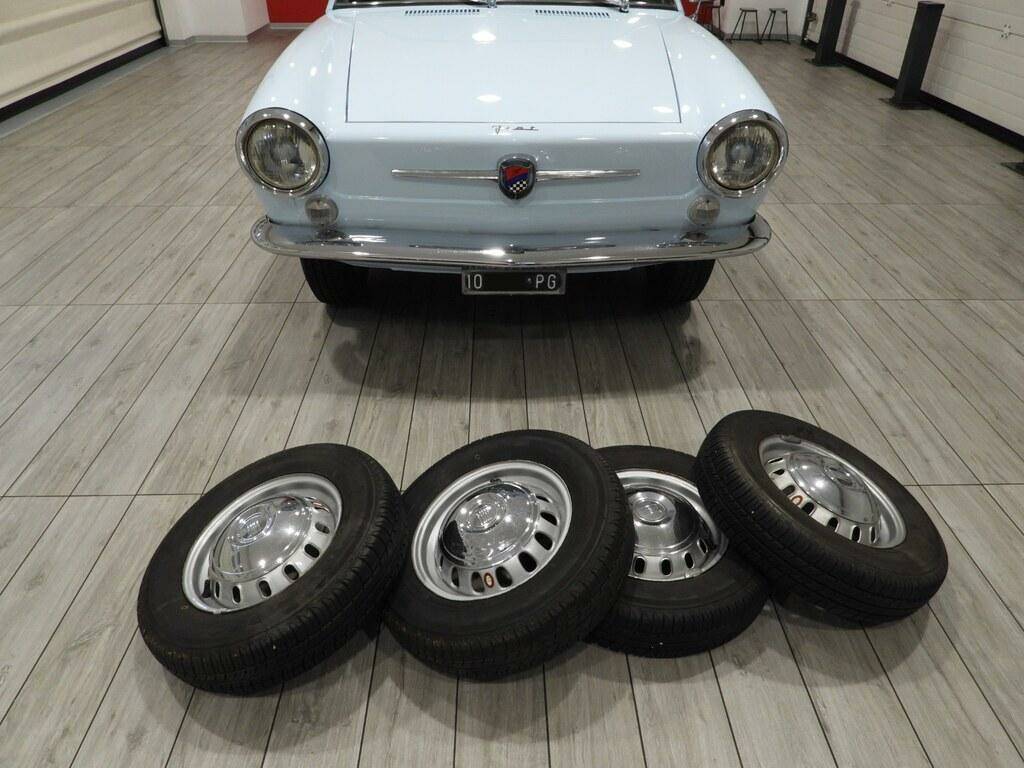 Seats and panels in sky blue, two-spoke steering wheel, wooden dashboard, original period rubber mats, chrome-plated Vitaloni external mirror on the driver's side, 5 painted spoked wheels with wing nut with belted Pirelli P3 155 SR13 tires