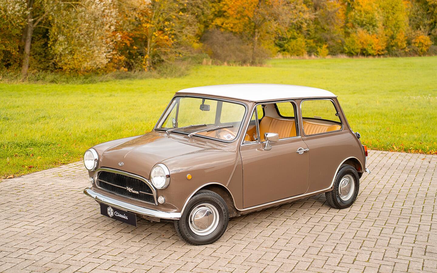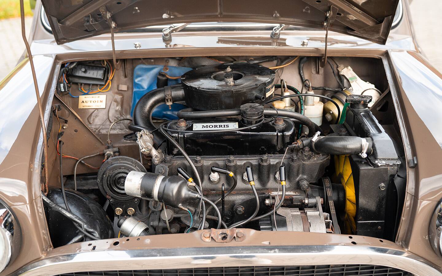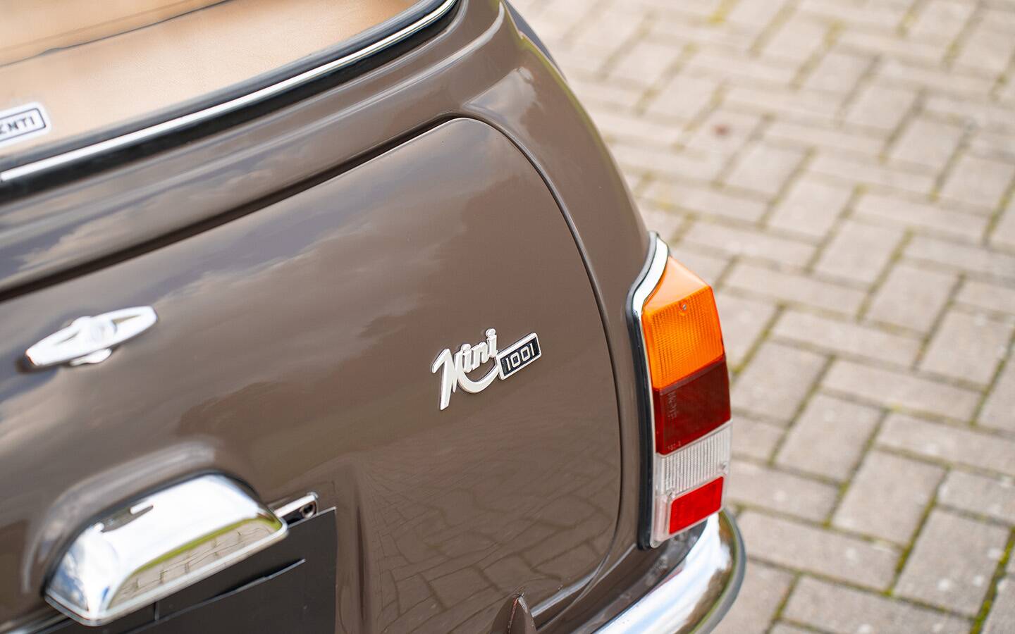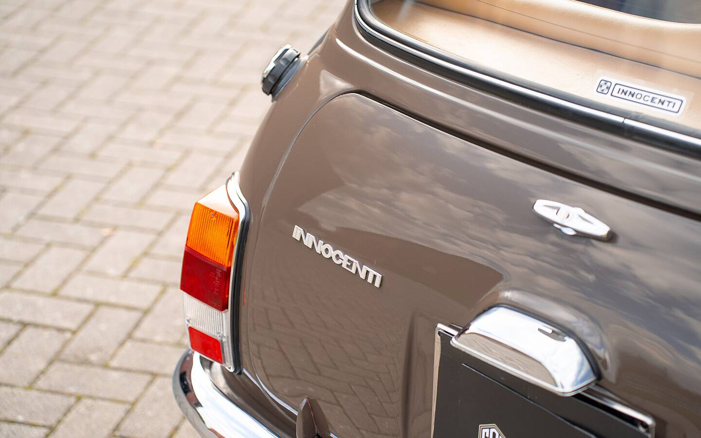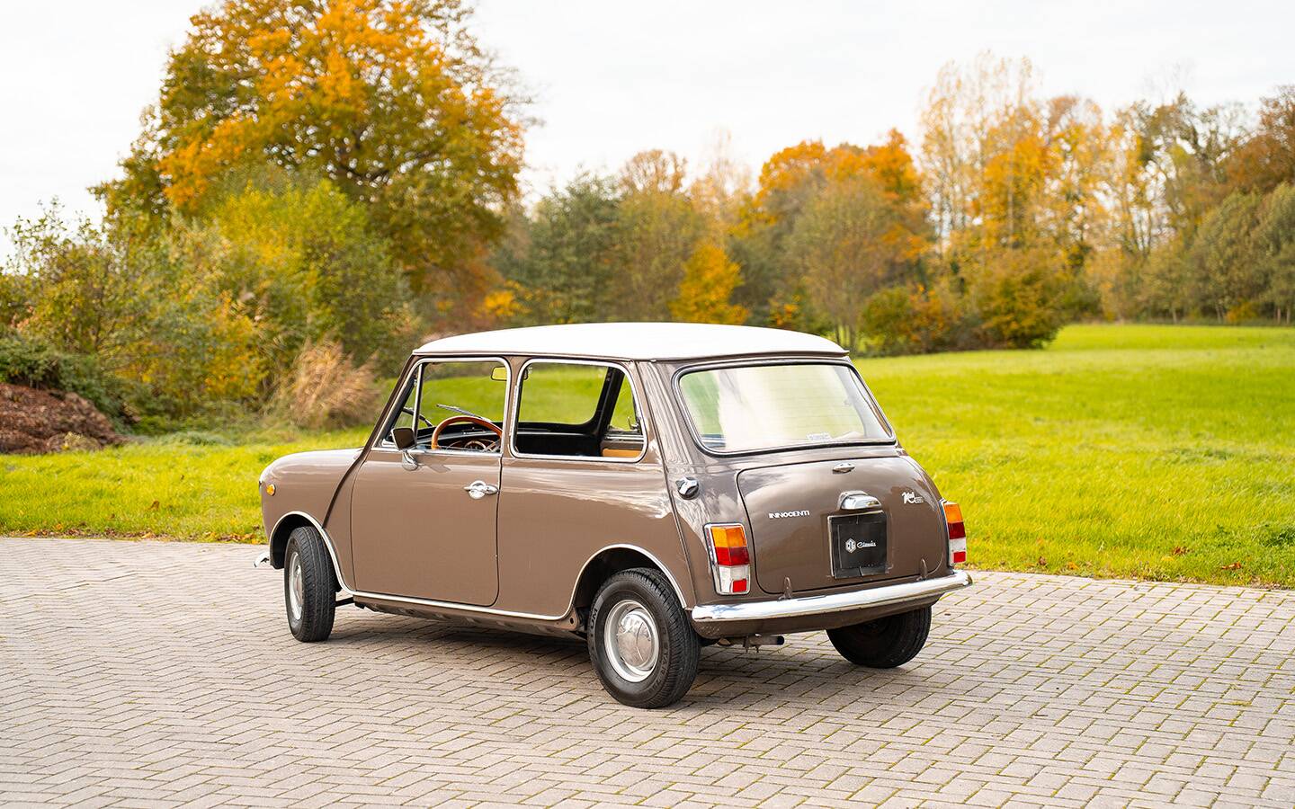 Dieser wunderschöne Innocenti Mini 1001 präsentiert sich in einer eleganten braunen Lackierung mit weißem Dachund einer stilvollen hellbraunen Lederausstattung. Das Fahrzeug wurde ursprünglich von AUTOIN in Viterbo (Italien), zwischen Grosseto und Rom, ausgeliefert und später umfassend restauriert. Eine ausführliche Fotodokumentation der Restaurierung liegt vollständig vor und belegt die sorgfältige Arbeit, die in dieses Fahrzeug geflossen ist.