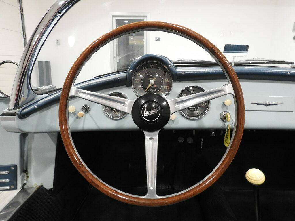 Seats in Bleu leather, removable flaps on the doors, external chromed driver's side mirror, painted iron rims with original Lancia chromed caps