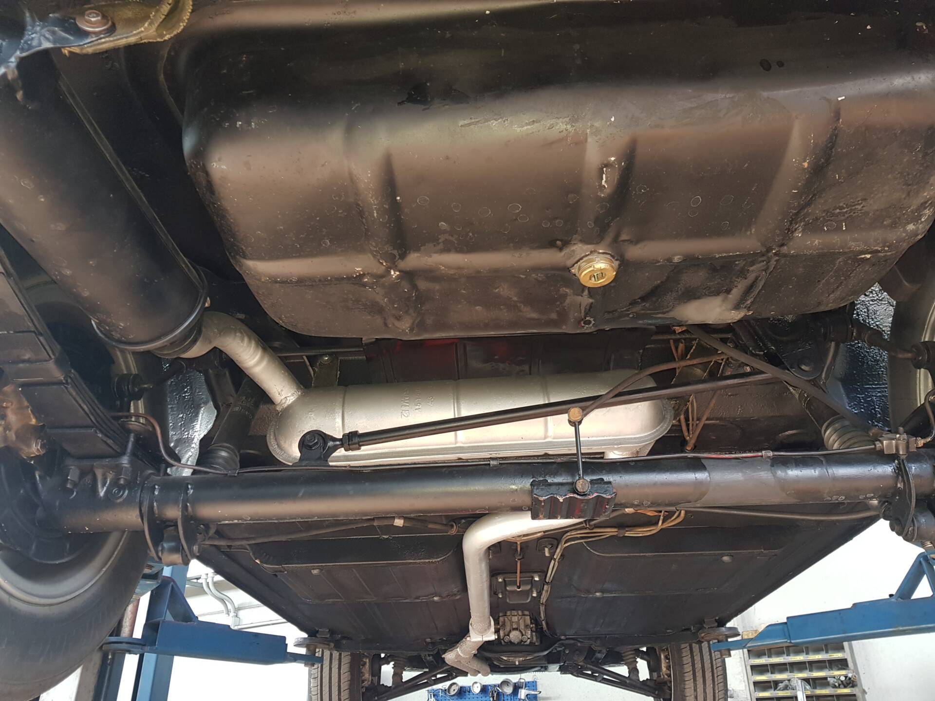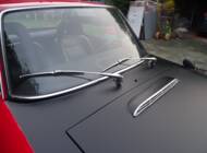 La carrozzeria è stata completamente smontata e restaurata in modo approfondito. Sono stati sostituiti i fondi, le parti inferiori e numerose sezioni della scocca mediante interventi in lamiera saldati professionalmente. I parafanghi sono stati ricostruiti in acciaio, mentre porte e cofani in alluminio sono stati conservati grazie al loro buono stato. Anche i supporti dei sedili, precedentemente modificati, sono stati ricostruiti secondo le specifiche originali. L’aspetto esterno appare oggi coerente e curato.