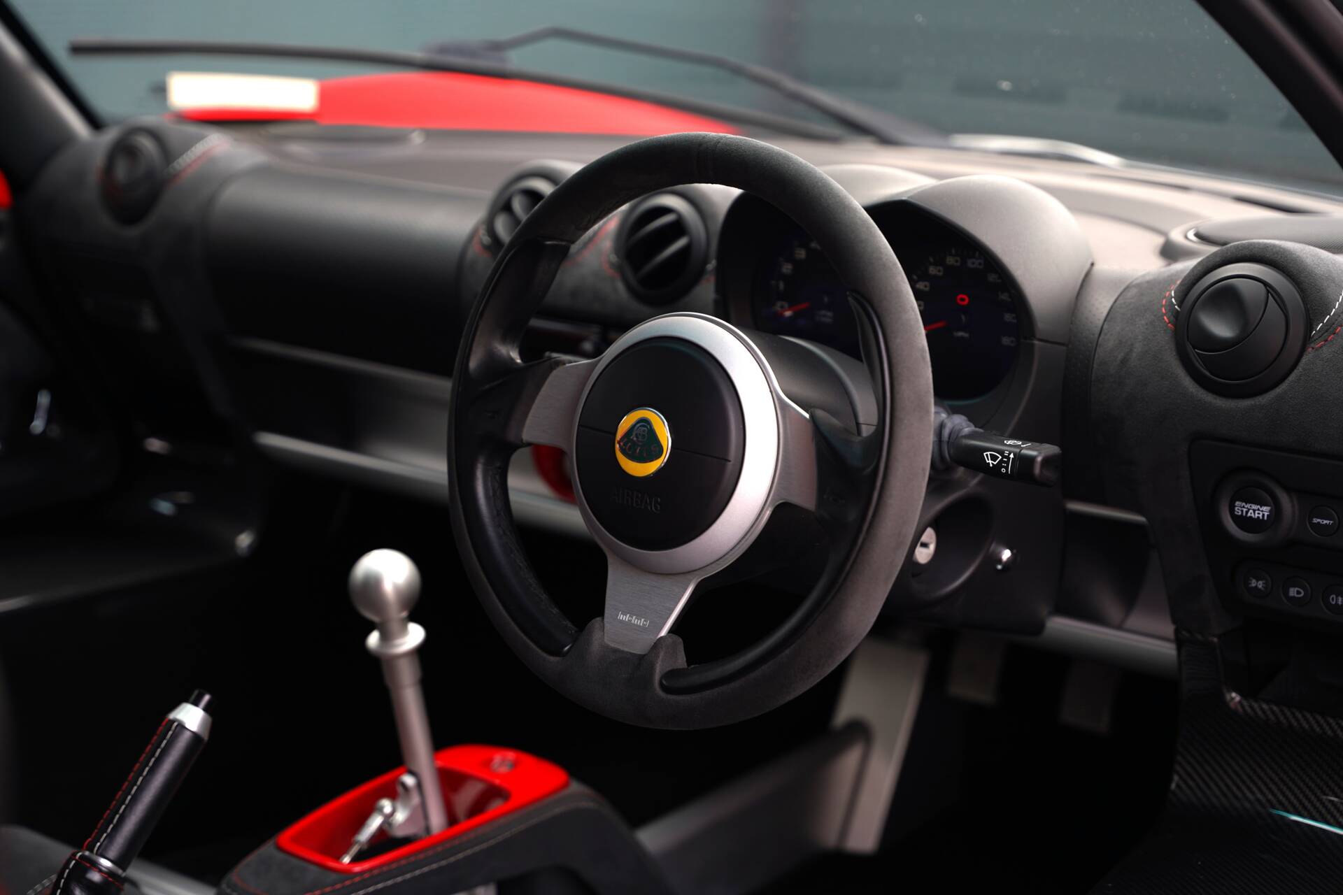 Finished in Solid Red (C183), the exterior is complemented by carbon fibre panels including the front inspection panel and engine decklid, as well as the purposeful rear spoiler. An additional CUP 430 carbon front splitter has been specified on this Exige. The car features the Black Pack, with a gloss black roof and side pods, alongside the regular matte finished rear transom. Satin black lightweight forged wheels complete the exterior styling. The front of the car is protected with PPF, ensuring that it remains in fantastic condition for many more miles to come.