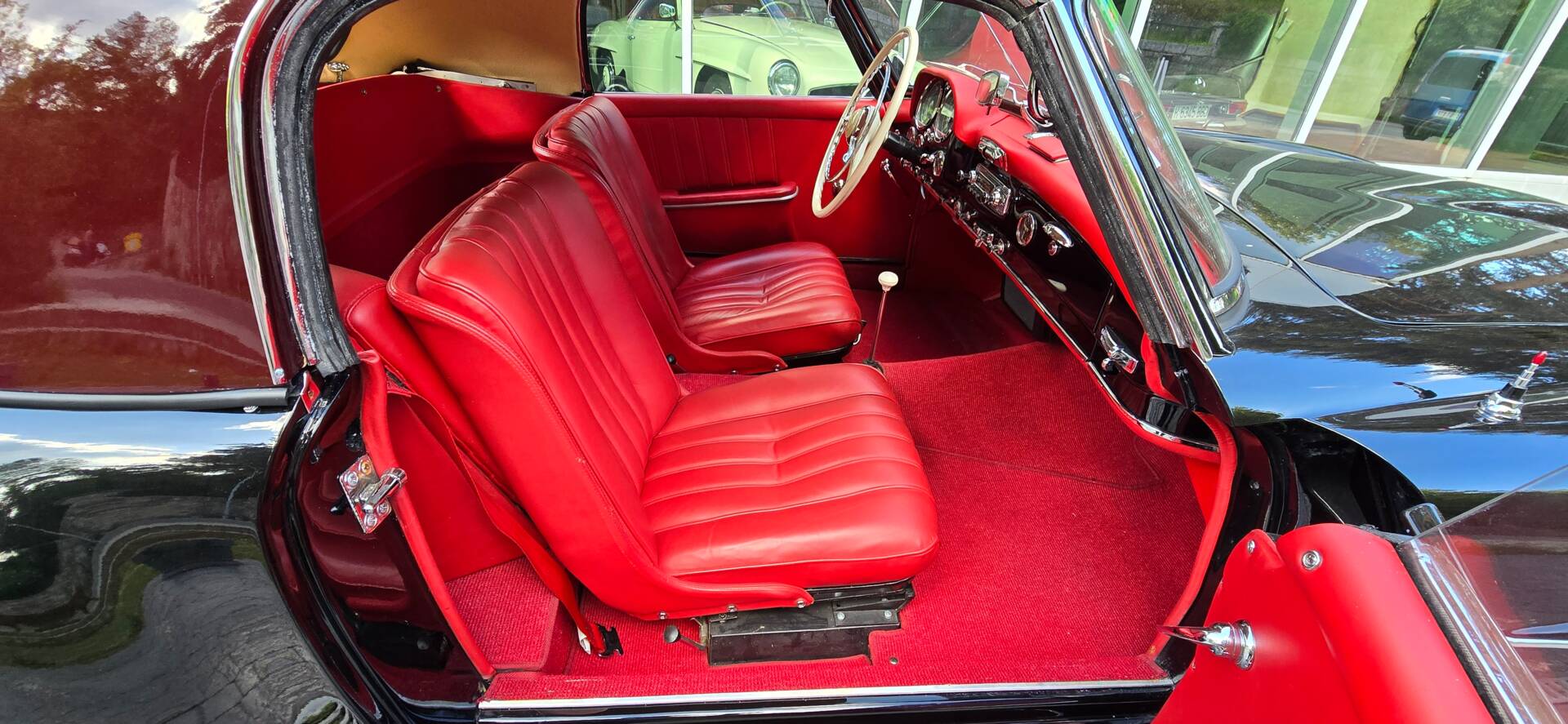 Mercedes-Benz 190SL Roadster 1956 First Series 050G Black/Red Leather Interior Sport Seats W198 300SL type. Mittle Rot Hard Top with Black Softop. Just 3.900 kms since Restoration done in 2005-2007 by us and recently refresh for selling. Amazing Condition ready to enjoy. Matching numbers M121921 Motor 1895cc 105CV Manual Gearbox 4 speed, 160 kms/h .max. Speed. Extra: Becker Radio , Glovebox Clock, Third seat, White Whall MIchelin Tyres 185R14. Price 164.900€ ONO. Complete State Picture Dossier available under request. European and WW delivery