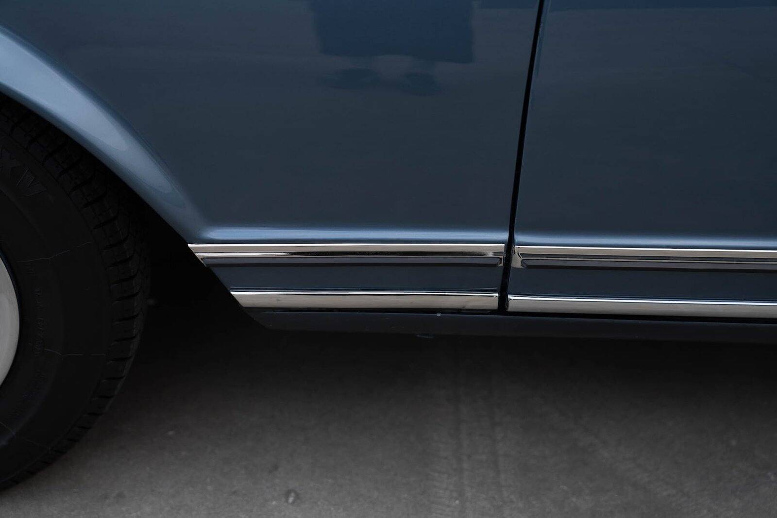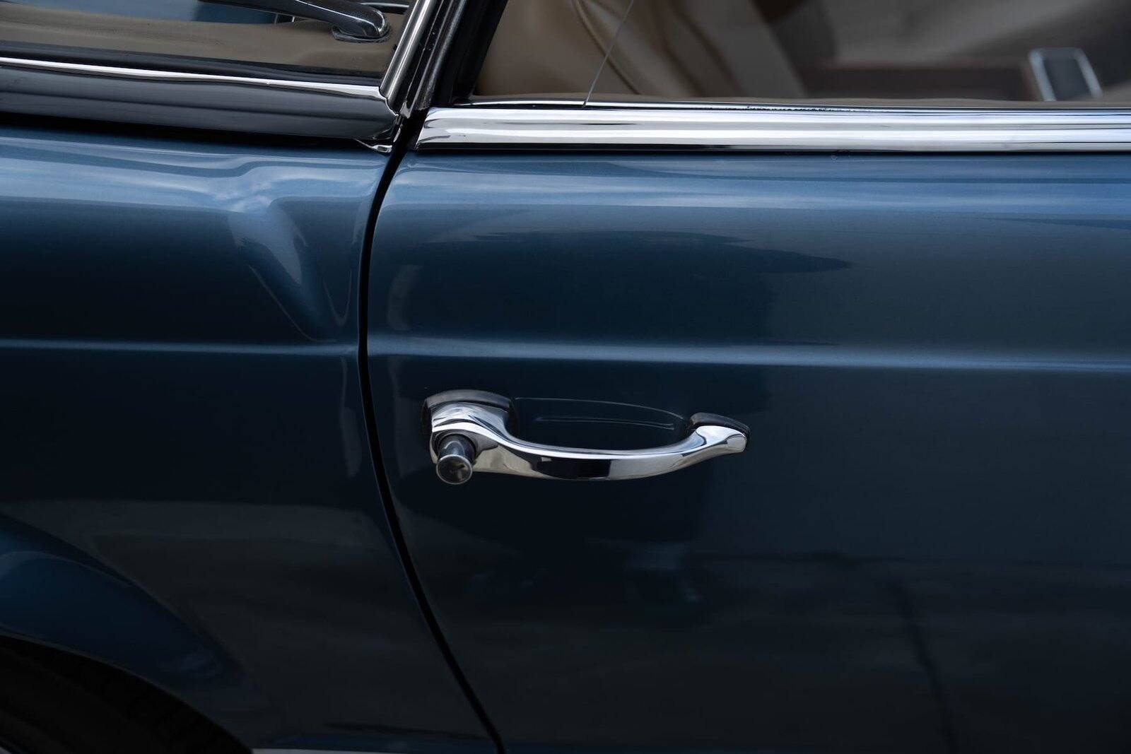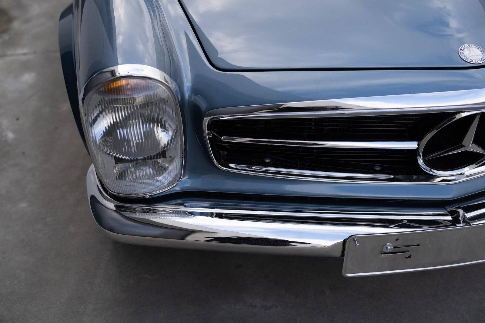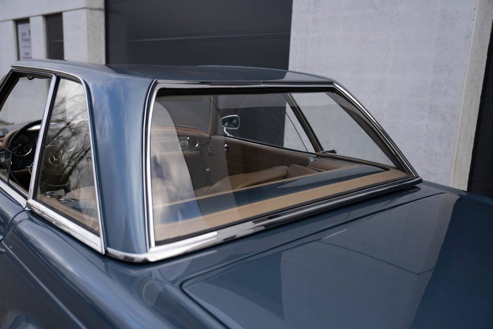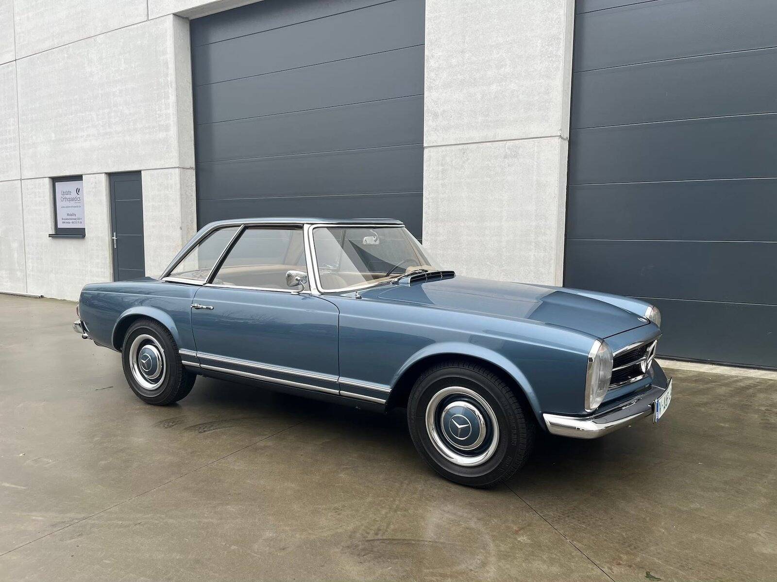De carrosserie, inclusief de hardtop, werd volledig kaal gemaakt tot op het metaal. De auto werd vervolgens opnieuw gespoten in de klassieke Mercedes-kleur Mittelblau Metallic (kleurcode 396), een tint die beschikbaar was van 1965 tot 1972. Deze kleur, gecombineerd met het stijlvolle beige interieur en zwarte accenten, geeft de auto een elegante en sportieve uitstraling. De accenten op de originele wieldoppen zijn ook in dezelfde blauwe tint gespoten, wat de auto een harmonieuze en authentieke uitstraling geeft.