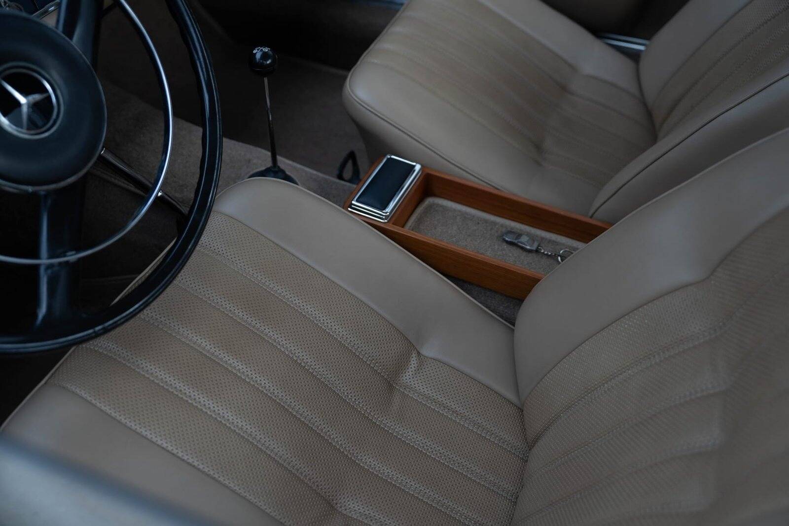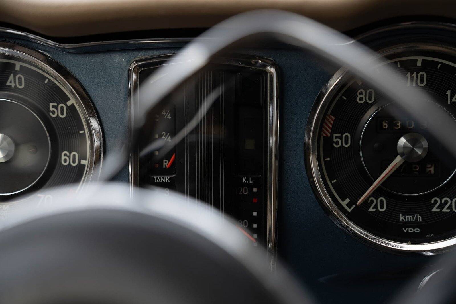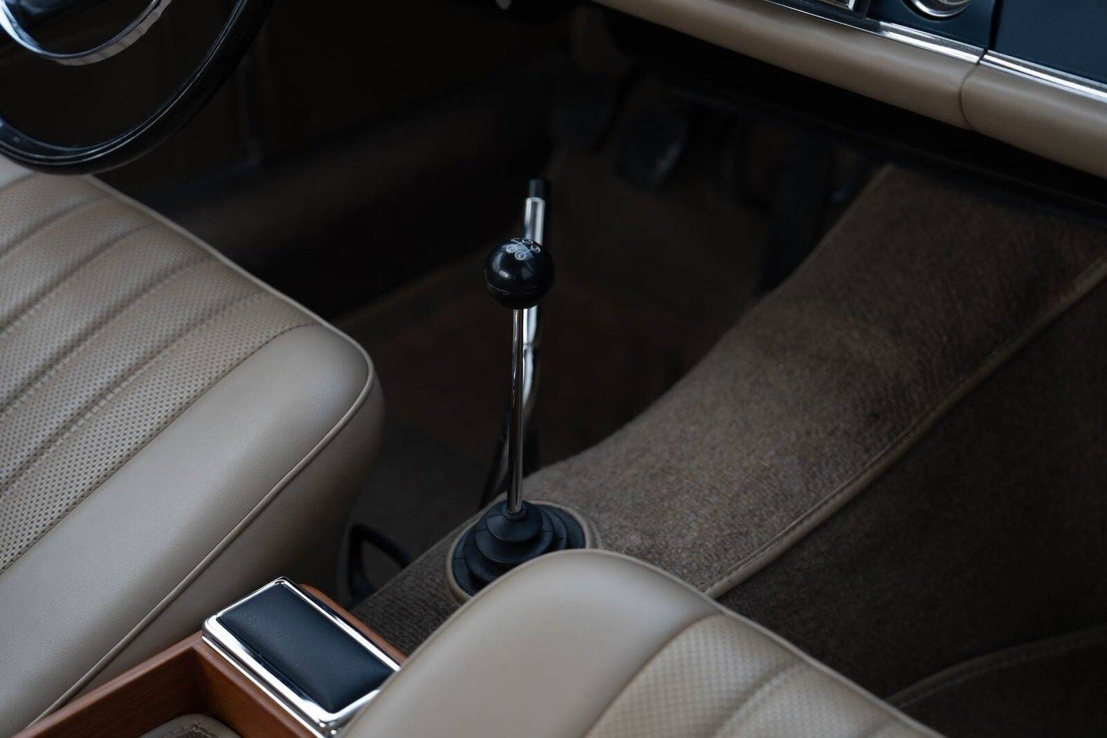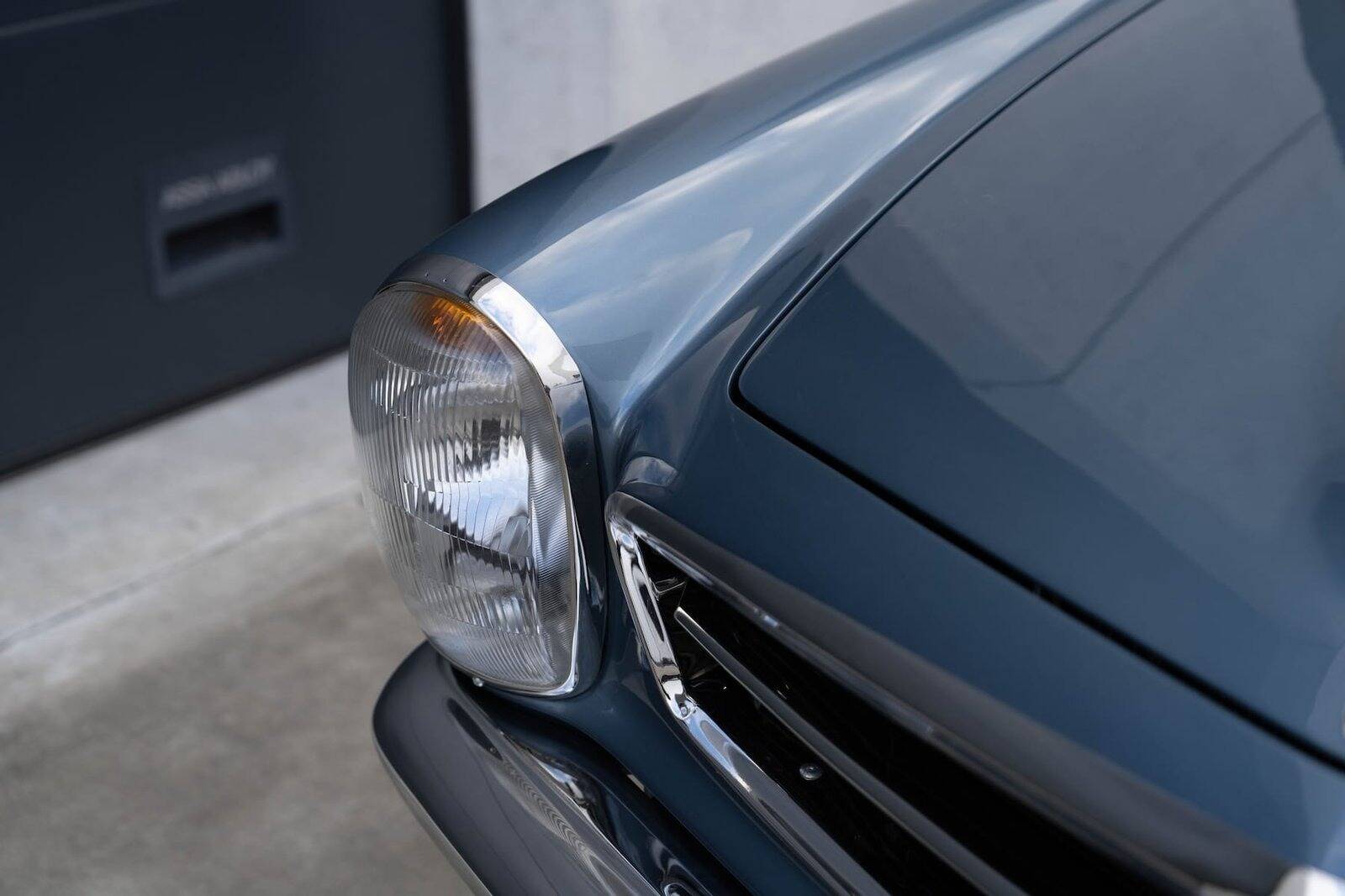 De carrosserie, inclusief de hardtop, werd volledig kaal gemaakt tot op het metaal. De auto werd vervolgens opnieuw gespoten in de klassieke Mercedes-kleur Mittelblau Metallic (kleurcode 396), een tint die beschikbaar was van 1965 tot 1972. Deze kleur, gecombineerd met het stijlvolle beige interieur en zwarte accenten, geeft de auto een elegante en sportieve uitstraling. De accenten op de originele wieldoppen zijn ook in dezelfde blauwe tint gespoten, wat de auto een harmonieuze en authentieke uitstraling geeft.