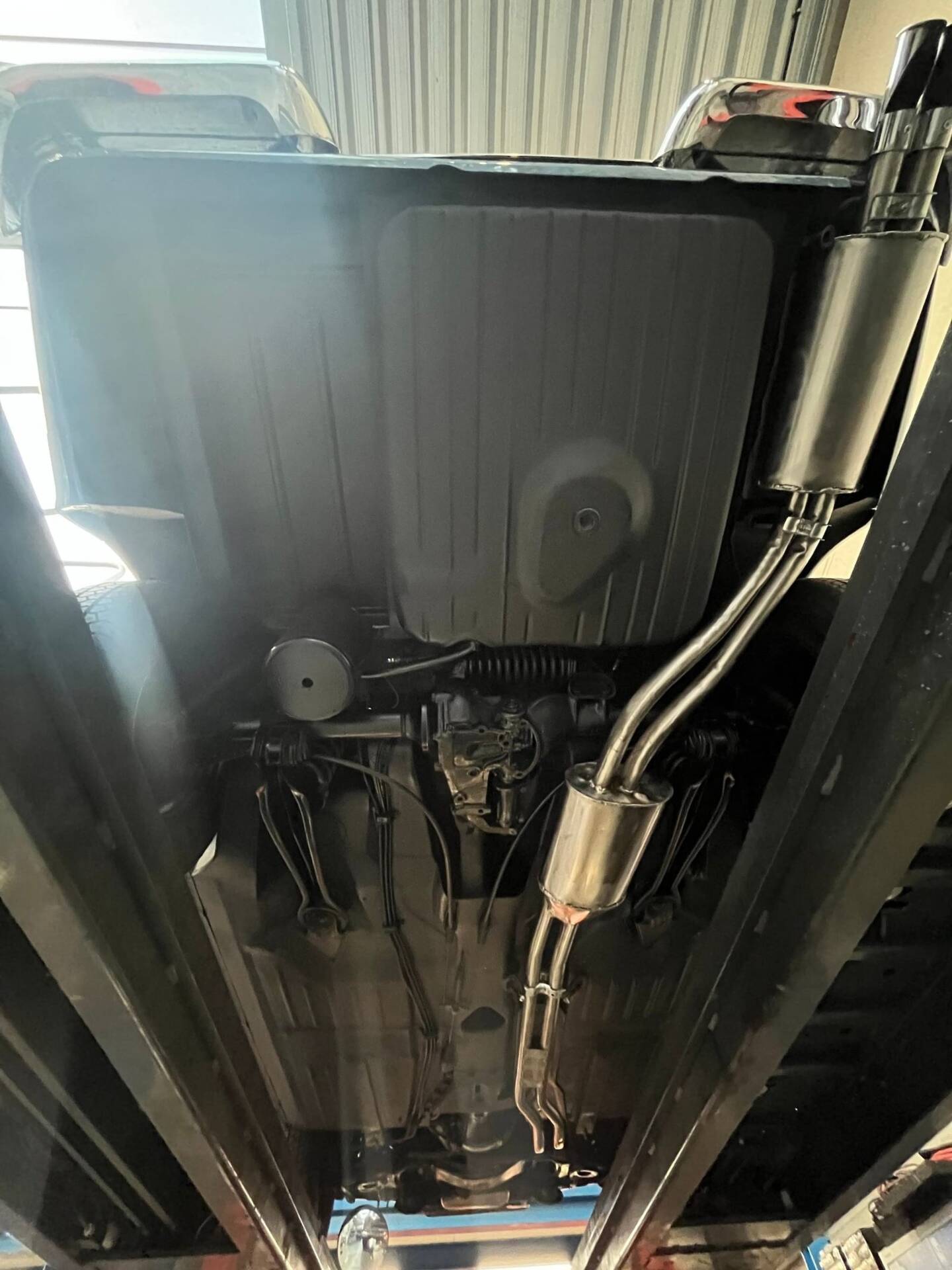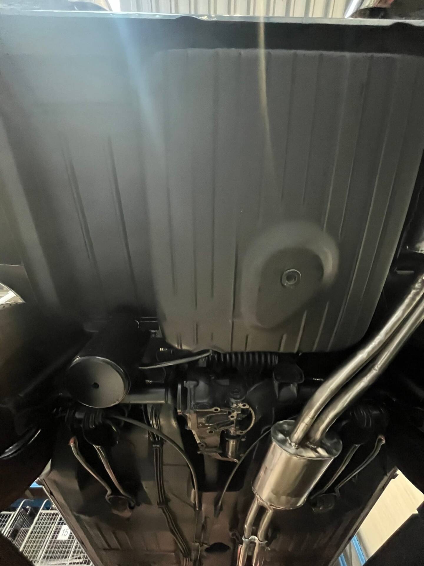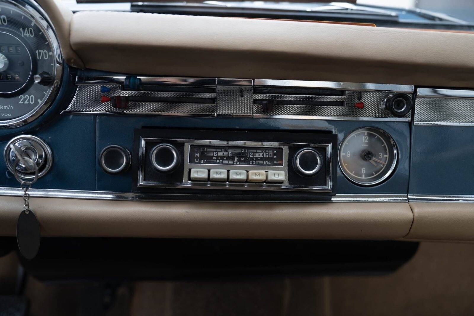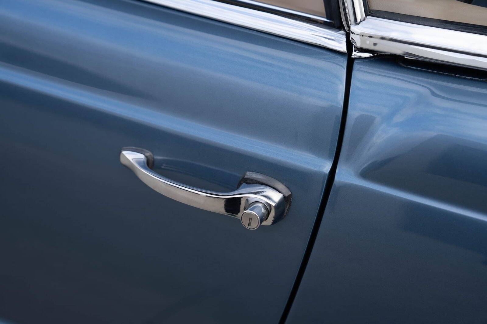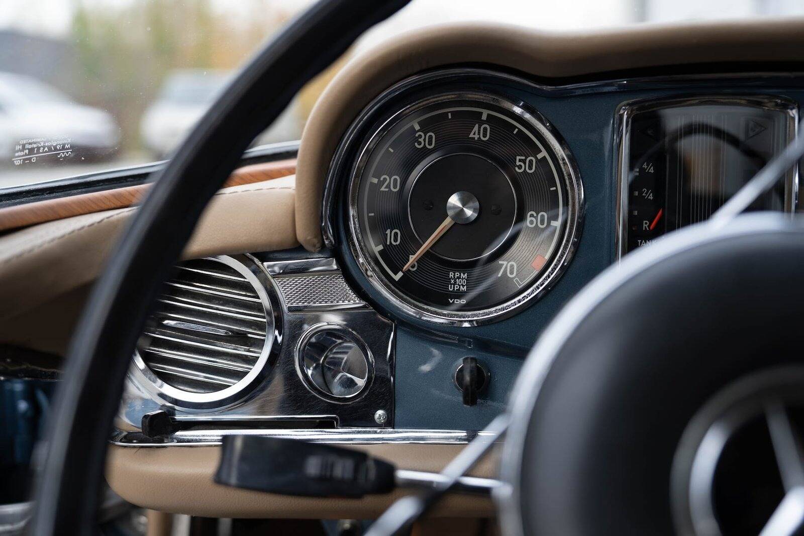 De carrosserie, inclusief de hardtop, werd volledig kaal gemaakt tot op het metaal. De auto werd vervolgens opnieuw gespoten in de klassieke Mercedes-kleur Mittelblau Metallic (kleurcode 396), een tint die beschikbaar was van 1965 tot 1972. Deze kleur, gecombineerd met het stijlvolle beige interieur en zwarte accenten, geeft de auto een elegante en sportieve uitstraling. De accenten op de originele wieldoppen zijn ook in dezelfde blauwe tint gespoten, wat de auto een harmonieuze en authentieke uitstraling geeft.