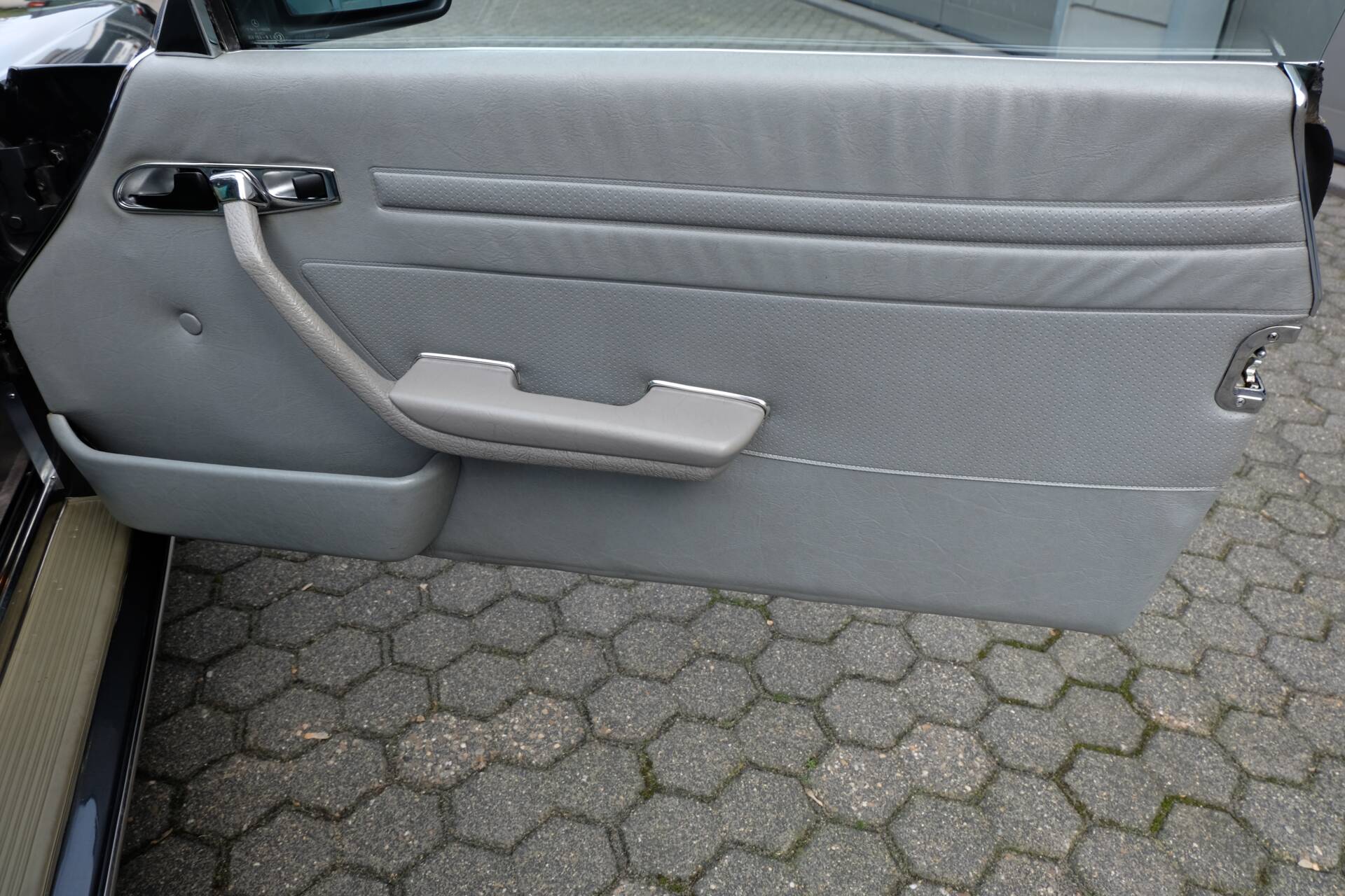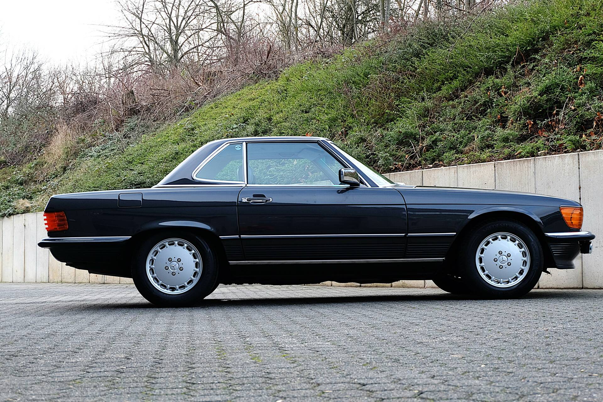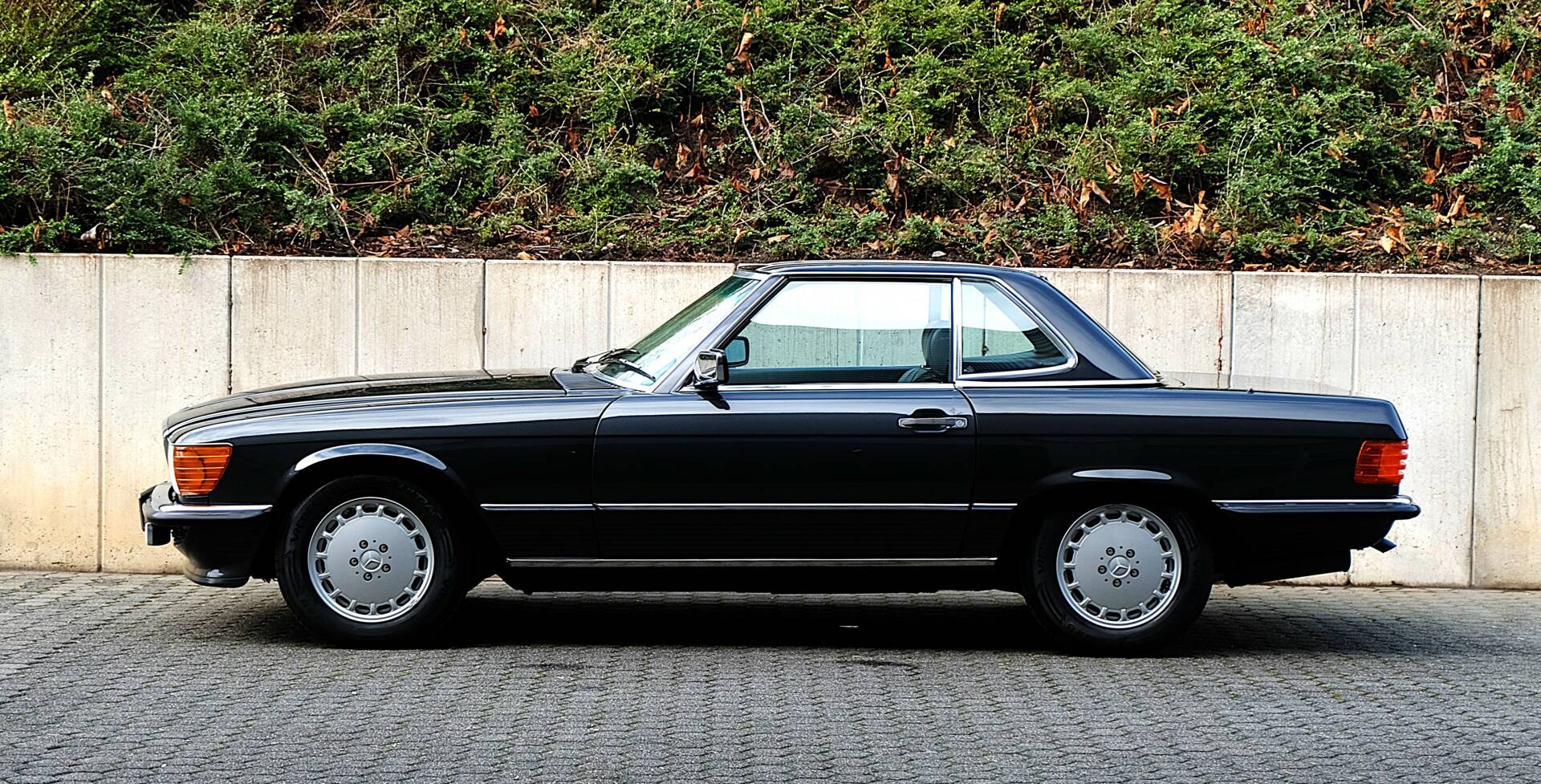 Gerade eingetroffen. Ein schöner Mercedes R107 mit einem 3,0 l Reihensechszylindermotor und 180 PS ( Abgasbereinigt ). Der Wage ist ein deutsches Farzeug und ist sehr gut erhalten. Der 300 SL stellt die letzte Evolutionsstufe der Baureihe 107 dar und hatte alle Modellpflegemaßnahmen erfahren. Er hat einen seidenweich laufenden, kräftigen Motor und ein sicheres und komfortables Fahrwerk. Er ist rost- und unfallfrei. Wir werden vor Auslieferung noch einen großen Kundendienst machen . Er hat schon neue Reifen und eine neue Batterie bekommen. So sollte er seinem neuen Besitzer wieder viel Freude bereiten. Die klassische Farbkombinatio mit der Lackierung in 199 Blauschwarzmetallic und dem grauen Leder bringt die schönen Linien der Karosse mit dem sehr gut erhaltenem Chrom gut zur Geltung. Ein neuwertiges dunkelrotes Verdeck rundet den guten Gesamteindruck ab.