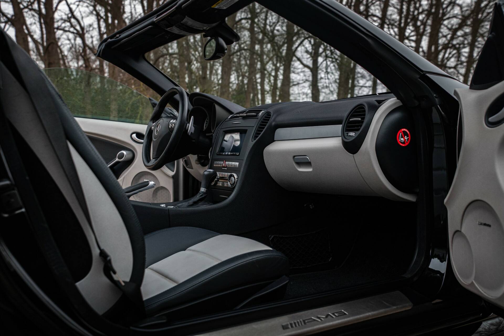 Deze ogenschijnlijk volledig origineel uitziende SLK 55 AMG betreft een in juni 2007 nieuw geleverde auto, uitgevoerd in fraai diepzwart metallic, afgezet tegen een duo-tone lichtgrijs/zwart lederen interieur.