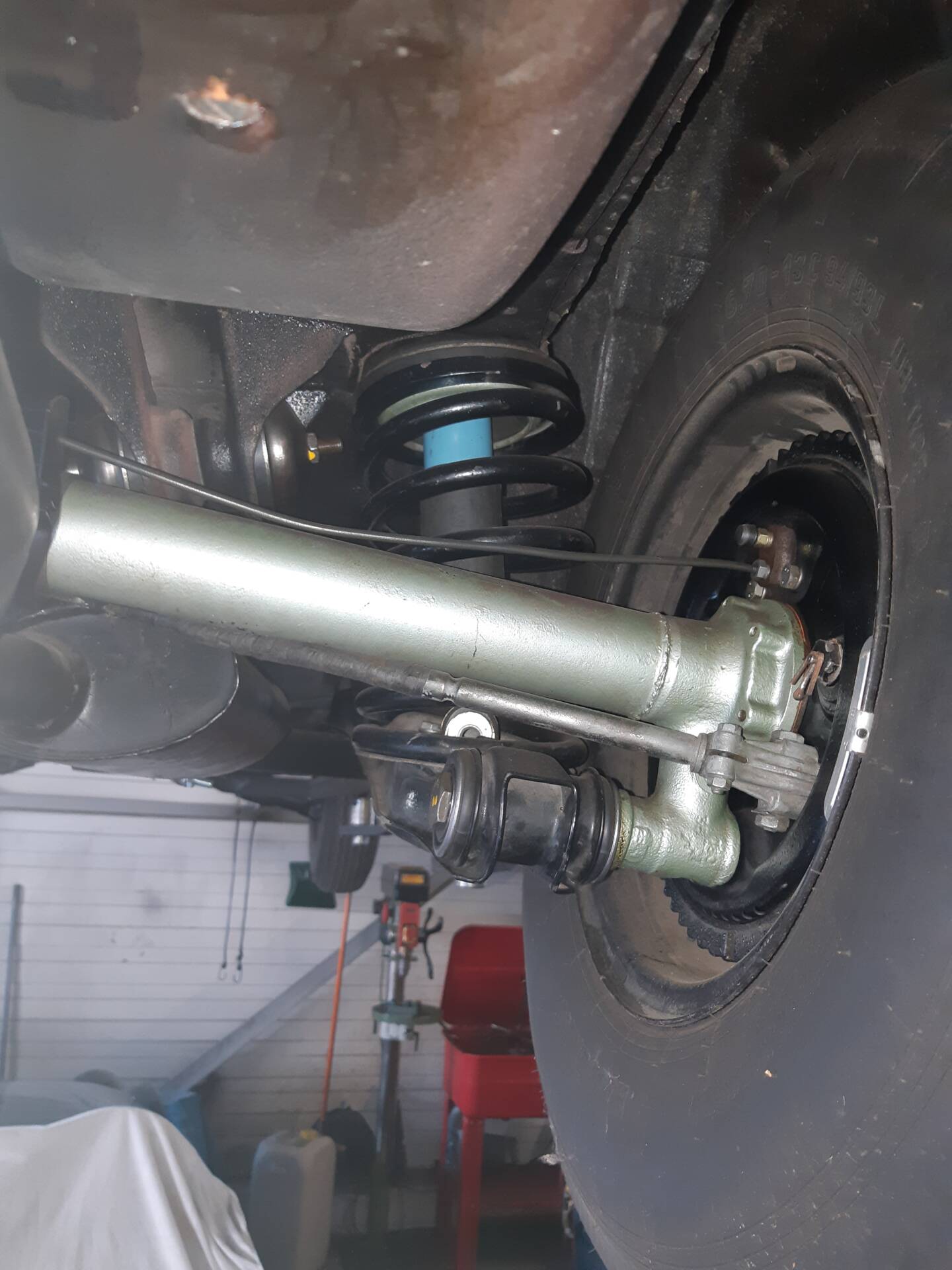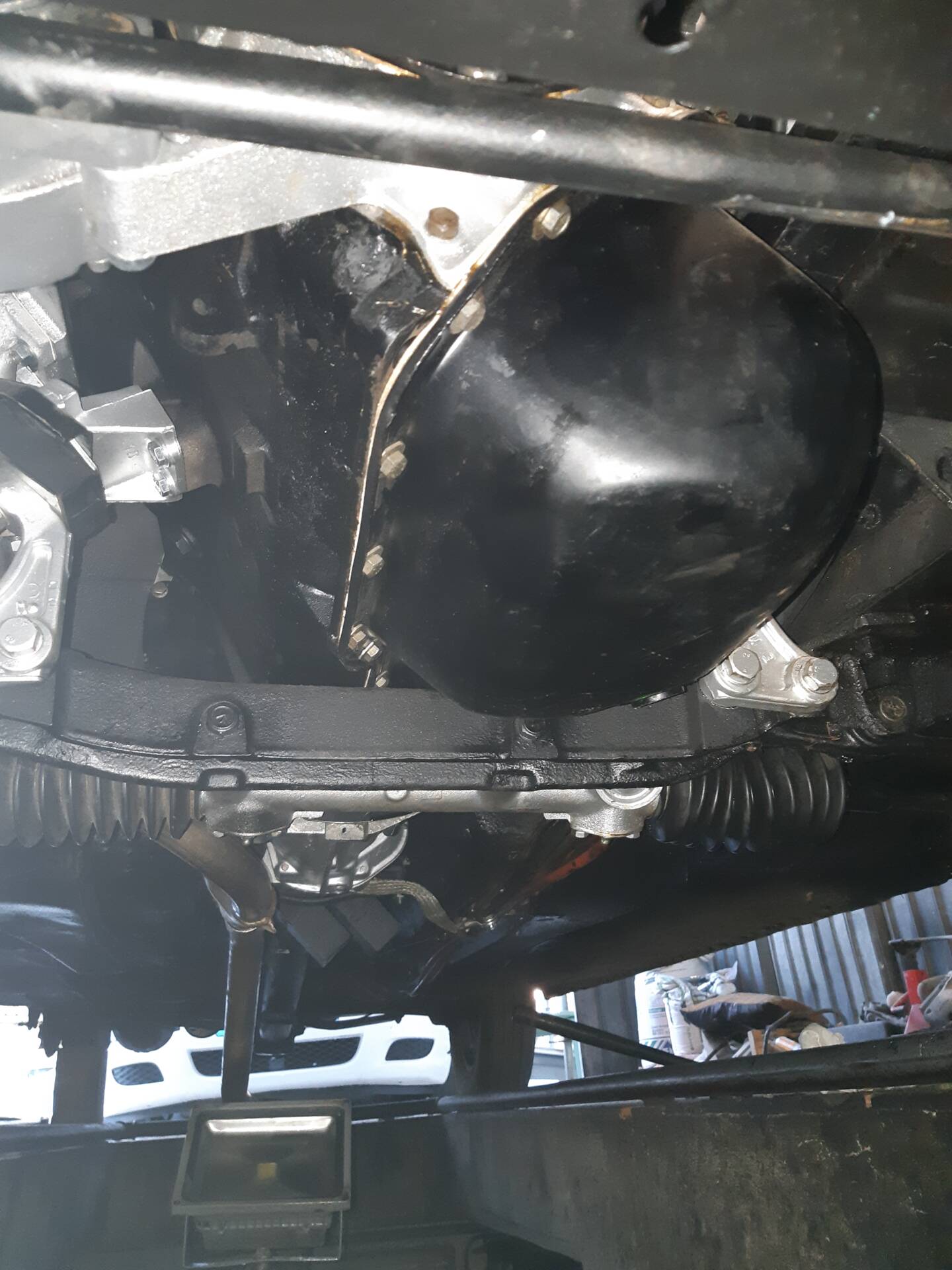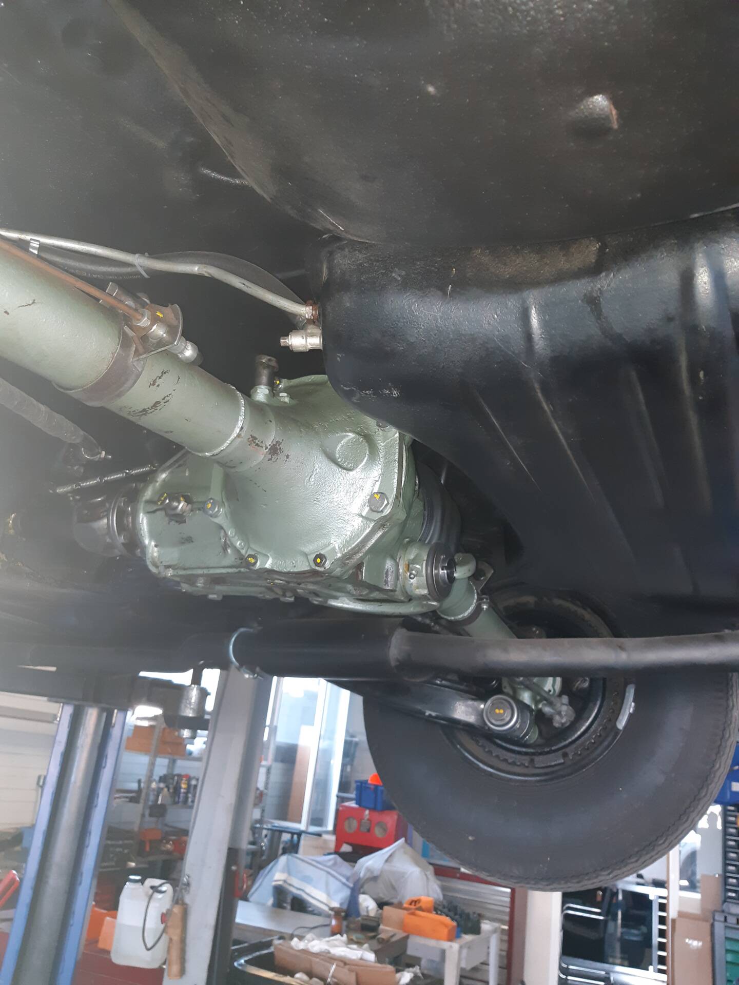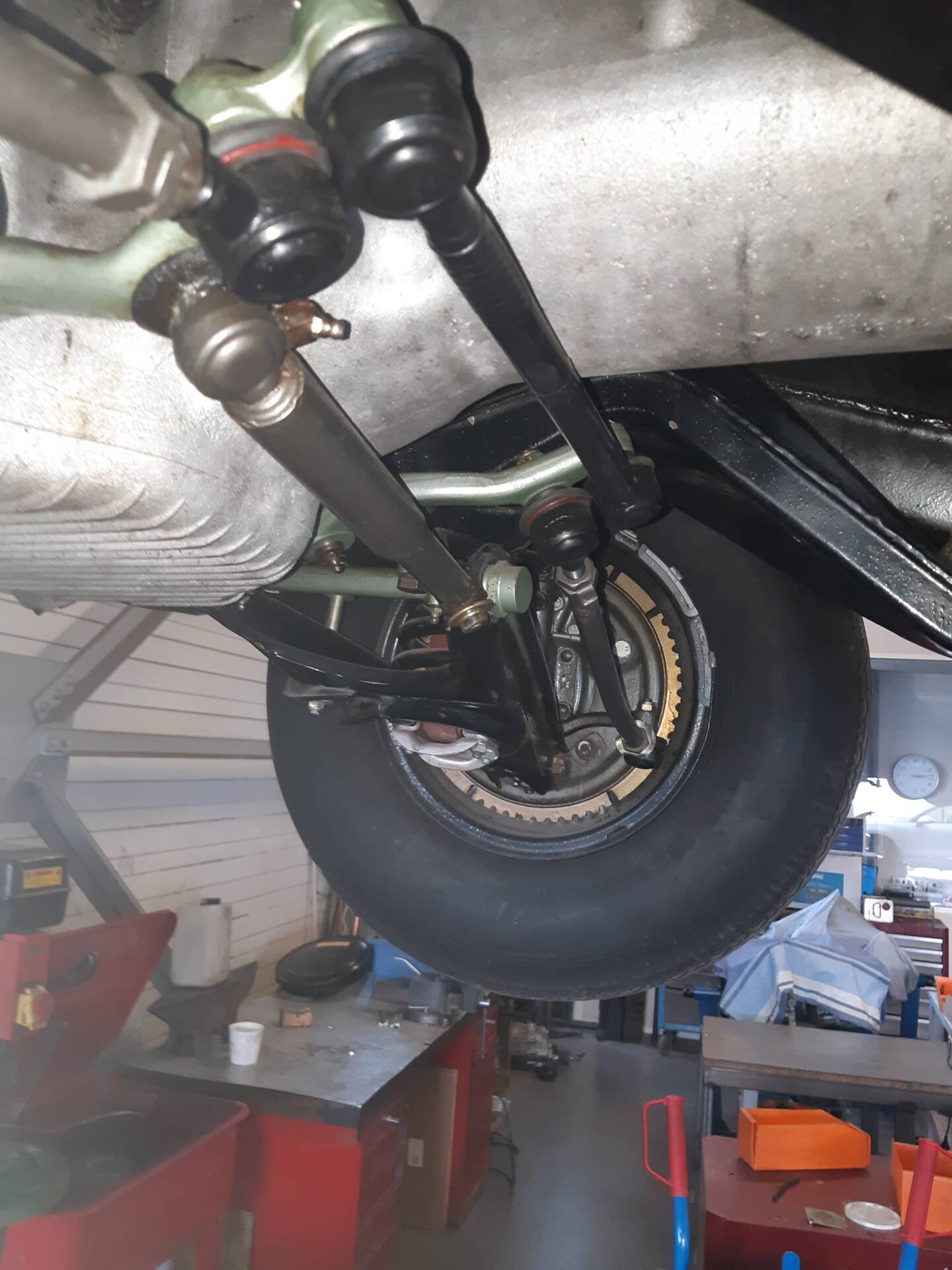 La mise sur le pont confirme une caisse saine, sans trace d'accident visible ni de corrosion structurelle apparente.