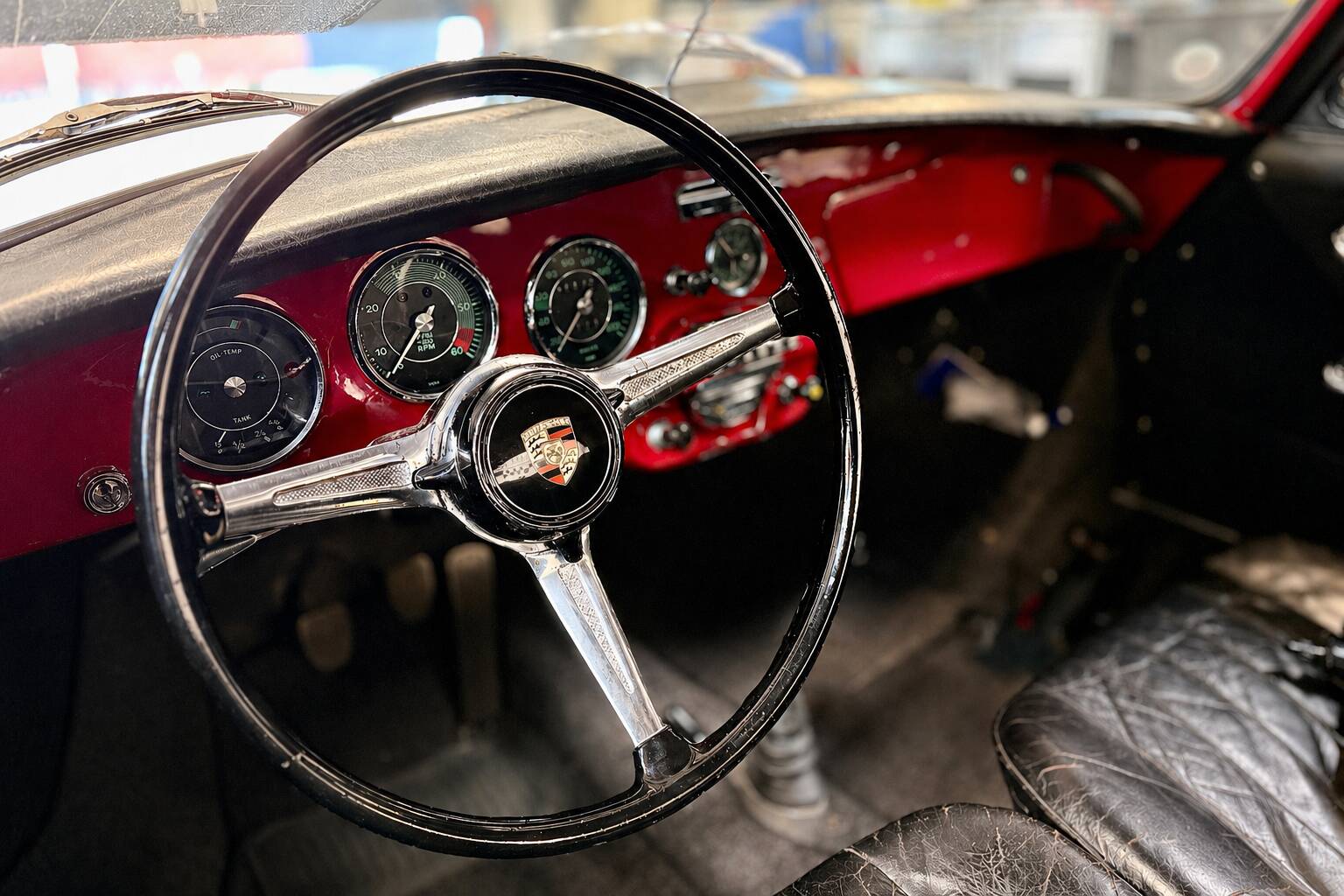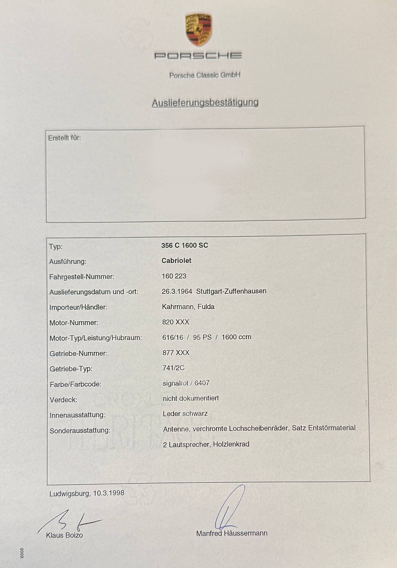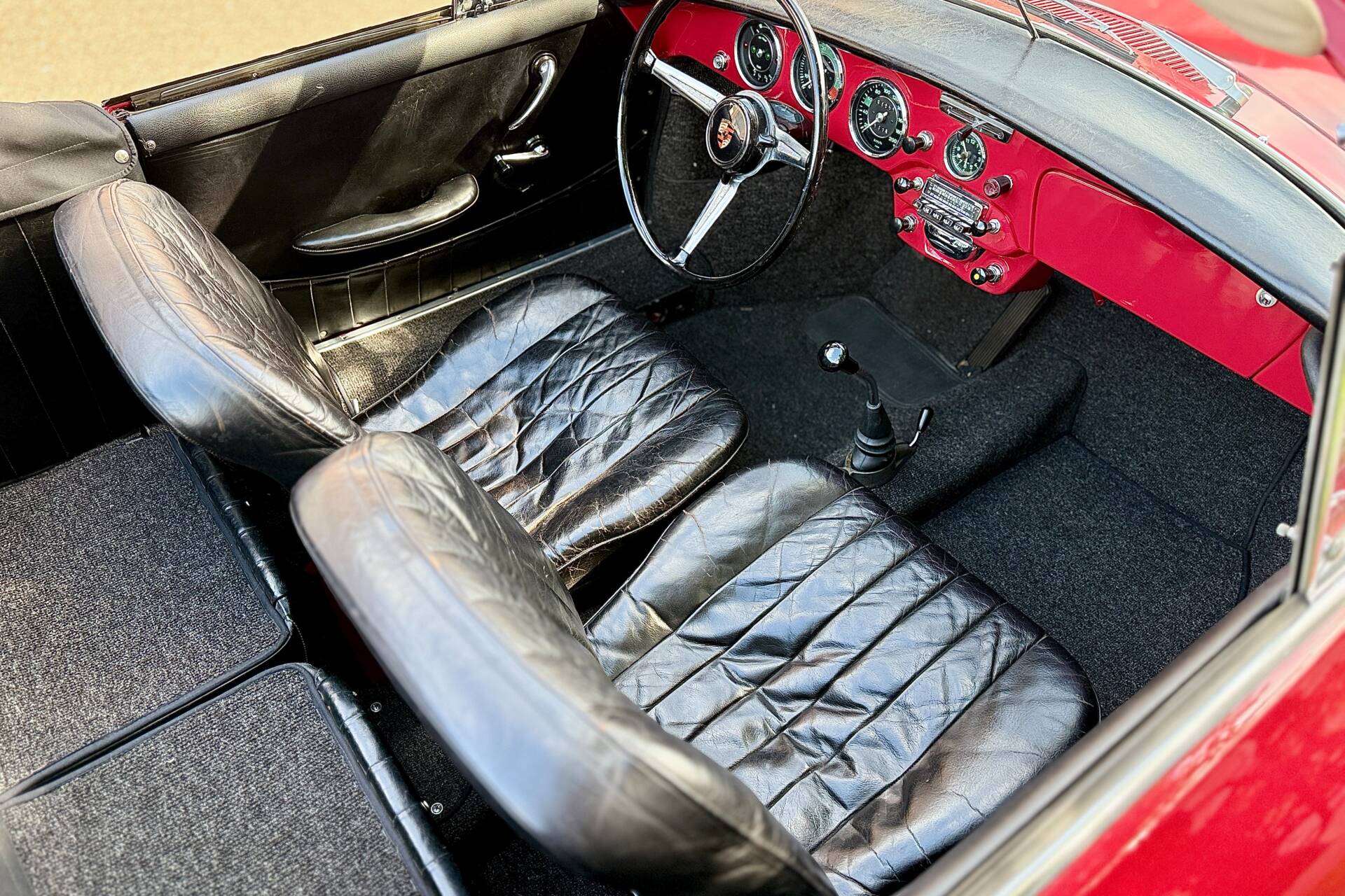 Dieser Porsche 356 ist seit 1998 im Familienbesitz. Zahlreiche Dokumente erzählen von der Lebensgeschichte der letzten 28 Jahre. Die Auslieferungsbestätigung der Porsche Werke bestätigt den 356er als 1964 ausgeliefertes Cabriolet 1600 SC mit 95 PS und 1600 ccm Hubraum. Heute befindet sich ein etwas späterer Motor aus einem Porsche 912 im Fahrzeug. Optisch steht der Porsche schön dar und auch bei einem Blick unter das Auto beunruhigt uns die Substanz nicht. Der Innenraum ist gepflegt, die Sitze haben eine ordentliche Patina, das Verdeck ist in einem schönen Zustand.