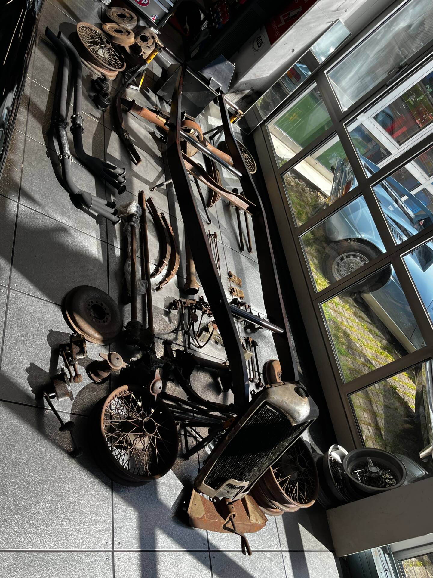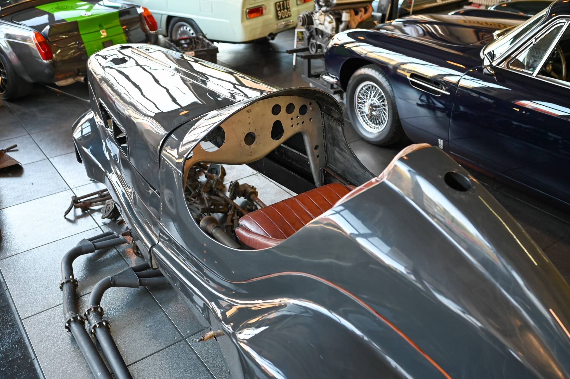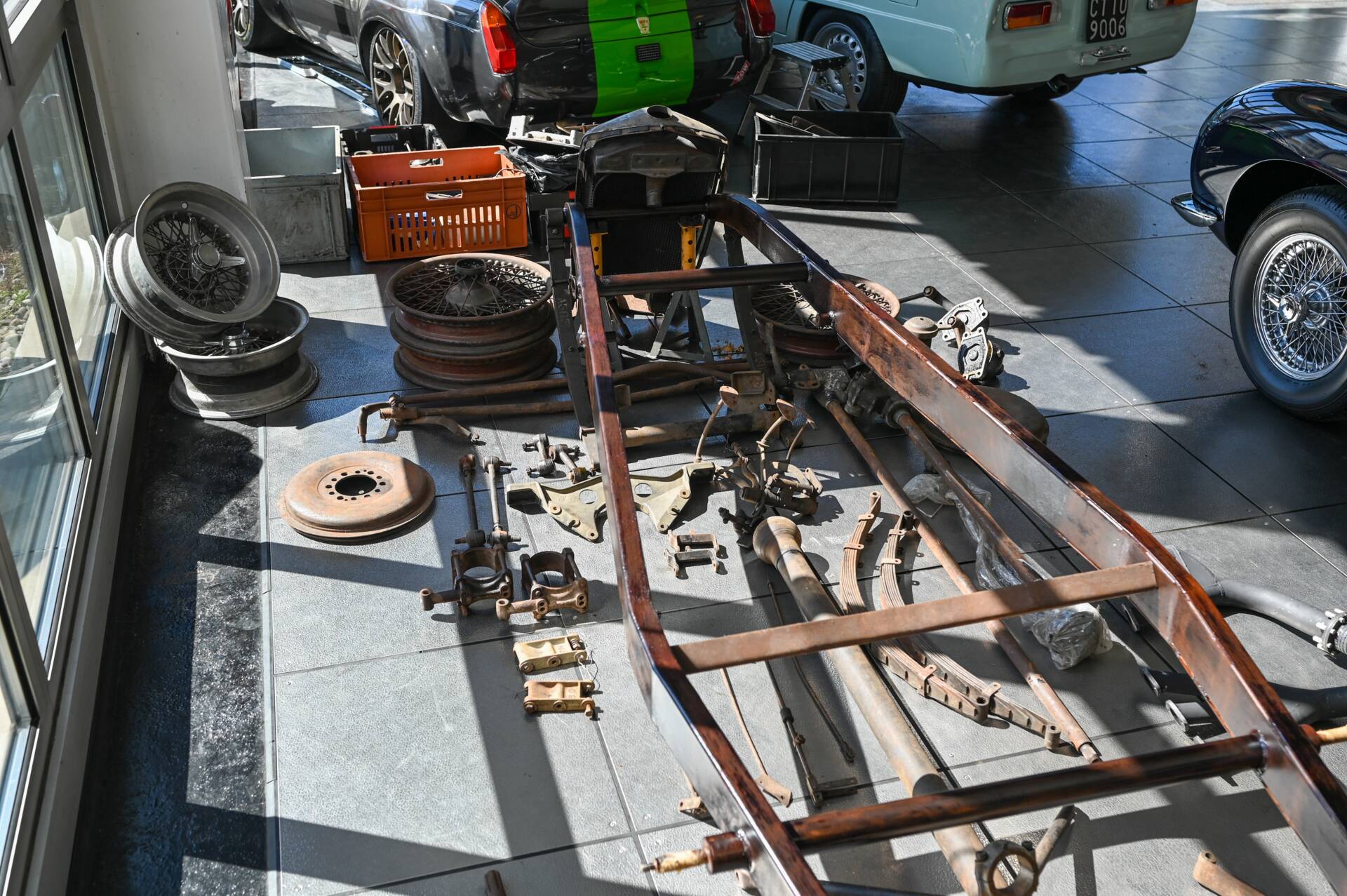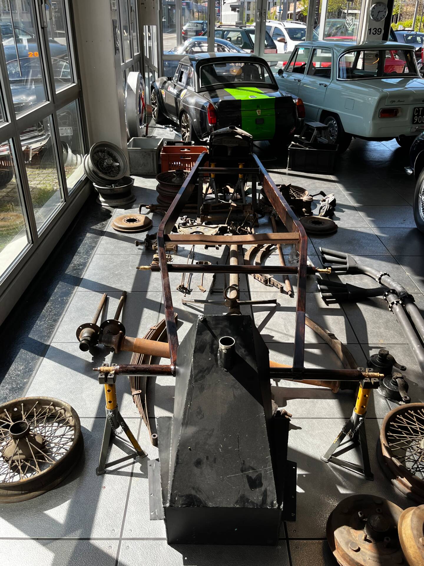 Riley Special Projekt zum Fertigstellen. Rohes Chassis von 1937 mit diversen Teilen und 2. 5 „Big Four“ Motor inklusive korrektem 4-Gang Getriebe. Die Aluminium Carrosserie ist komplett und wurde in der Schweiz für ca. CHF 150‘000.- angefertigt und war bereits auf einem identischen Chassis mit 2. 5 L im Einsatz (komplettes Fahrzeug auf erstem Foto). Alle Teile auf den Fotos gehören zu dem Fahrzeug, zur Komplettierung fehlen jedoch Komponenten wie Vorderachse, Auspuff, Lenkrad oder Instrumente. Eine sehr interessante Basis für einen 1-sitzigen Vorkriegsrennwagen mit Spielraum für Individualisierungen.